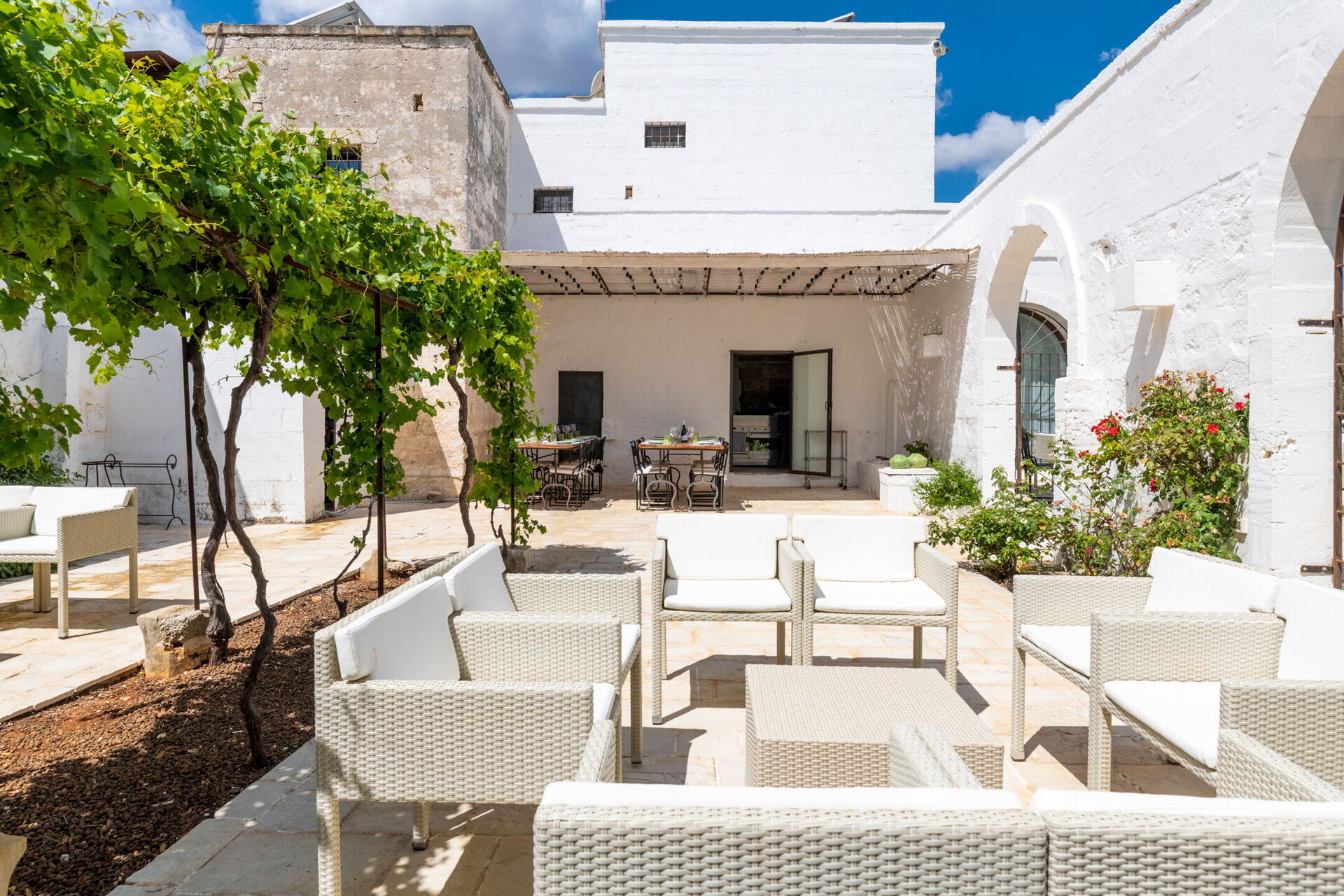 To frame this small courtyard there are several olive trees and succulent plants characteristic of Puglia, as well as numerous armchairs.