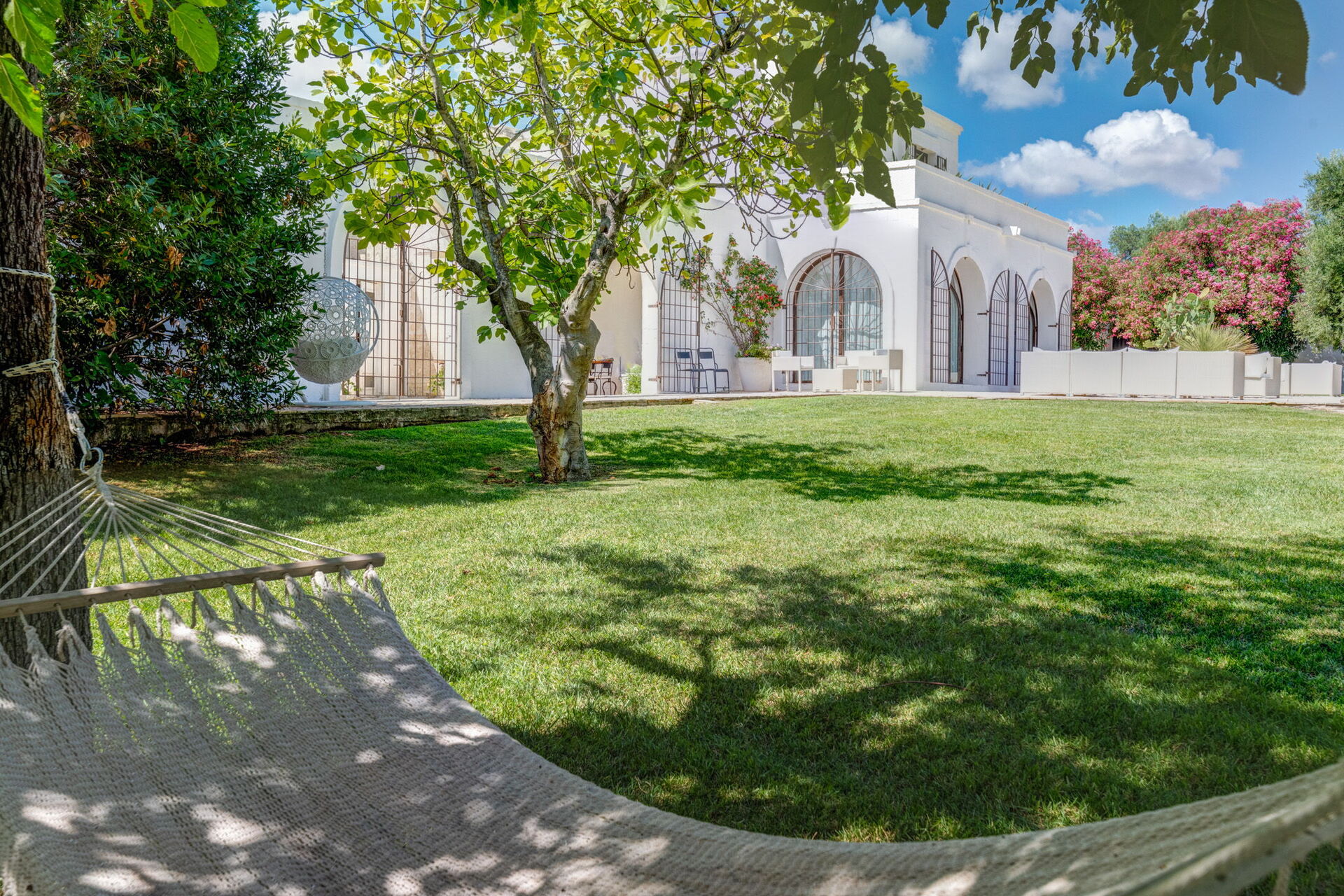 The characteristic lime white of the external walls contrasts with the green garden with lawn and olive trees making the atmosphere suggestive and magical especially at sunset.
