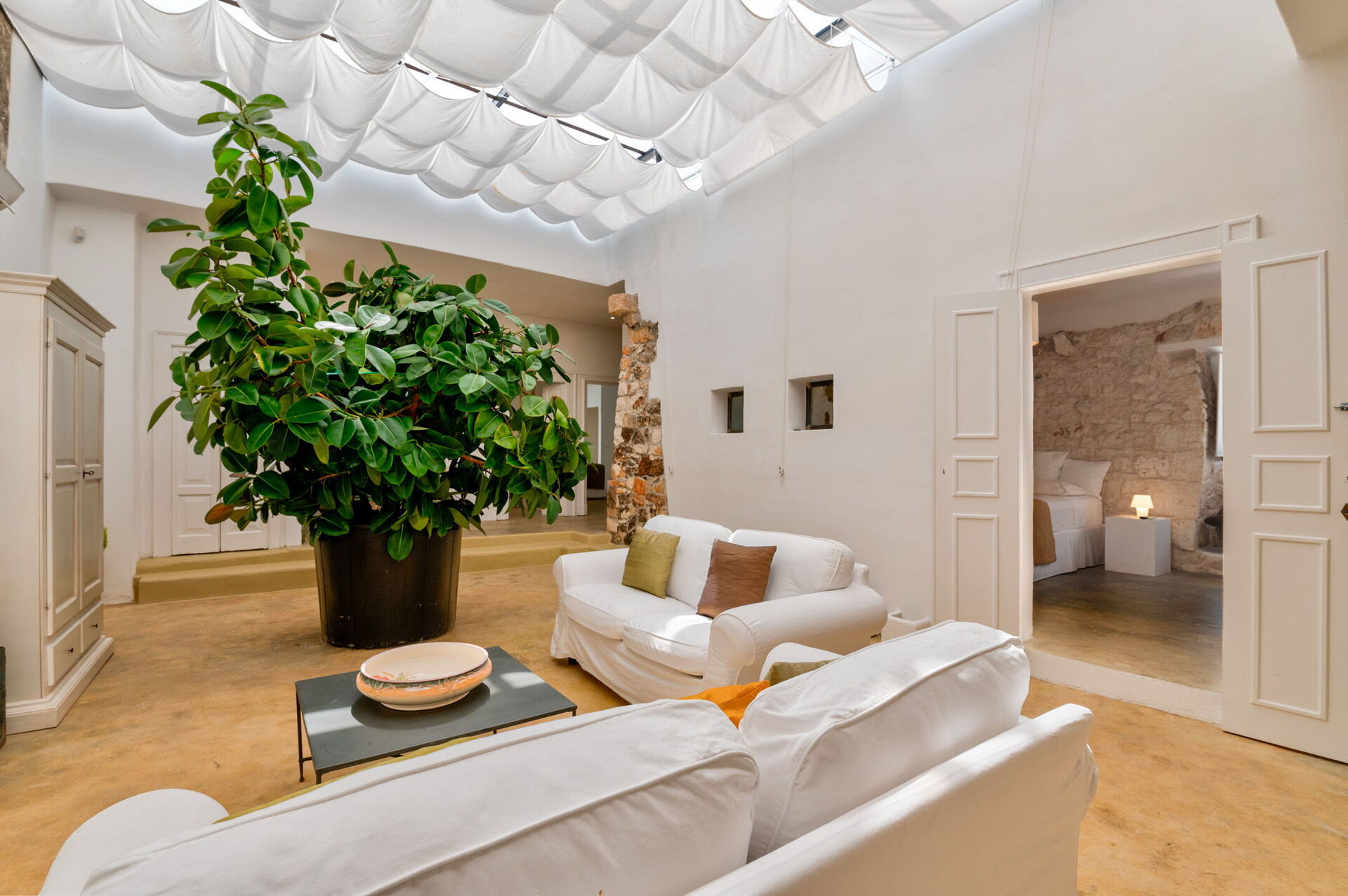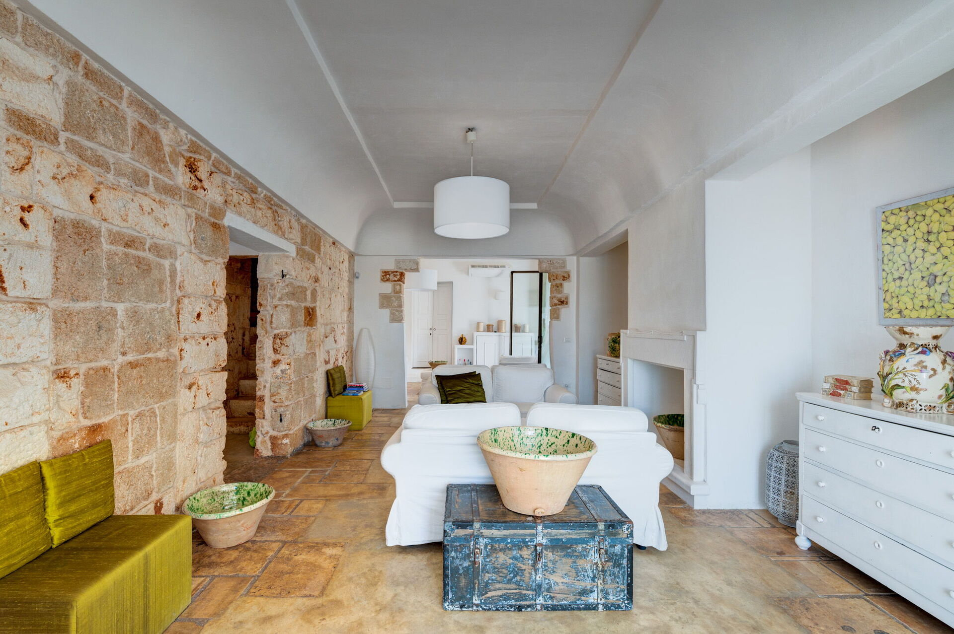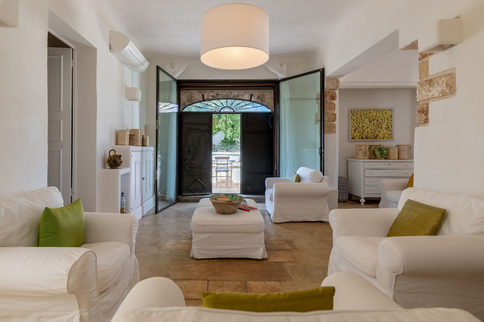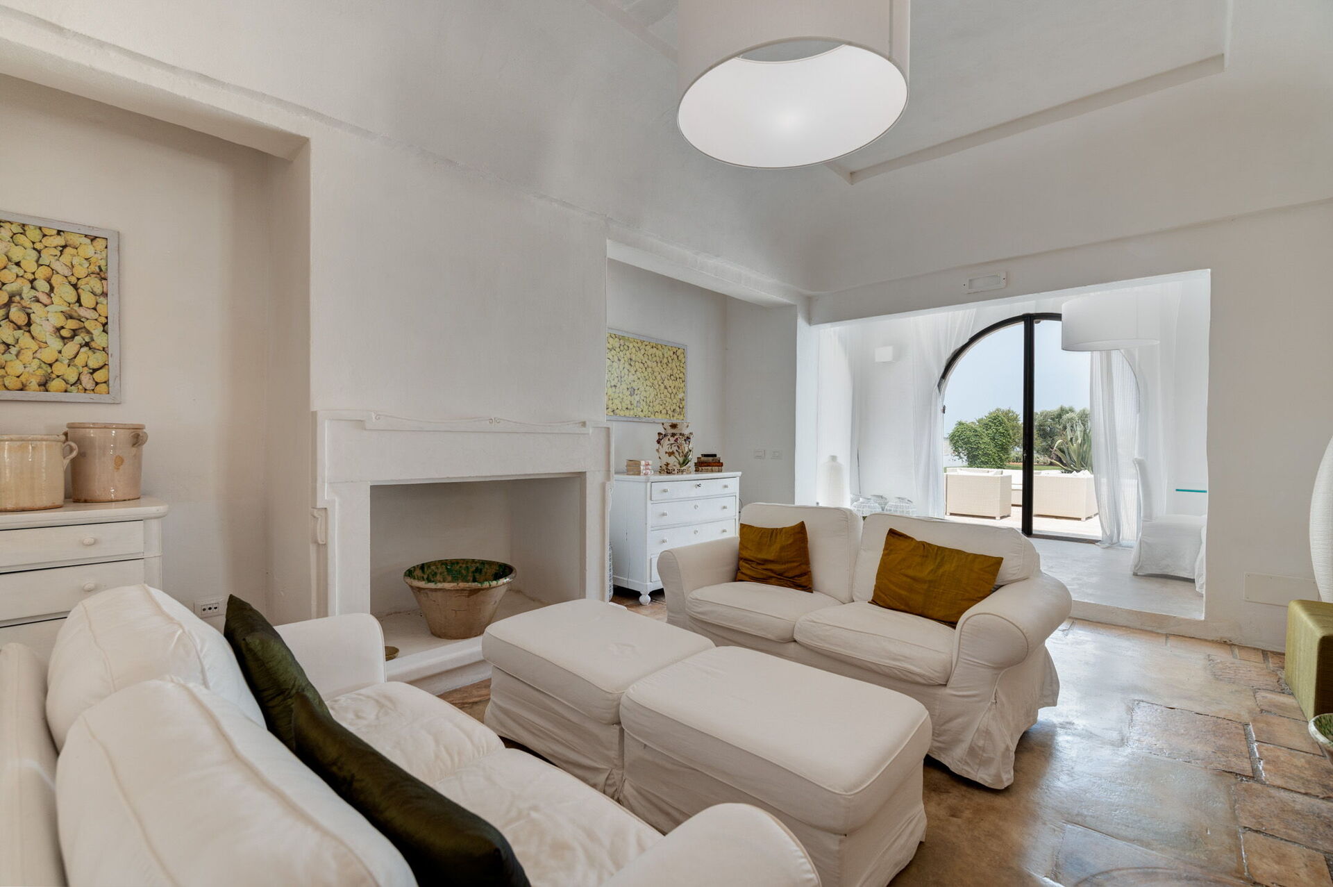 The second sleeping area is preceded by a living room with sofas and a glass pergola shaded by wonderful white drapes, from here you have access to two double bedrooms with characteristic exposed dry stone walls, as well as the further 3 double bedrooms which also have access from the outside.