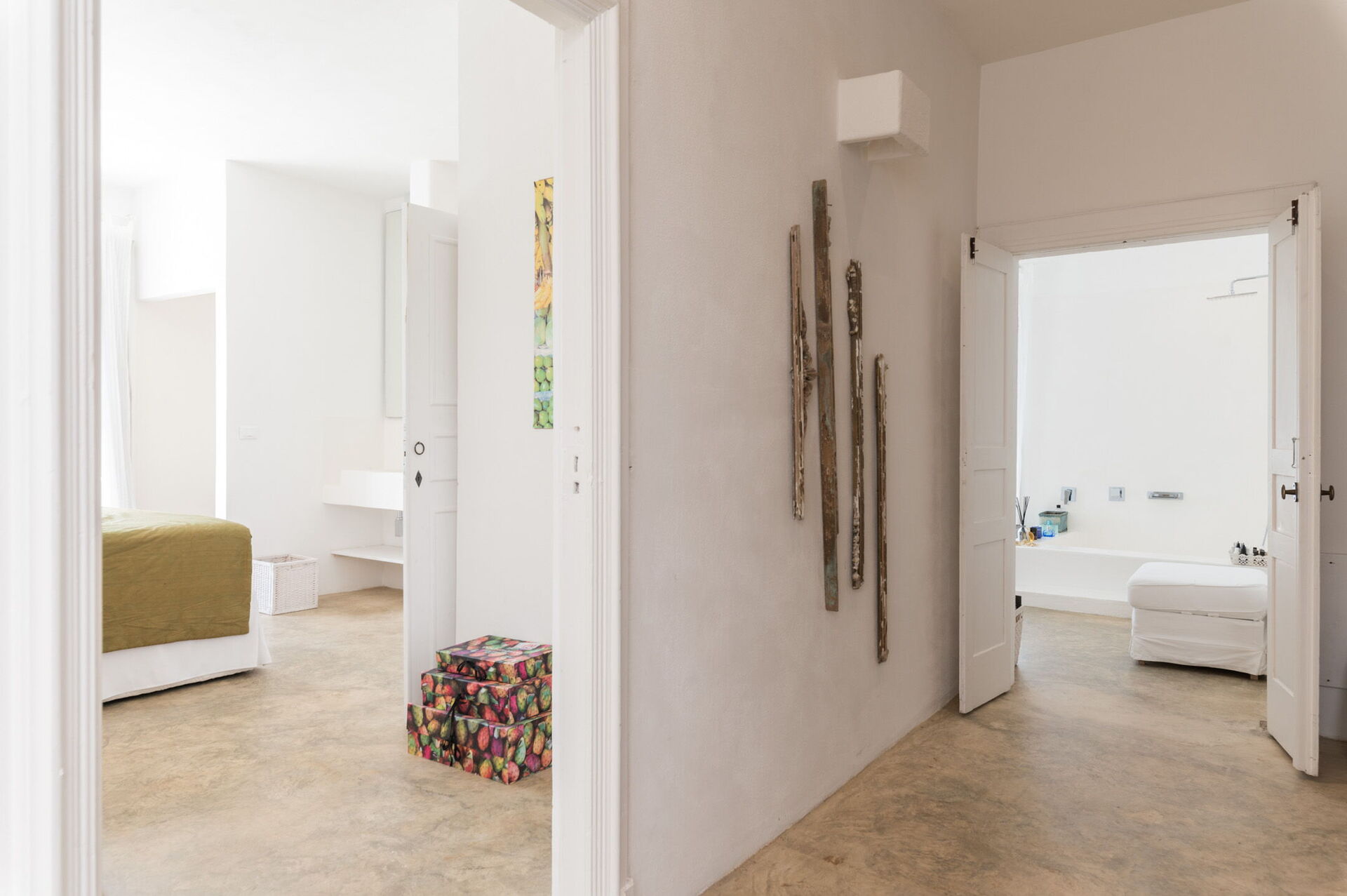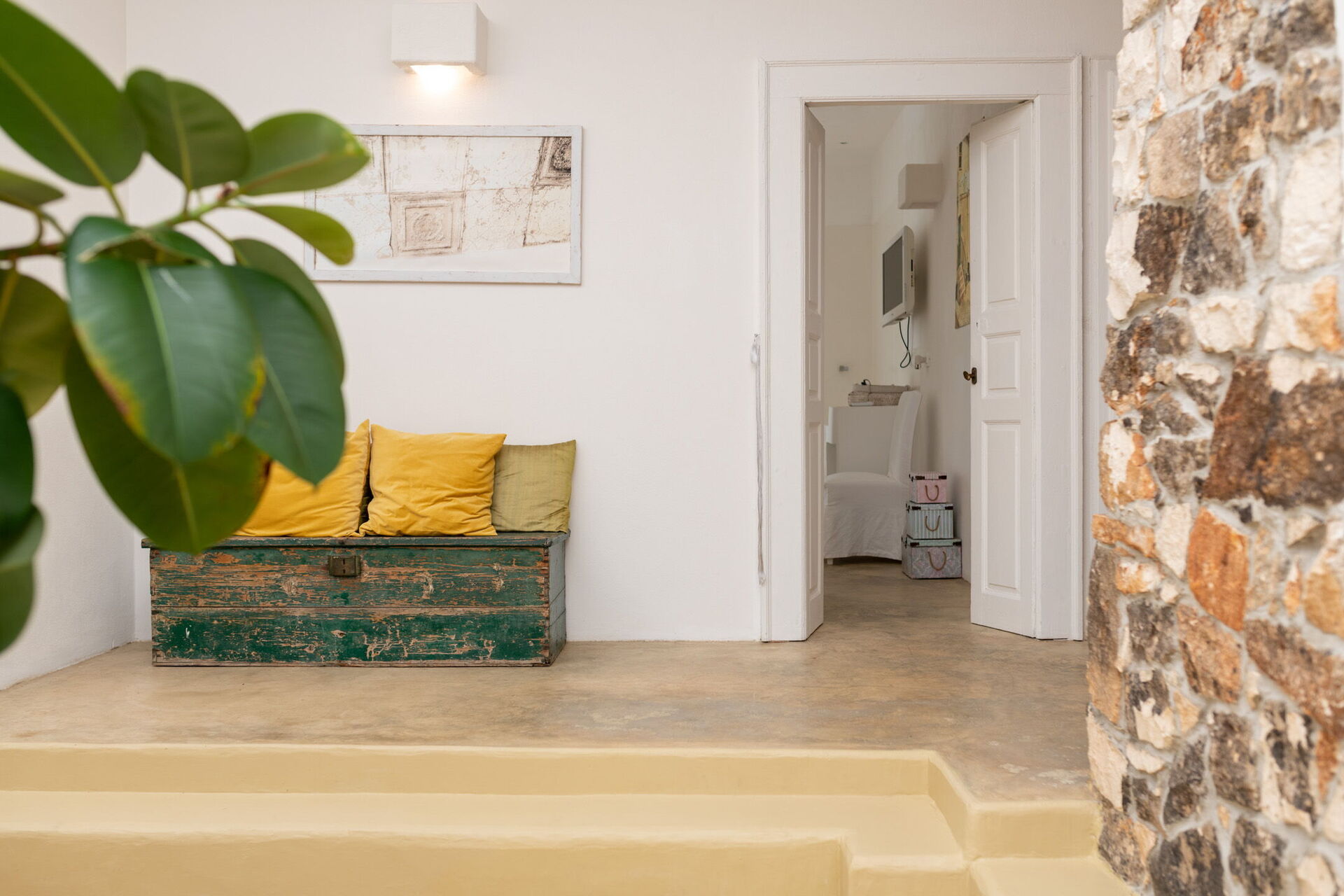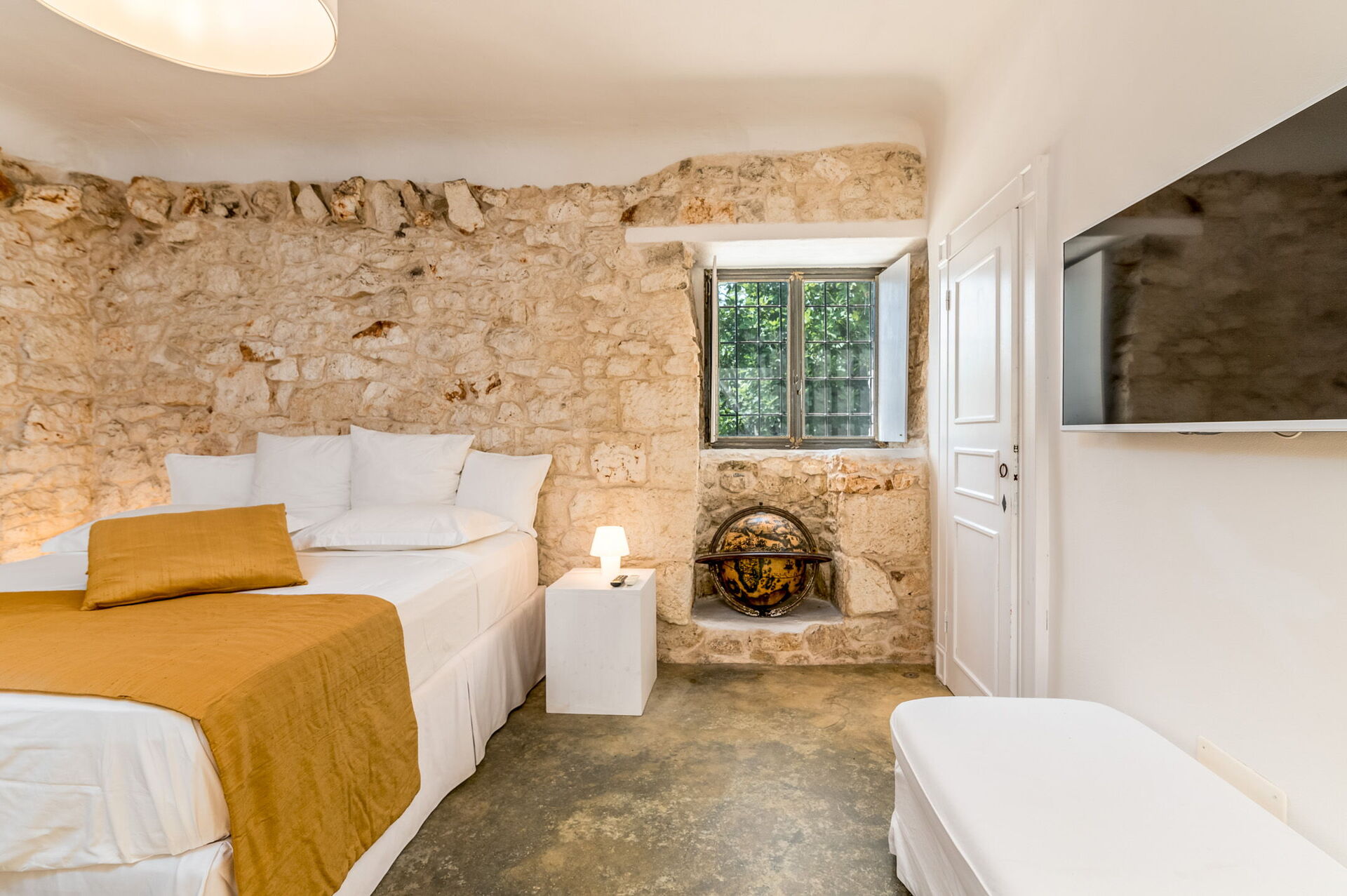 The second sleeping area is preceded by a living room with sofas and a glass pergola shaded by wonderful white drapes, from here you have access to two double bedrooms with characteristic exposed dry stone walls, as well as the further 3 double bedrooms which also have access from the outside.