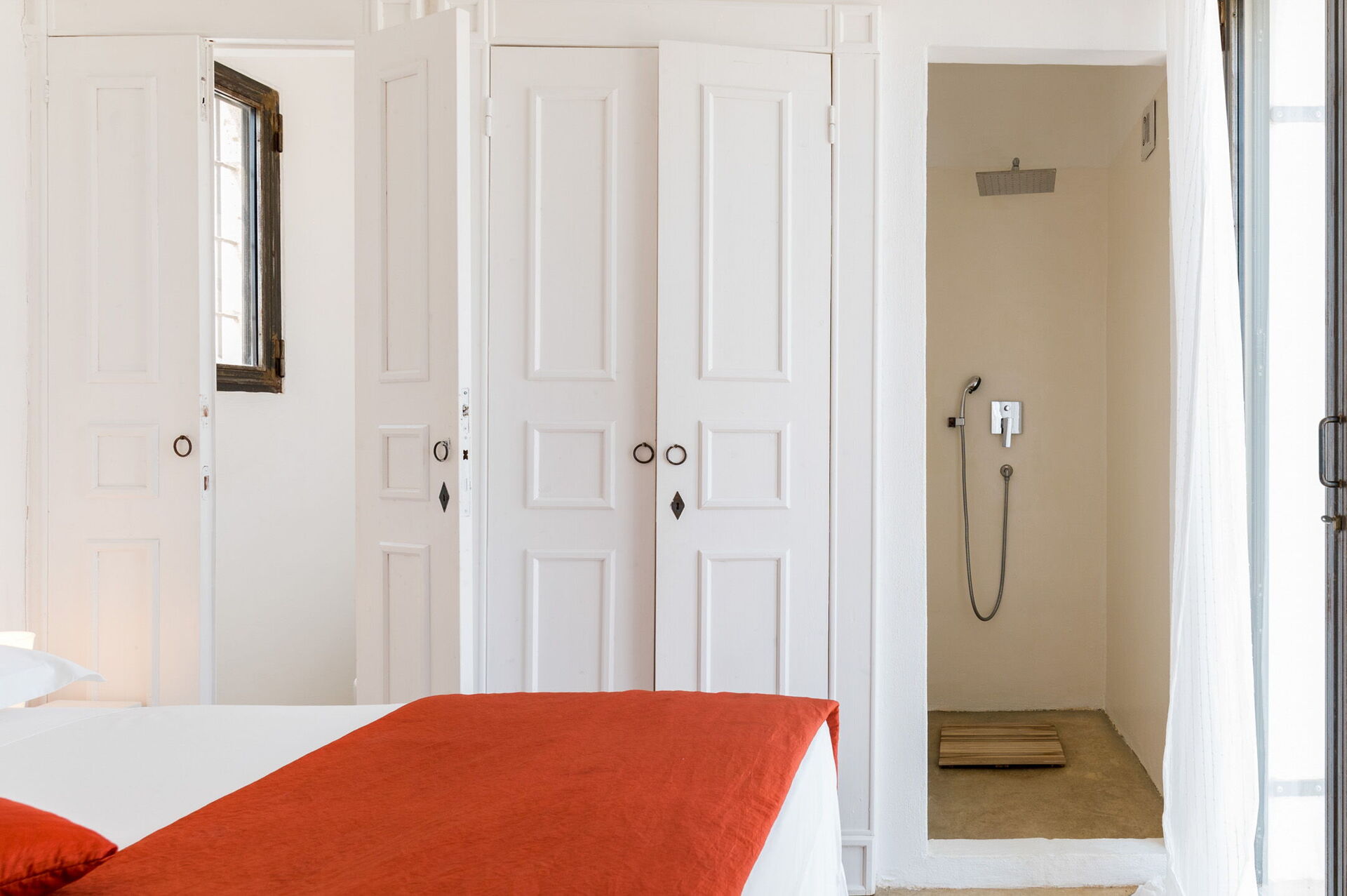 Bedroom + Ensuite Bathroom 3 : air conditioning, hairdryer, bidet, shower, basin, double bed (length: 1.8m, width: 1.6m), television, exit to the terrace, toilet, mosquito net.