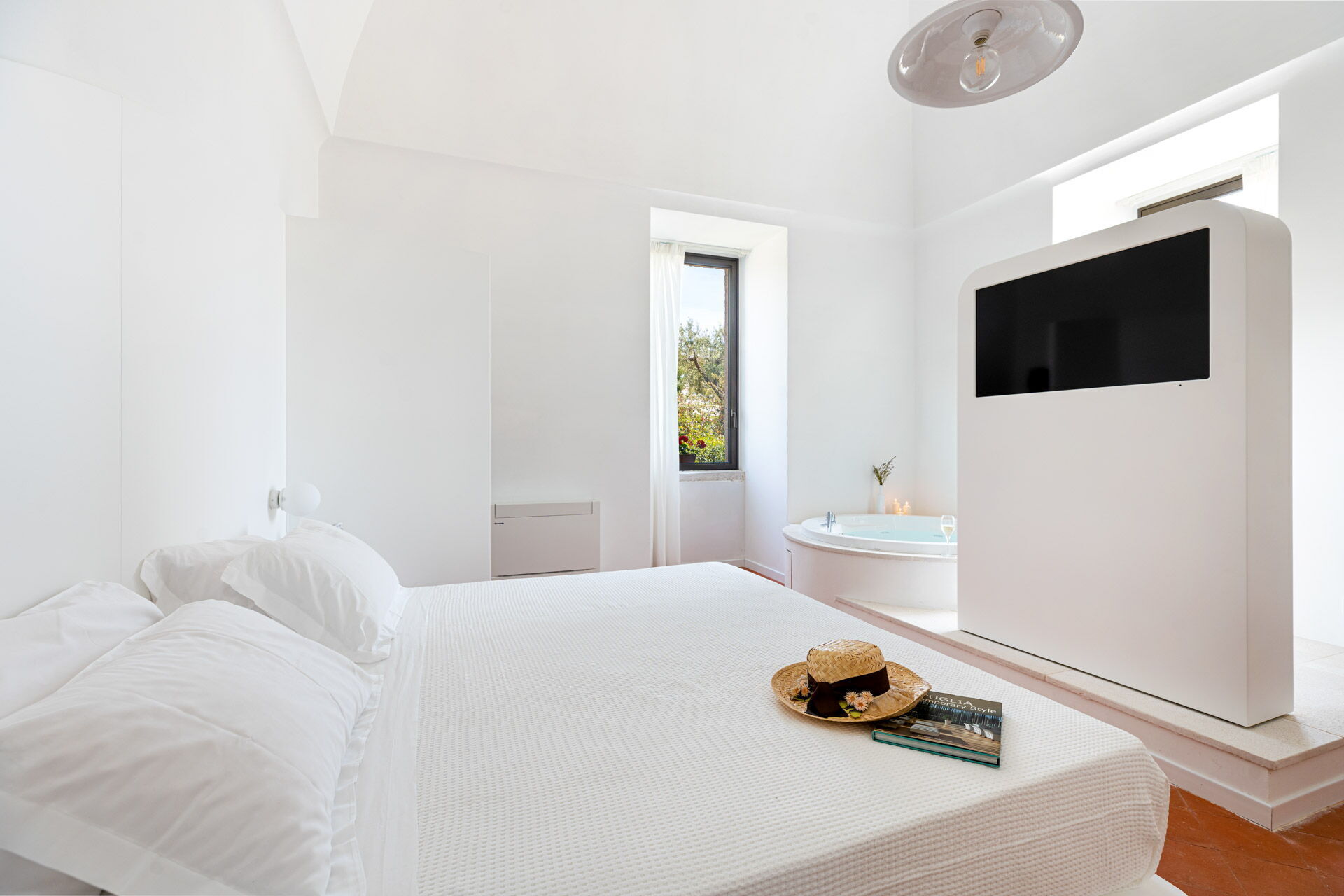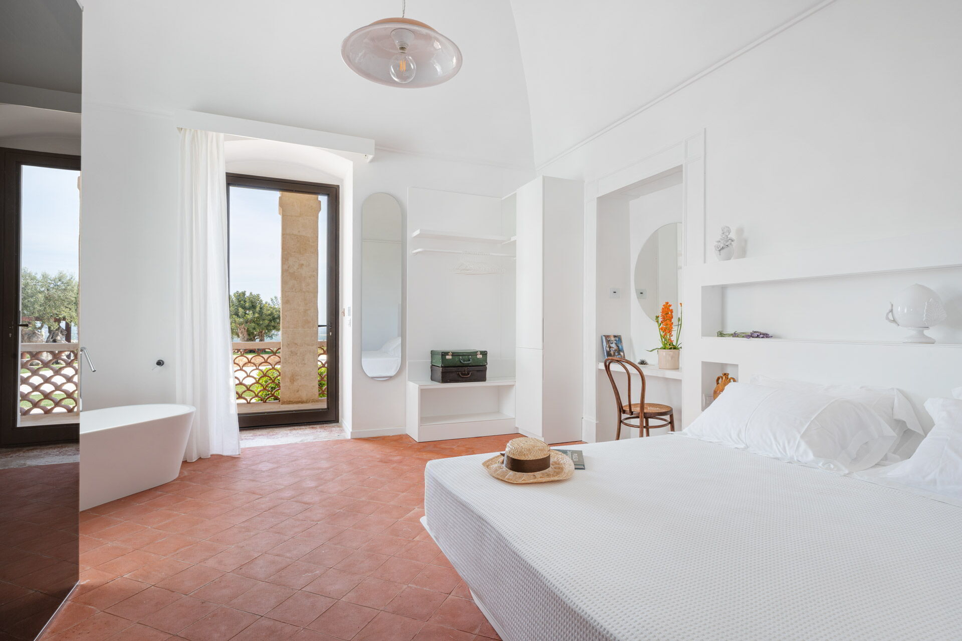 Each room is designed to offer a unique and unforgettable experience. Details play a fundamental role in creating an atmosphere of refined elegance. The bright shades of tuff, contrasting with the pure white of the furniture and walls, create a harmonious contrast that welcomes guests in a feeling of calm and serenity.