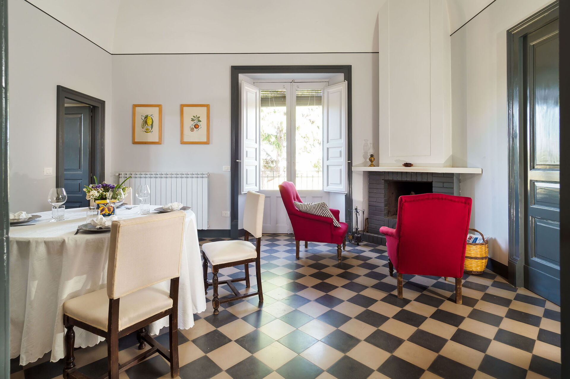Wohnzimmer: zwei Sofas (Personen: 6), Kamin, Esstisch (Personen: 6), WiFi Internet, Internet, Klimaanlage, TV, Ausgang auf den Garten.