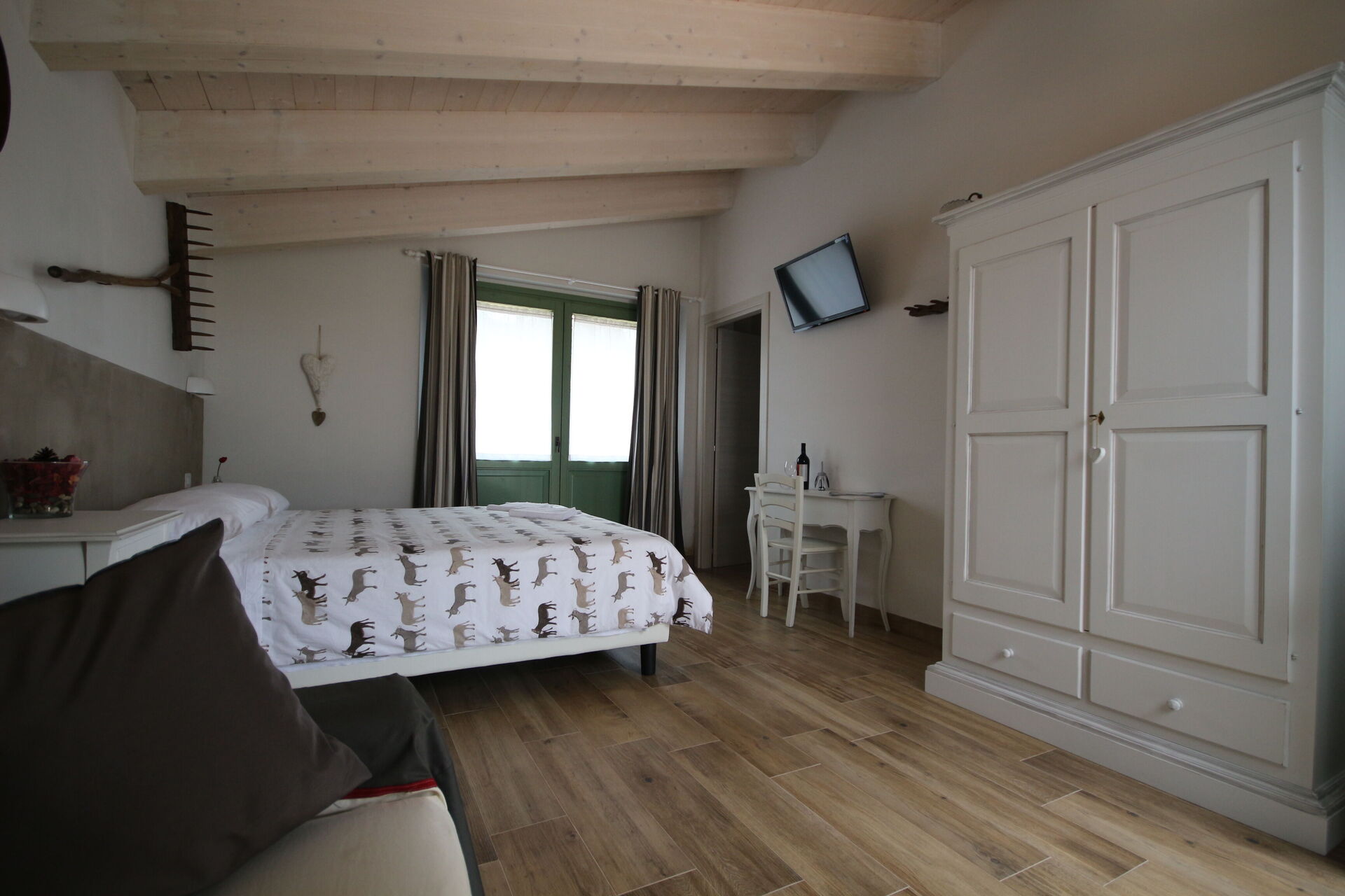Schlafzimmer mit Bad 4: Doppelbett, Etagenbett, WiFi Internet, Klimaanlage, TV, Schreibtisch, Waschbecken, WC, Bidet, Dusche, Fön.