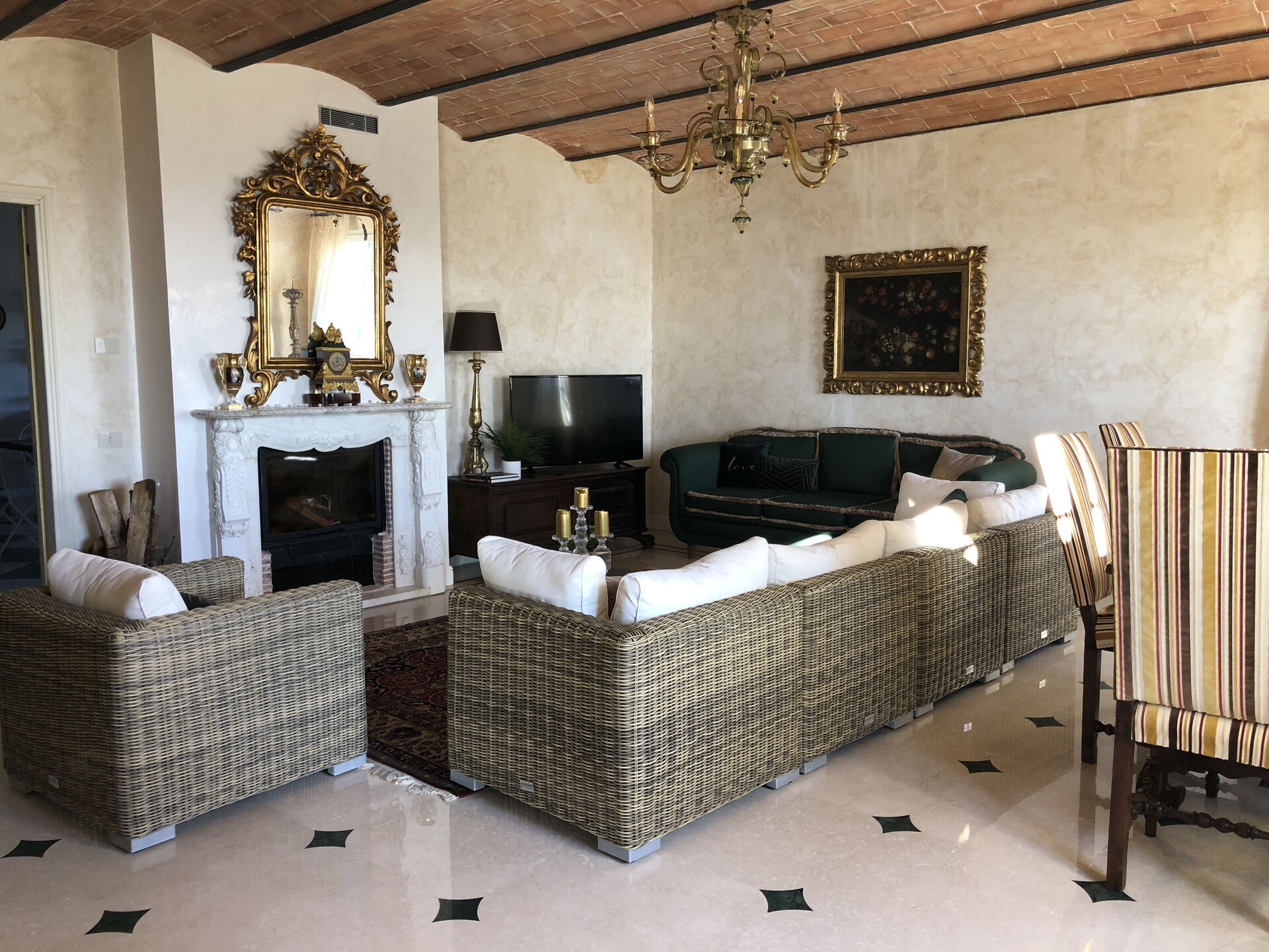 Wohnzimmer (50 m2): zwei Sofas, Kamin, WiFi Internet, Klimaanlage, Satelliten-TV, Fliegengitter, Stereoanlage, Ausgang auf den Garten.
