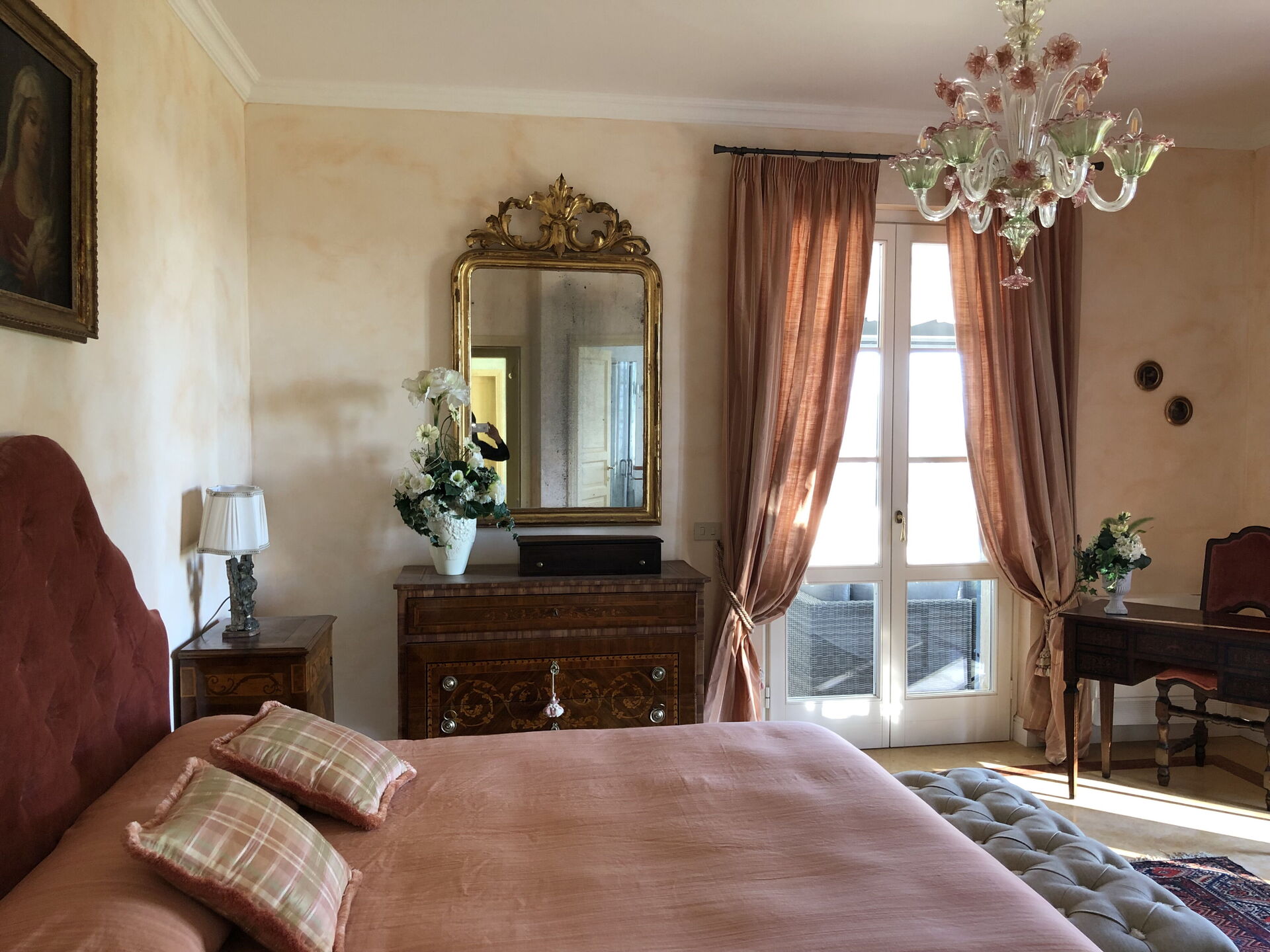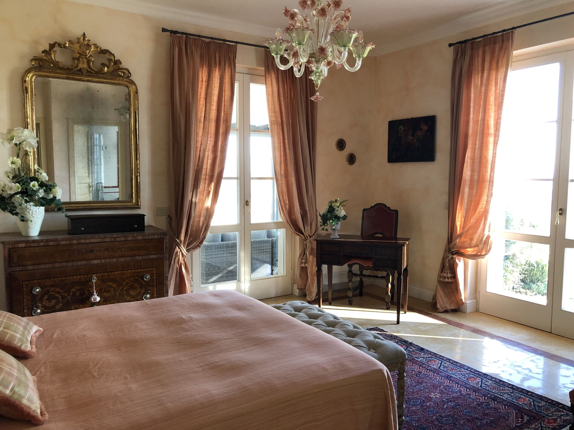 Schlafzimmer mit Bad 1: Doppelbett (Breite: 1.6m, Länge: 2m), WiFi Internet, Klimaanlage, Fliegengitter, Sessel, Schreibtisch, WC, Bidet, Dusche, Fön, Ausgang auf den Balkon.