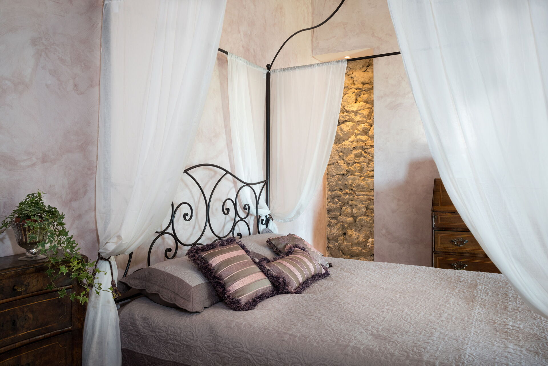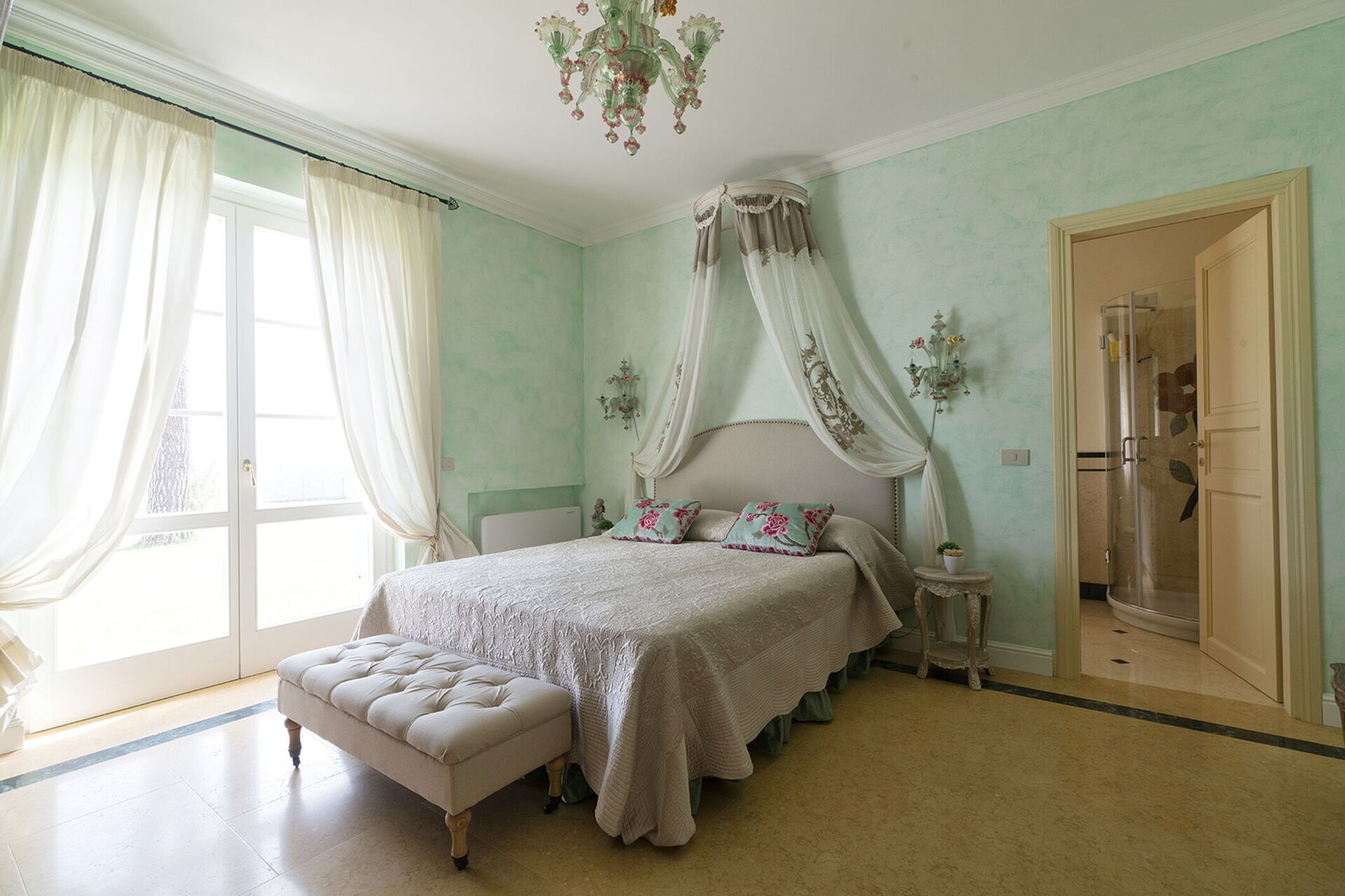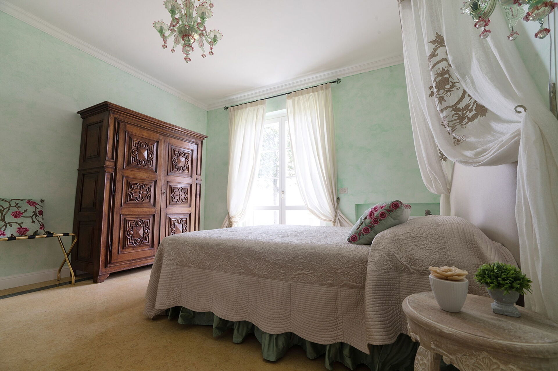 Schlafzimmer mit Bad 1: Doppelbett (Breite: 1.6m, Länge: 2m), WiFi Internet, Klimaanlage, Schreibtisch, Waschbecken, WC, Bidet, Dusche, Fön, Ausgang auf den Garten.