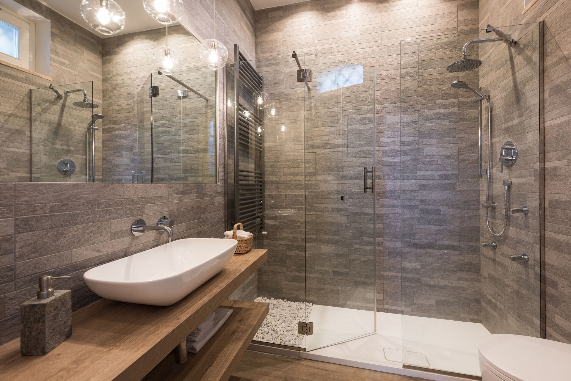 Badezimmer: Waschbecken, WC, Bidet, Dusche.
