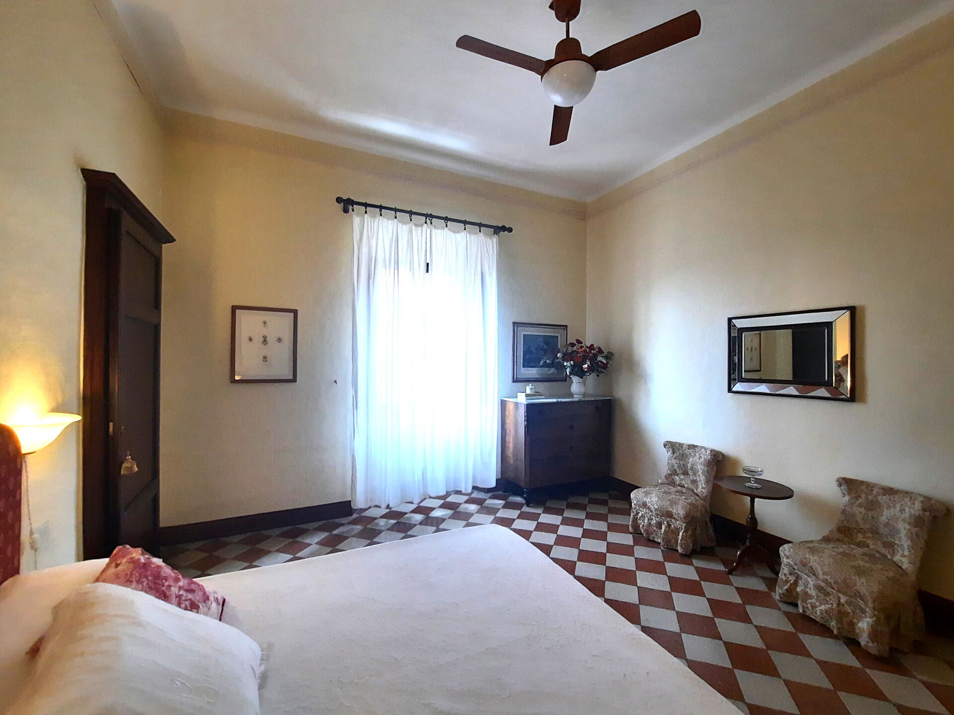 Schlafzimmer 1: zwei Einzelbetten (Breite: 0.8m, Länge: 1.9m), Internet, Klimaanlage, Deckenventilator, zwei Sessel.