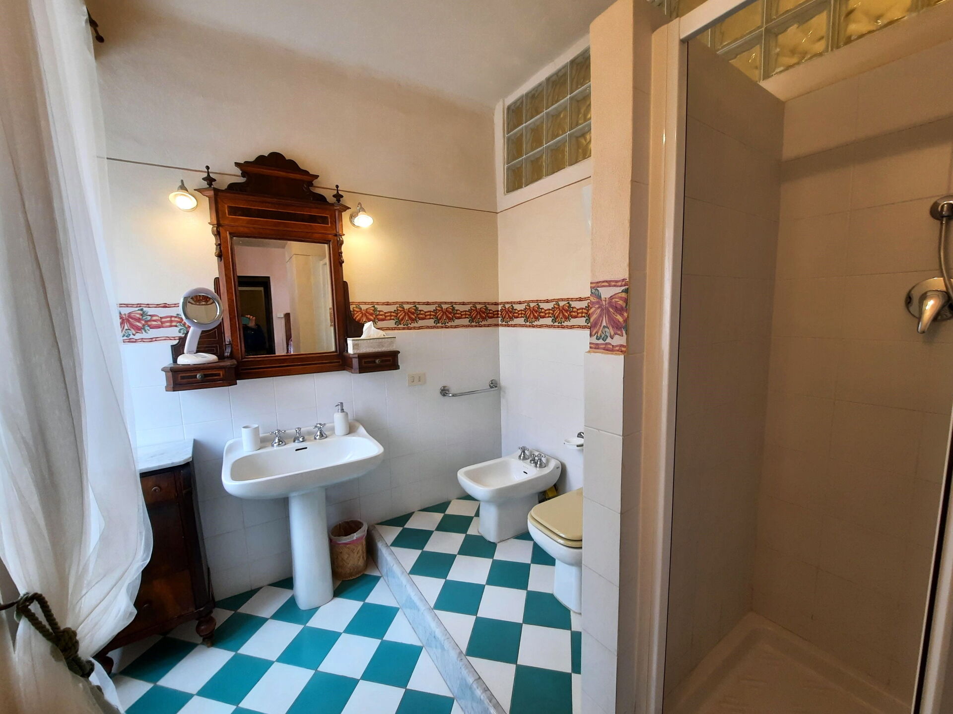 Badezimmer 1: Doppelwaschbecken, WC, Bidet, Dusche, Fön, Internet.