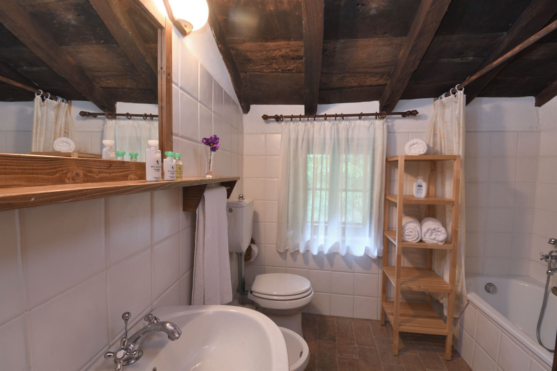 Badezimmer: Waschbecken, WC, Bidet, Badewanne.