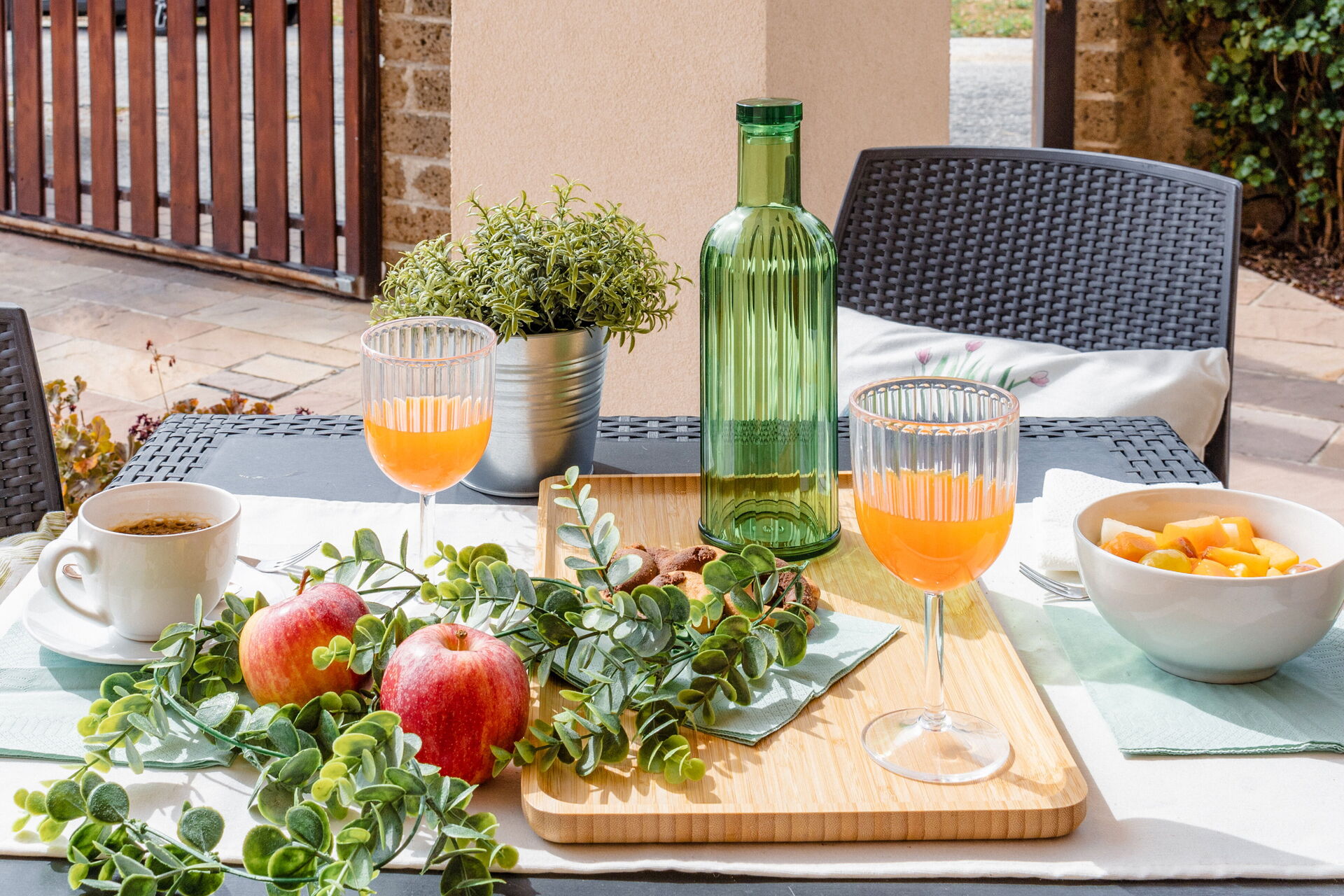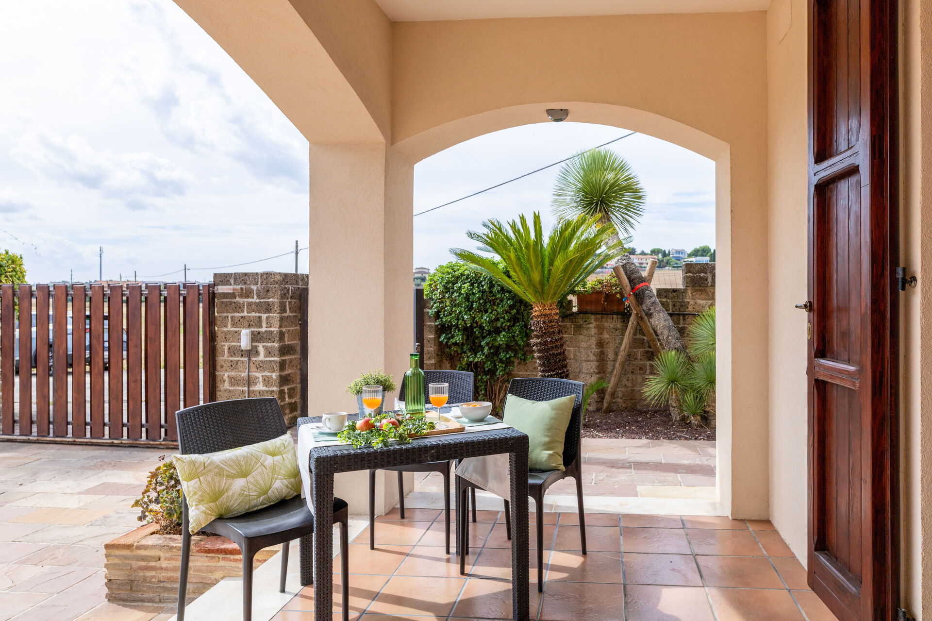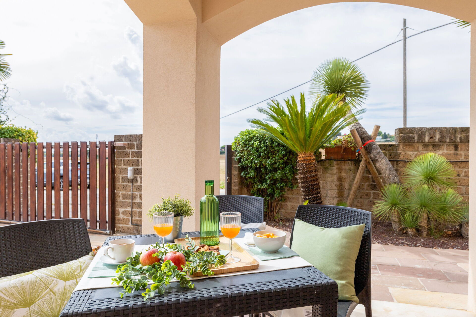 Garten: Außenbereich für das Essen im Freien, Gartenmöbel, umzäuntes Grundstück.