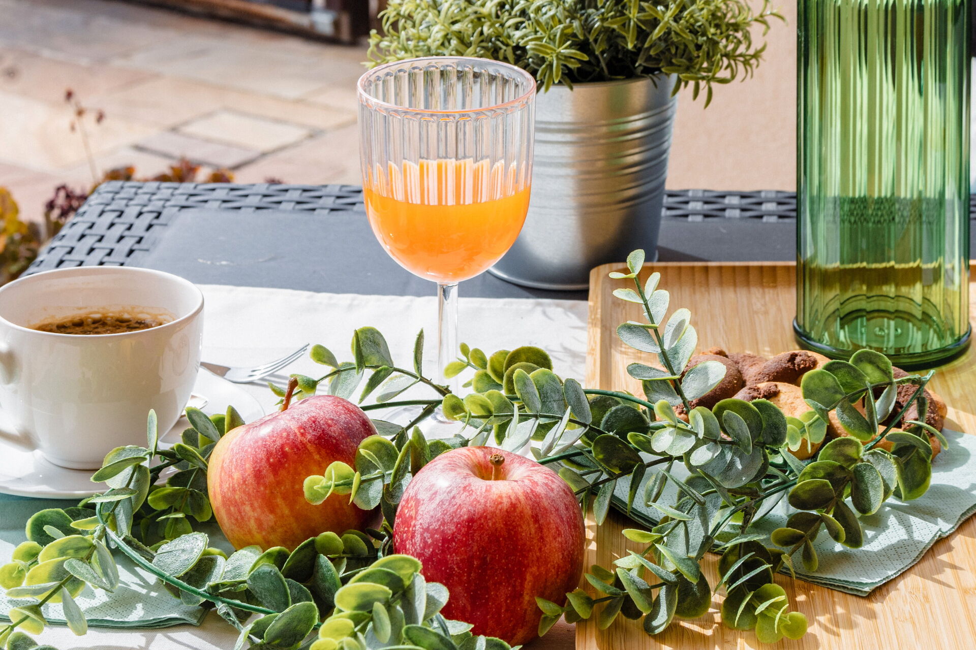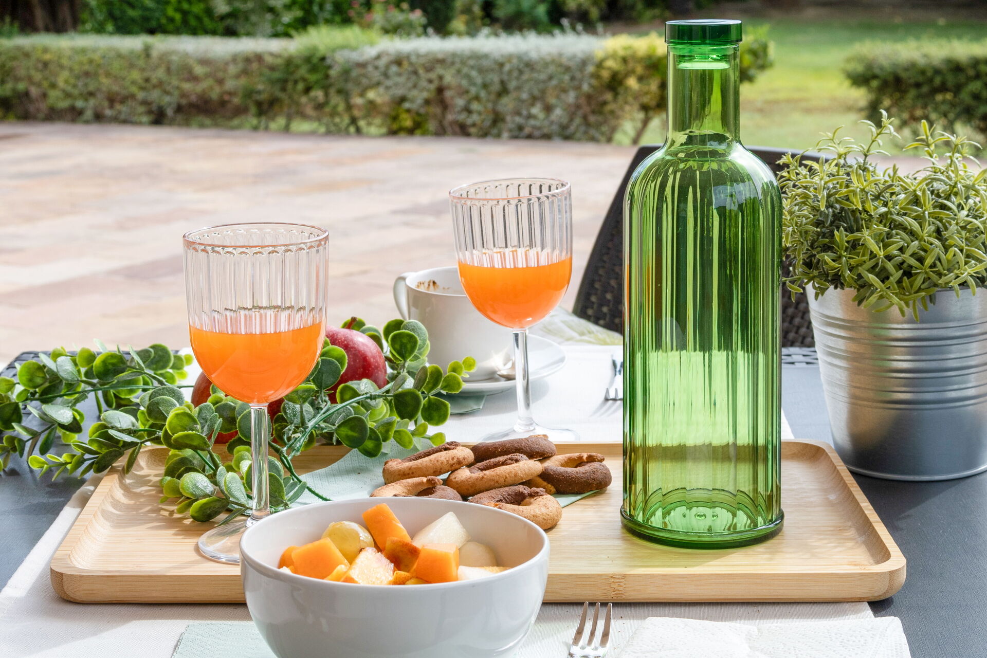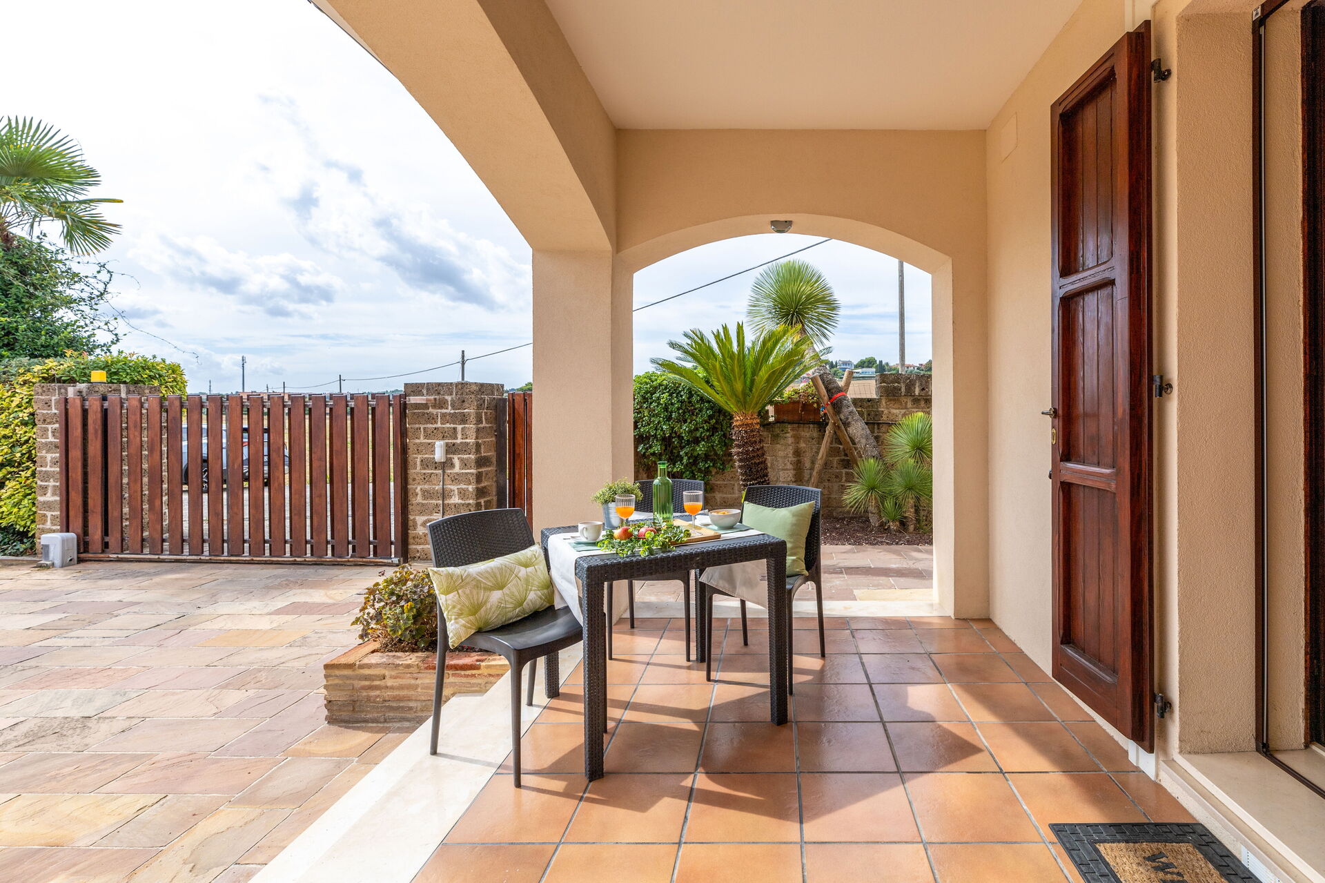 Garten: Außenbereich für das Essen im Freien, Gartenmöbel, umzäuntes Grundstück.