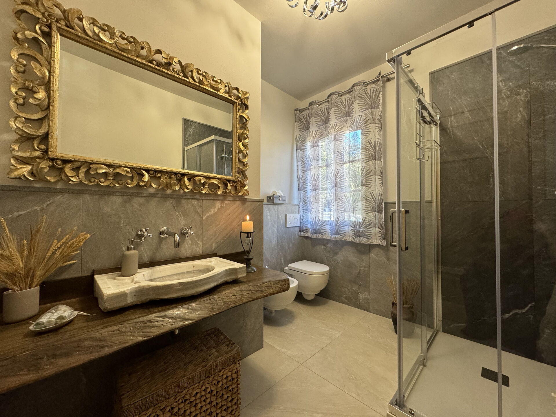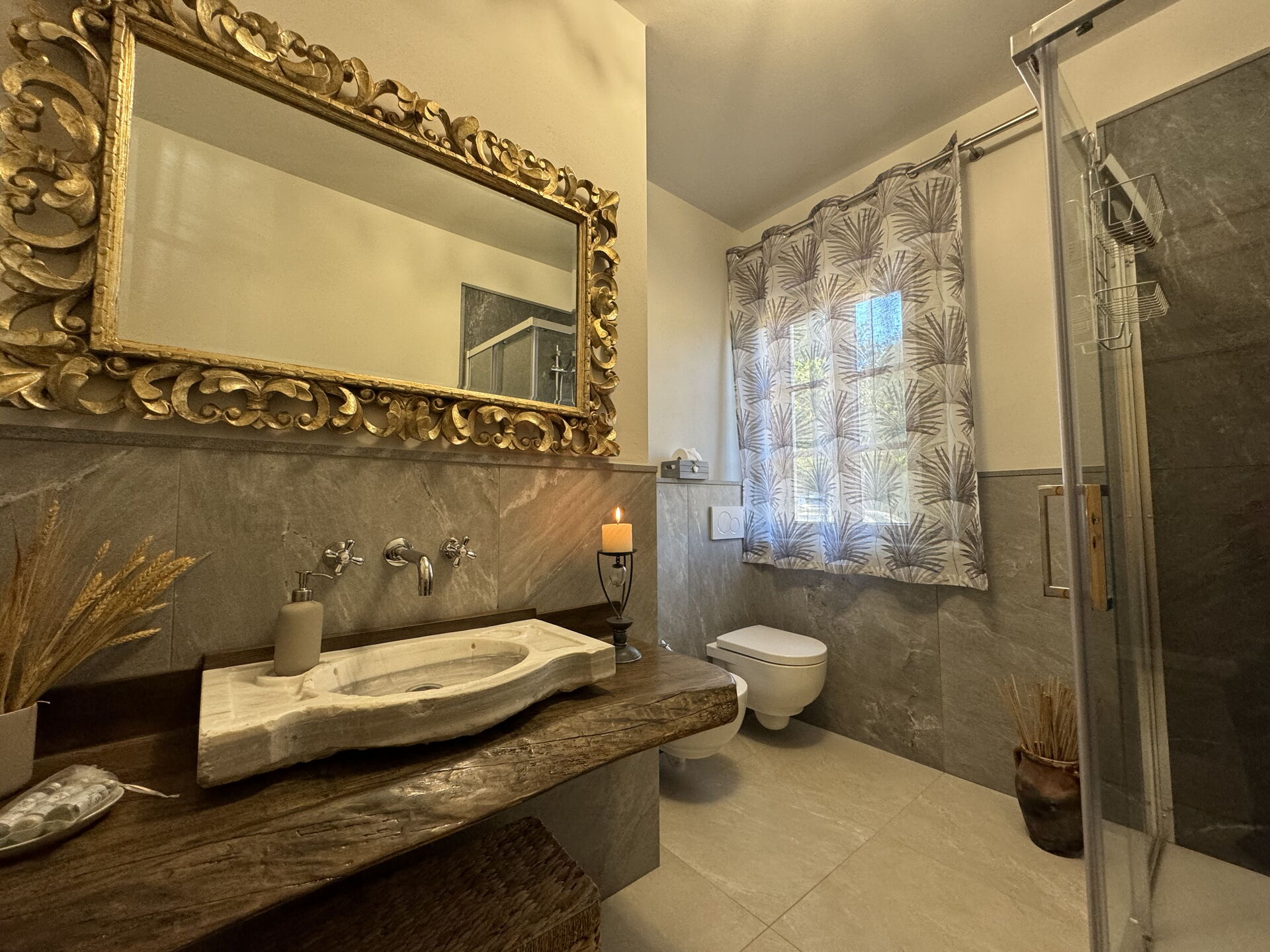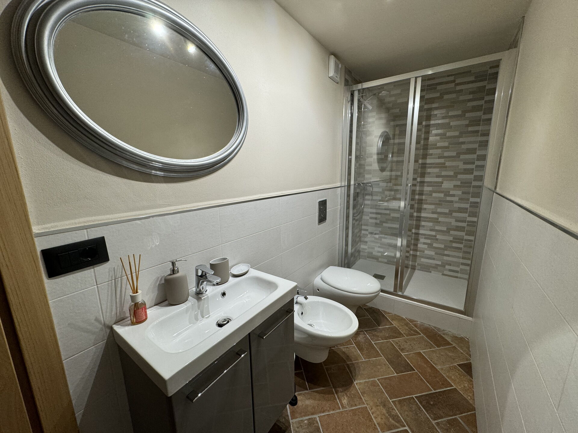 Badezimmer: Waschbecken, WC, Bidet, Dusche, Fön.