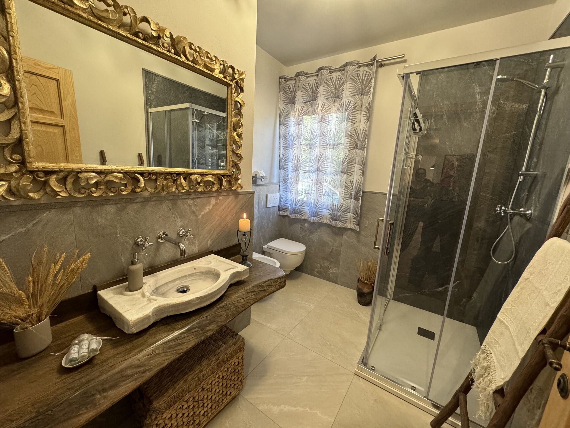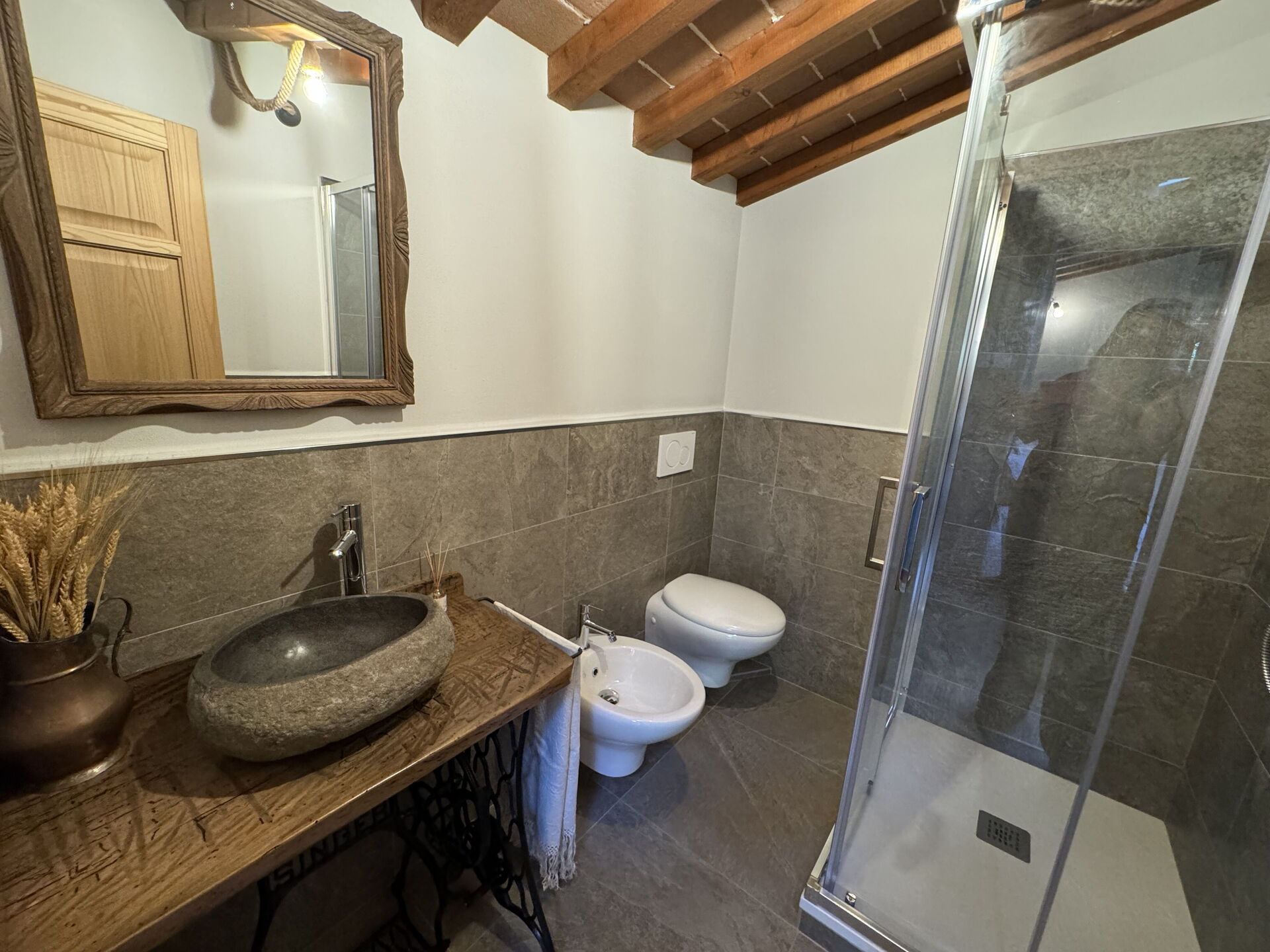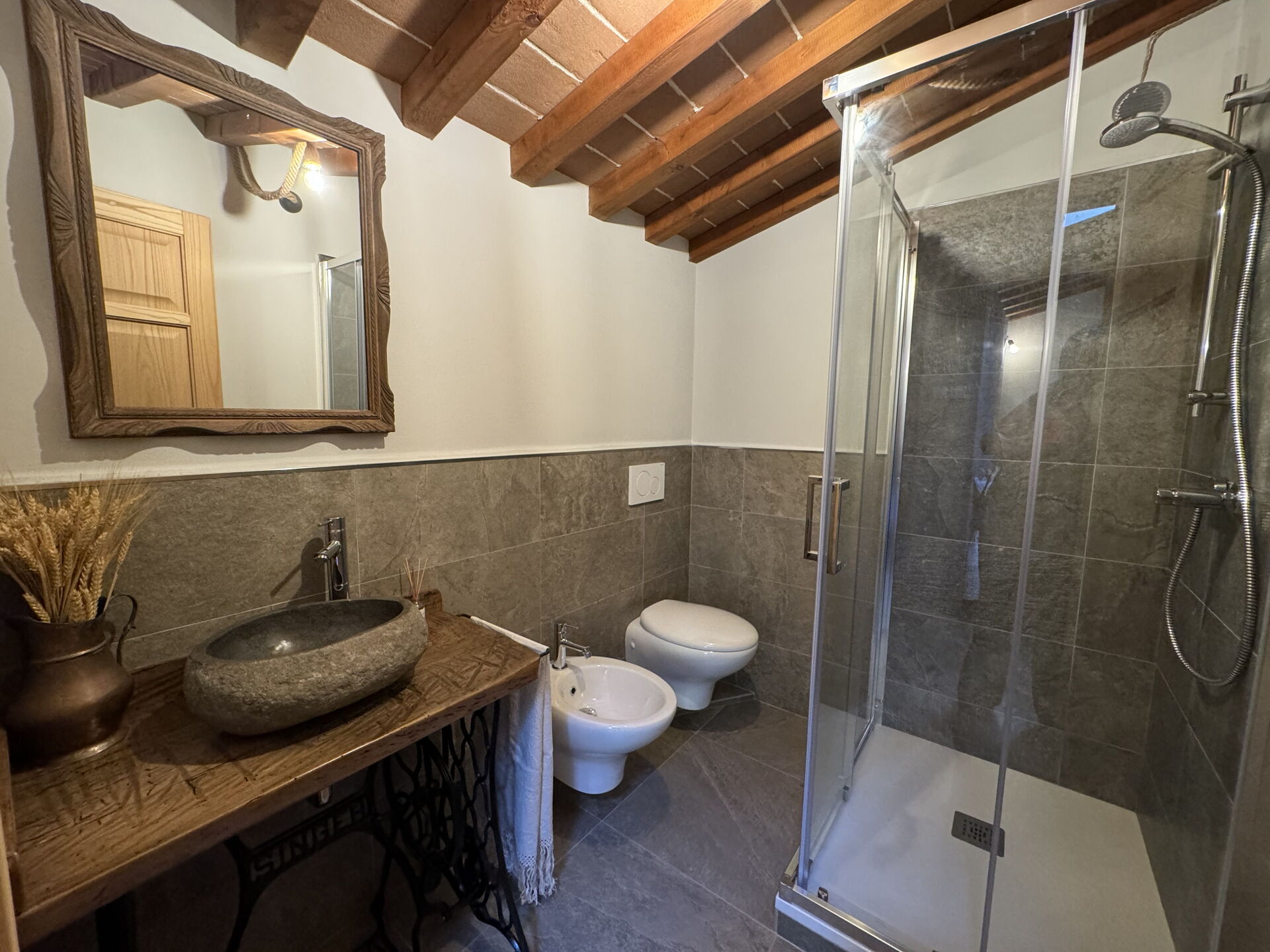 Badezimmer: Waschbecken, WC, Bidet, Dusche, Fön.