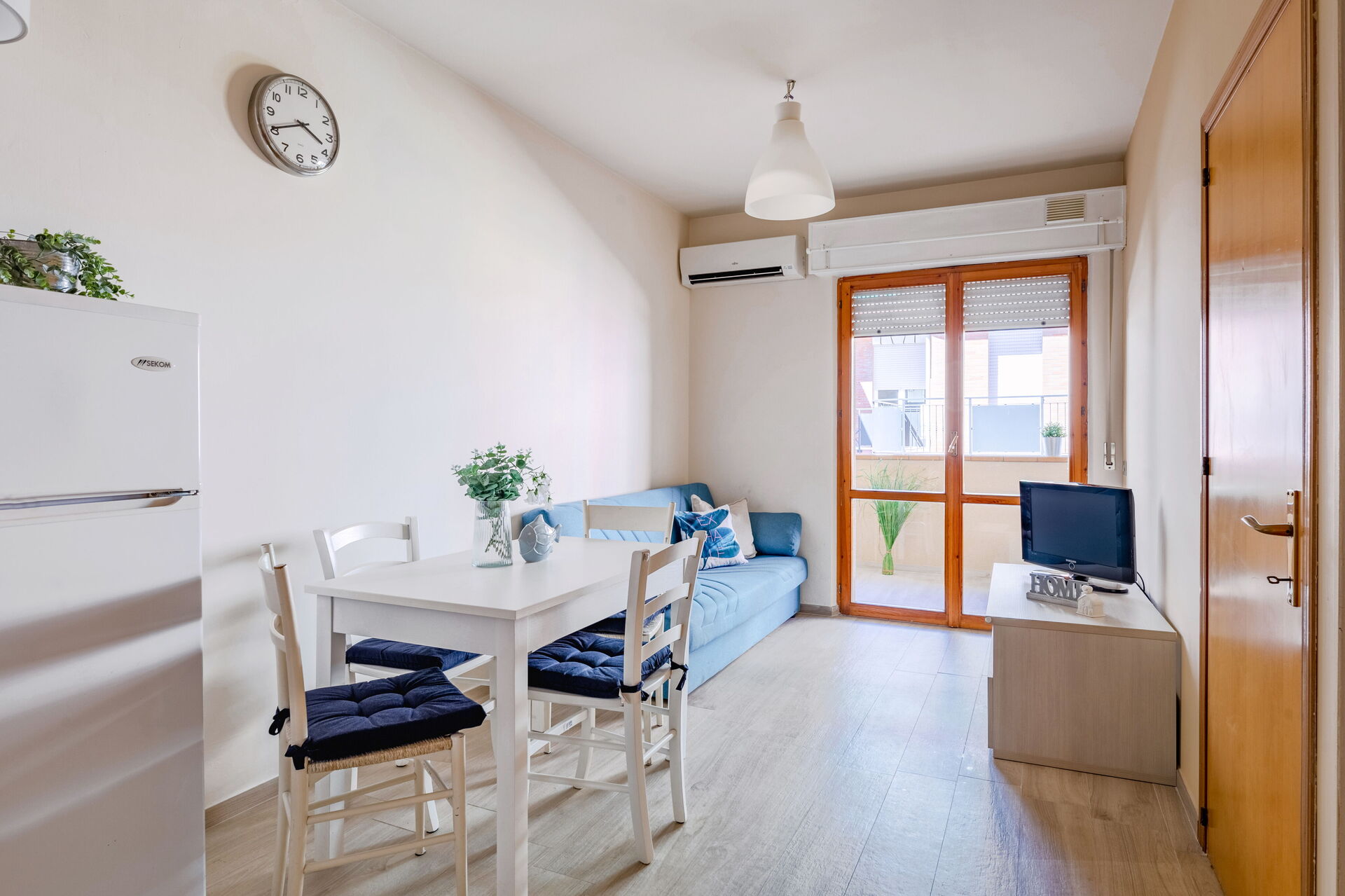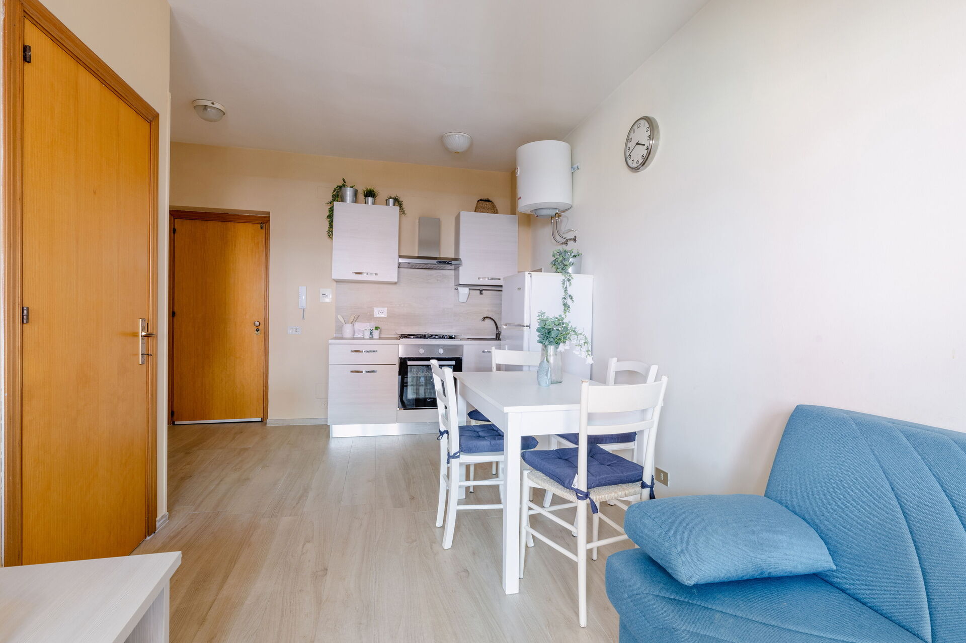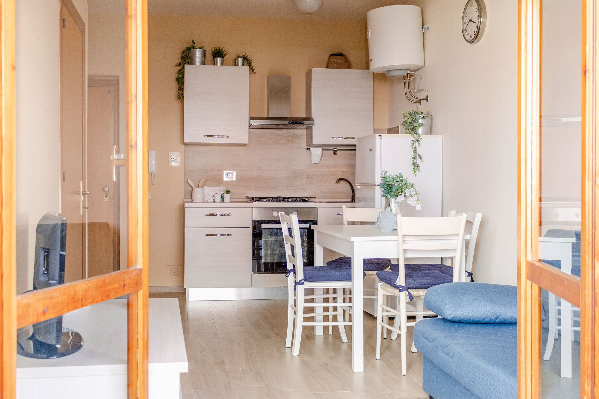 Wohnküche: gut ausgestattete Küche, Esstisch, Kühlschrank, Tiefkühler, Herd, Ofen, Sofa bed, WiFi Internet, Klimaanlage, Satelliten-TV, Ausgang auf den Balkon.