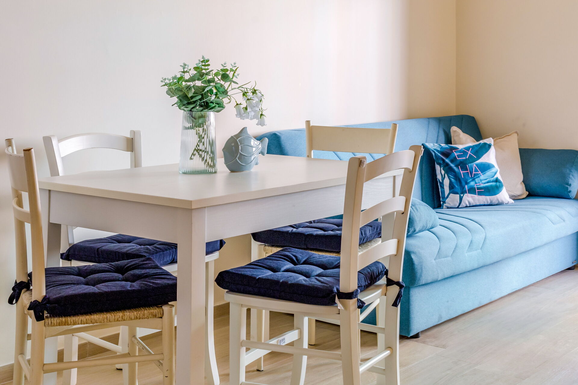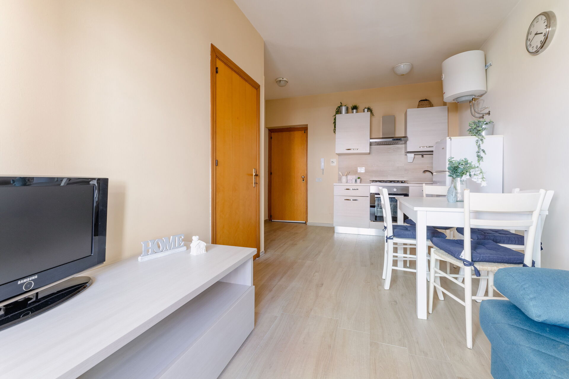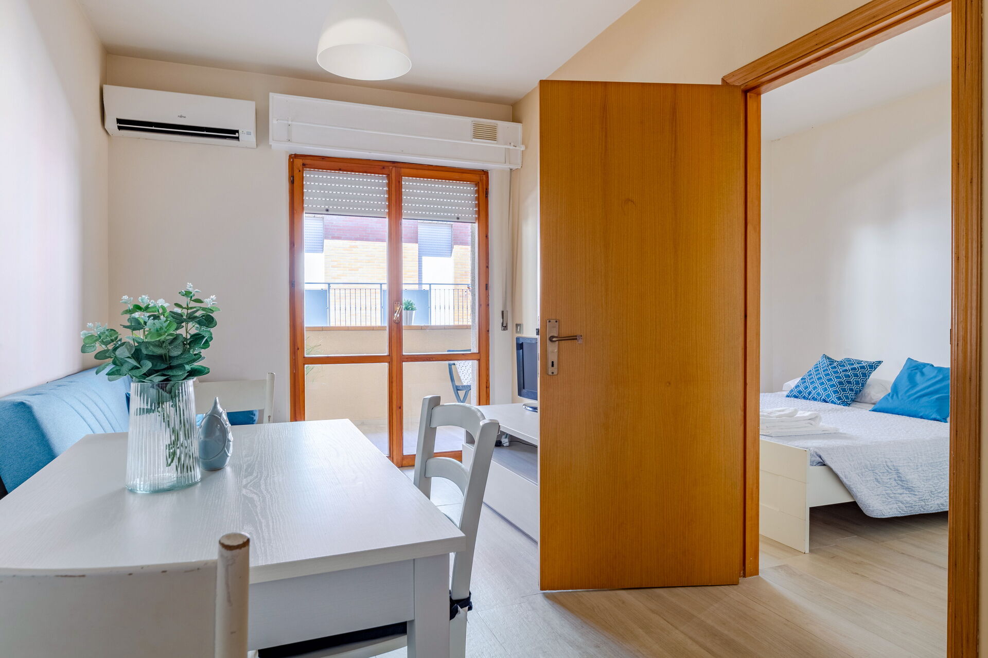 Wohnküche: gut ausgestattete Küche, Esstisch, Kühlschrank, Tiefkühler, Herd, Ofen, Sofa bed, WiFi Internet, Klimaanlage, Satelliten-TV, Ausgang auf den Balkon.