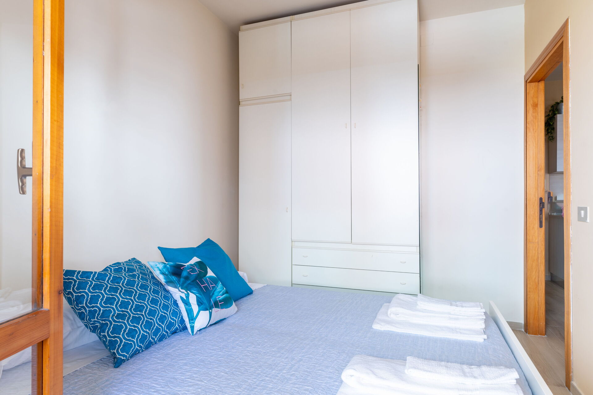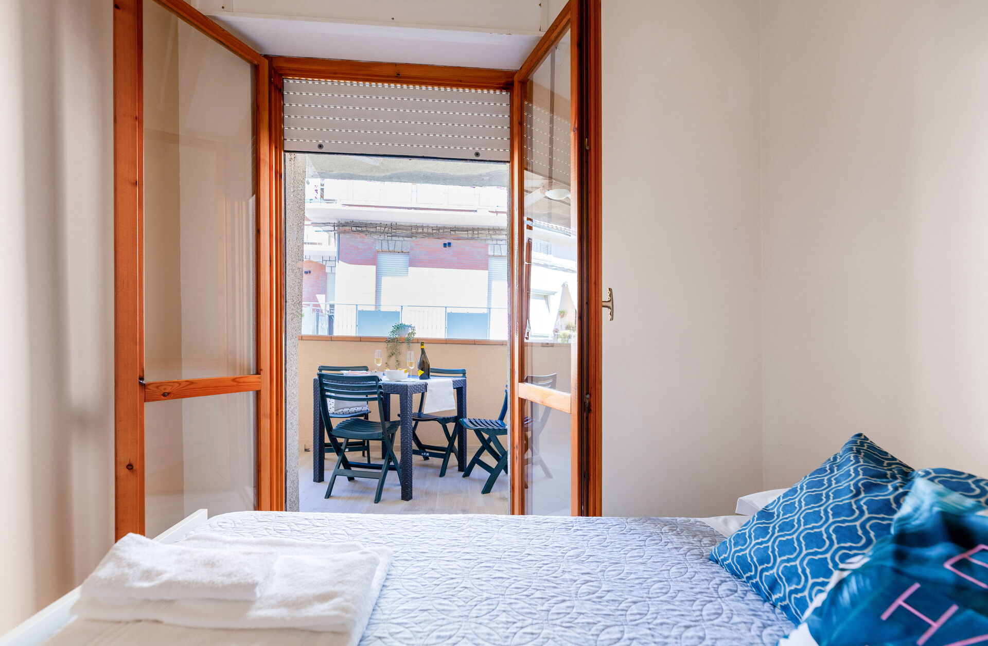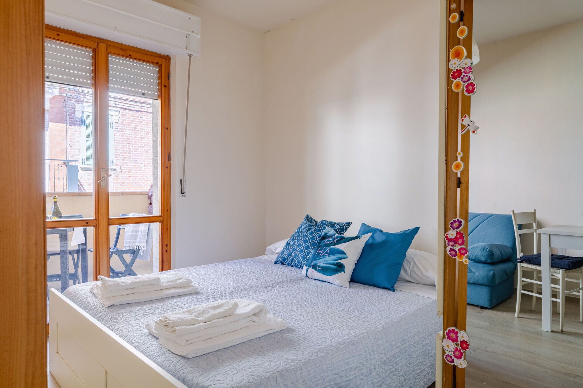 Schlafzimmer mit Bad: Doppelbett, WiFi Internet, Waschbecken, WC, Bidet, Dusche, Fön, Ausgang auf den Balkon.