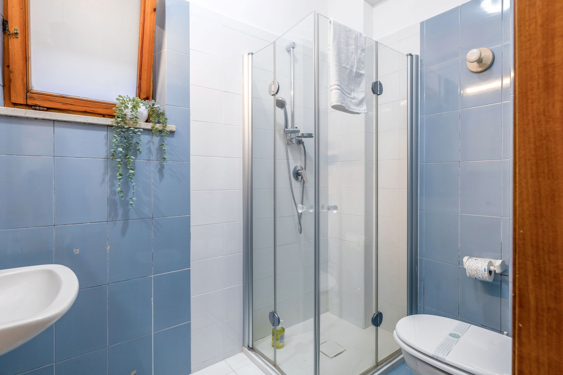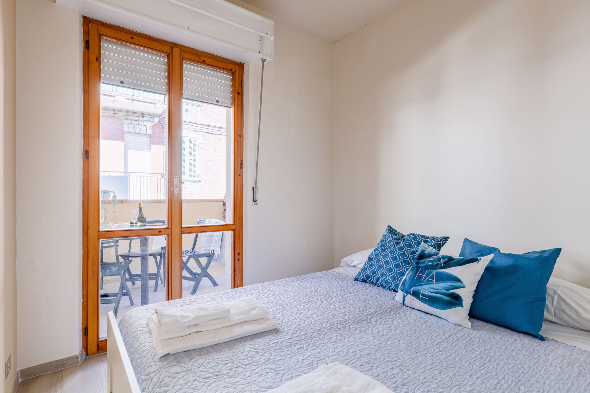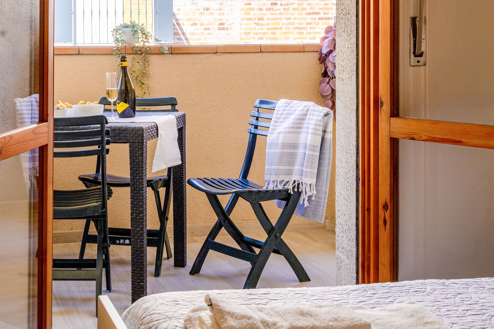Schlafzimmer mit Bad: Doppelbett, WiFi Internet, Waschbecken, WC, Bidet, Dusche, Fön, Ausgang auf den Balkon.