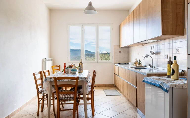 "Angela", 4-Zimmer-Wohnung 140 m2, im Erdgeschoss. Geschmackvoll und gemütlich eingerichtet: Wohn-/Esszimmer mit 1 Diwanbett (160 cm, Länge 200 cm). 2 Doppelzimmer. 1 Doppelzimmer mit 1 Bett (90 cm, Länge 200 cm). Wohnküche (Backofen, Geschirrspüler, 4 Flammen, Toaster, Wasserkocher). Dusche/Bidet/WC. G-Heizung, Klimaanlage, Warmluftheizung. Heizung nur verfügbar von 15.10. bis 15.04. Terrasse 30 m2, Garten. Terrassenmöbel, Gartengrill. Sehr schöne Sicht auf die Landschaft. Zur Verfügung: Waschmaschine. Internet (WLAN, gratis). Maximal 1 Haustier/Hund erlaubt.