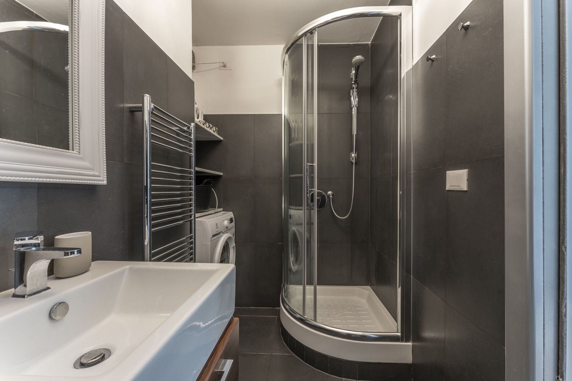Badezimmer: Waschbecken, WC, Bidet, Dusche, Fön, Waschmaschine, WiFi Internet.