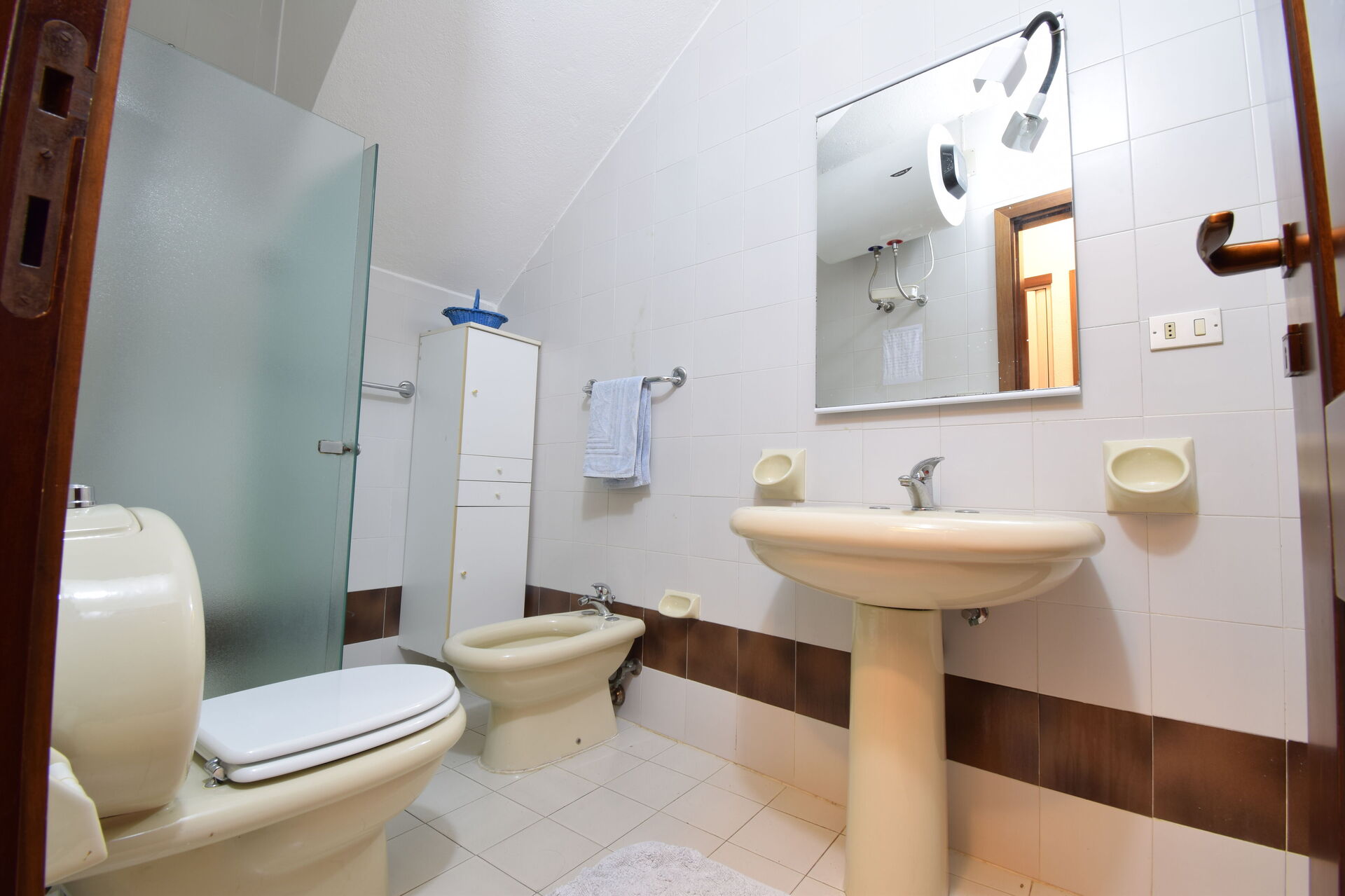 Badezimmer: Waschbecken, WC, Bidet, Dusche.