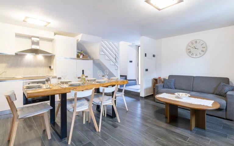 3-Zimmer-Haus 64 m2 auf 2 Stockwerken im 1. Stock, Südlage. Geräumig, teilweise abgeschrägt, vollständig renoviert im Jahre 2024, modern und geschmackvoll eingerichtet: Wohn-/Esszimmer mit 1 Doppeldiwanbett, Esstisch, TV, Radio, CD und Stereoanlage. Ausgang zum Garten. Kochnische (Backofen, Geschirrspüler, 4 Induktionskochplatten, Toaster, Wasserkocher, Mikrowelle, elektrische Kaffeemaschine, Kapseln für die Kaffeemaschine (Nespresso) gratis). Obergeschoss: (steile Treppe) 1 abgeschrägtes Doppelzimmer. 1 abgeschrägtes Zimmer mit 1 x 2 Etagenbetten. Dusche/Bidet/WC. Heizung. Liegestühle. Sehr schöne Panoramasicht auf die Berge, das Tal, den Garten und Cascate dell'Acquafraggia. Zur Verfügung: Waschmaschine, Haartrockner. Internet (WLAN, gratis). Bitte beachten: Nichtraucher-Haus. Maximal 1 Haustier/Hund erlaubt. IT014050C2U6TYR796