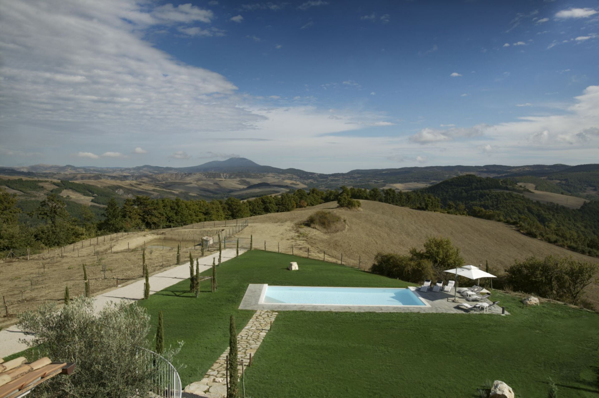 Villa Eline ist eine außergewöhnliche Ferienvilla in einzigartiger Panoramalage in Trevinano, einem charmanten Ortsteil von Acquapendente in der nördlichen Region Latium, Italien. Diese luxuriöse Residenz empfängt Gäste, die einen exklusiven Rückzugsort inmitten des üppigen Grüns der Tuscia suchen, und bietet atemberaubende 360-Grad-Blicke auf die umliegende Landschaft. Nur wenige Kilometer von der Toskana und Umbrien entfernt, befindet sich die Immobilie in unmittelbarer Nähe zu San Casciano dei Bagni mit seinen renommierten Thermalbädern. Die Villa verfügt über eine außergewöhnliche Auswahl an erstklassigen Einrichtungen, darunter ein großer Panorama-Swimmingpool und Highspeed-WLAN-Internetverbindung im gesamten Anwesen. Sie werden in diesem bemerkenswerten Anwesen eine raffinierte Kombination aus Hingabe, Stil, Komfort und Ruhe entdecken. Ein umfassender Concierge-Service steht zur Verfügung, um Restaurantreservierungen, Weintouren, Ausflüge, Bootsverleih am Bolsenasee, private Fahrerdienste und vieles mehr zu arrangieren. Die Immobilie bietet wirklich alles, was Sie sich für einen unvergesslichen Aufenthalt wünschen können, und macht es schwer, wieder abzureisen, sobald Sie alles erlebt haben, was Villa Eline zu bieten hat.