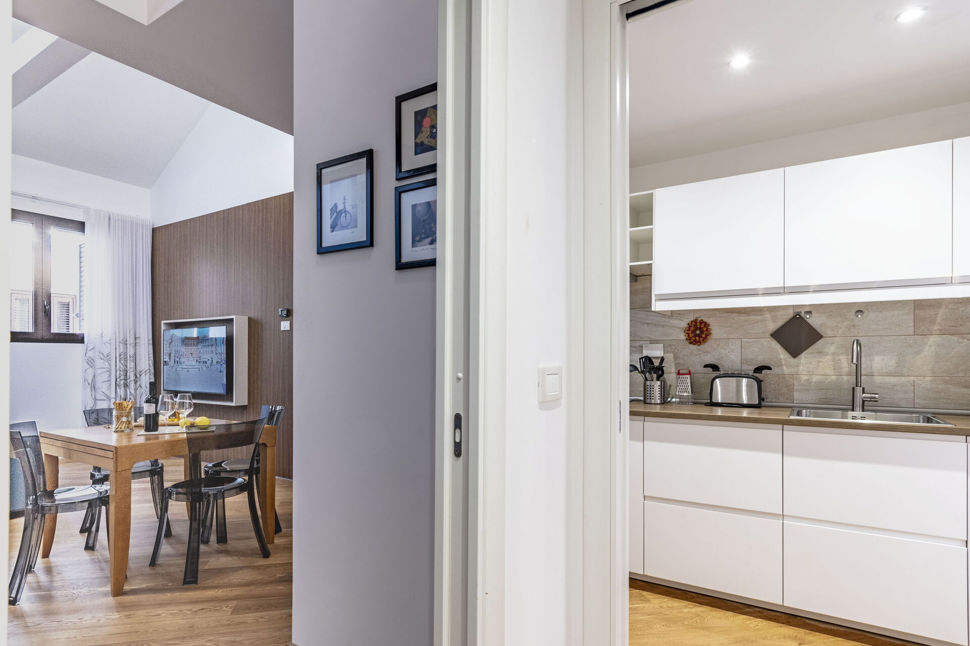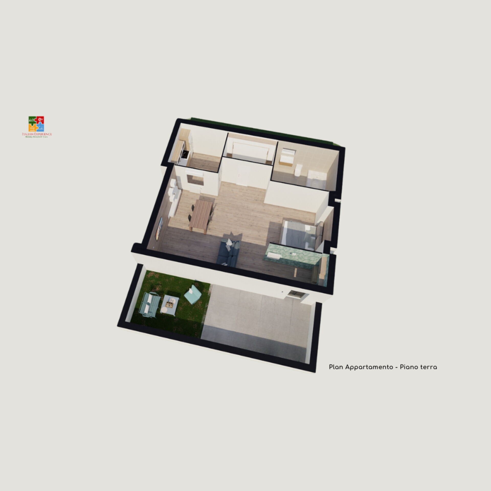 Wohnküche: gut ausgestattete Küche, Esstisch, Kühlschrank, Tiefkühler, Herd, Ofen, Doppel-Schlafsofa, WiFi Internet, Klimaanlage, Satelliten-TV, Ausgang auf den Patio.