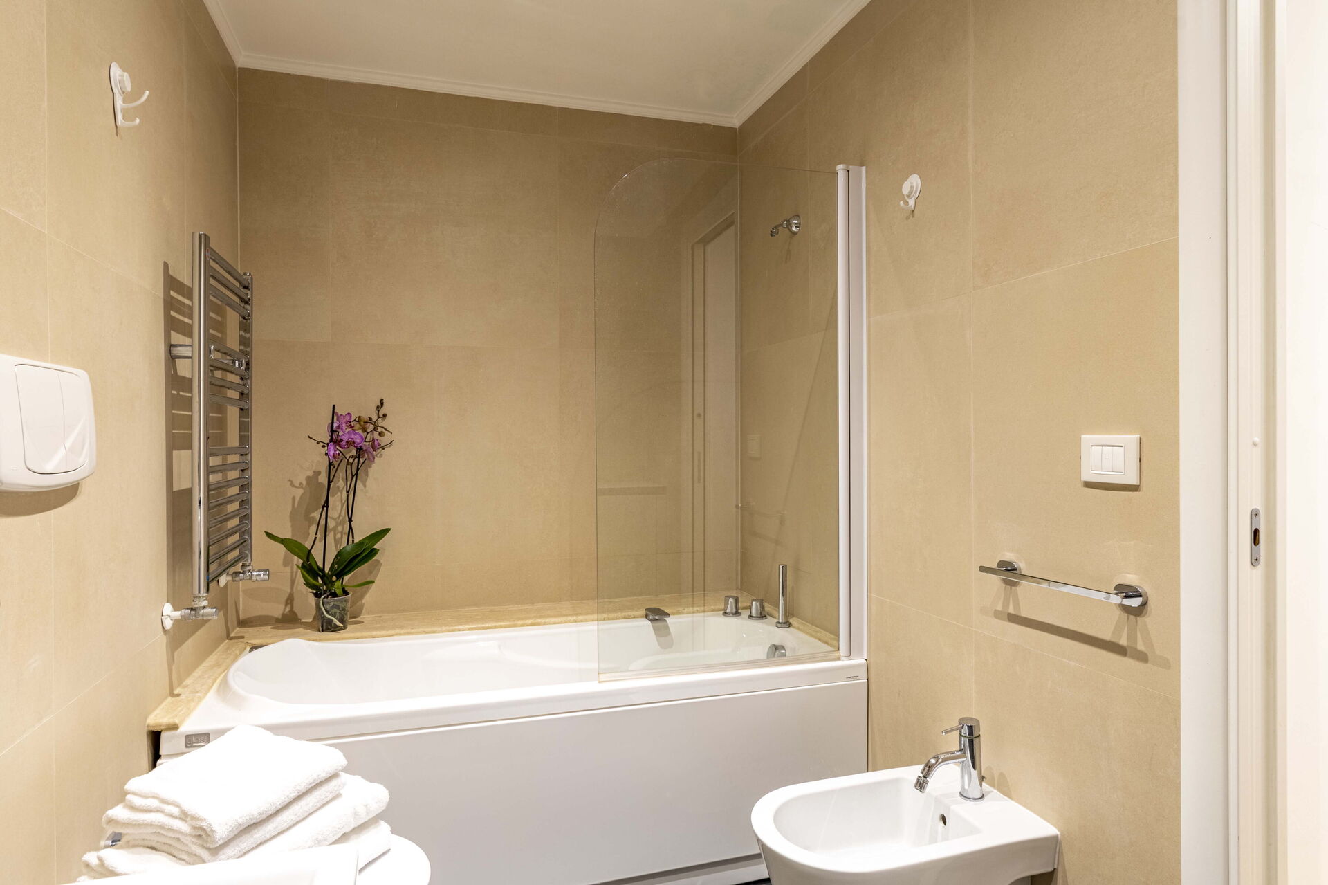 Schlafzimmer mit Bad: Doppelbett, WiFi Internet, Waschbecken, WC, Bidet, Badewanne.