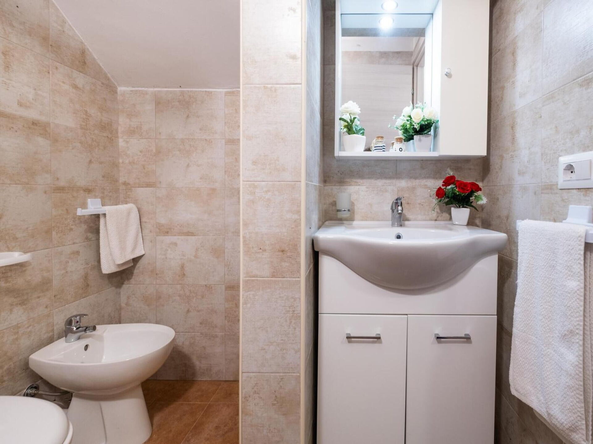 Badezimmer: Waschbecken, WC, Bidet, Dusche, WiFi Internet.