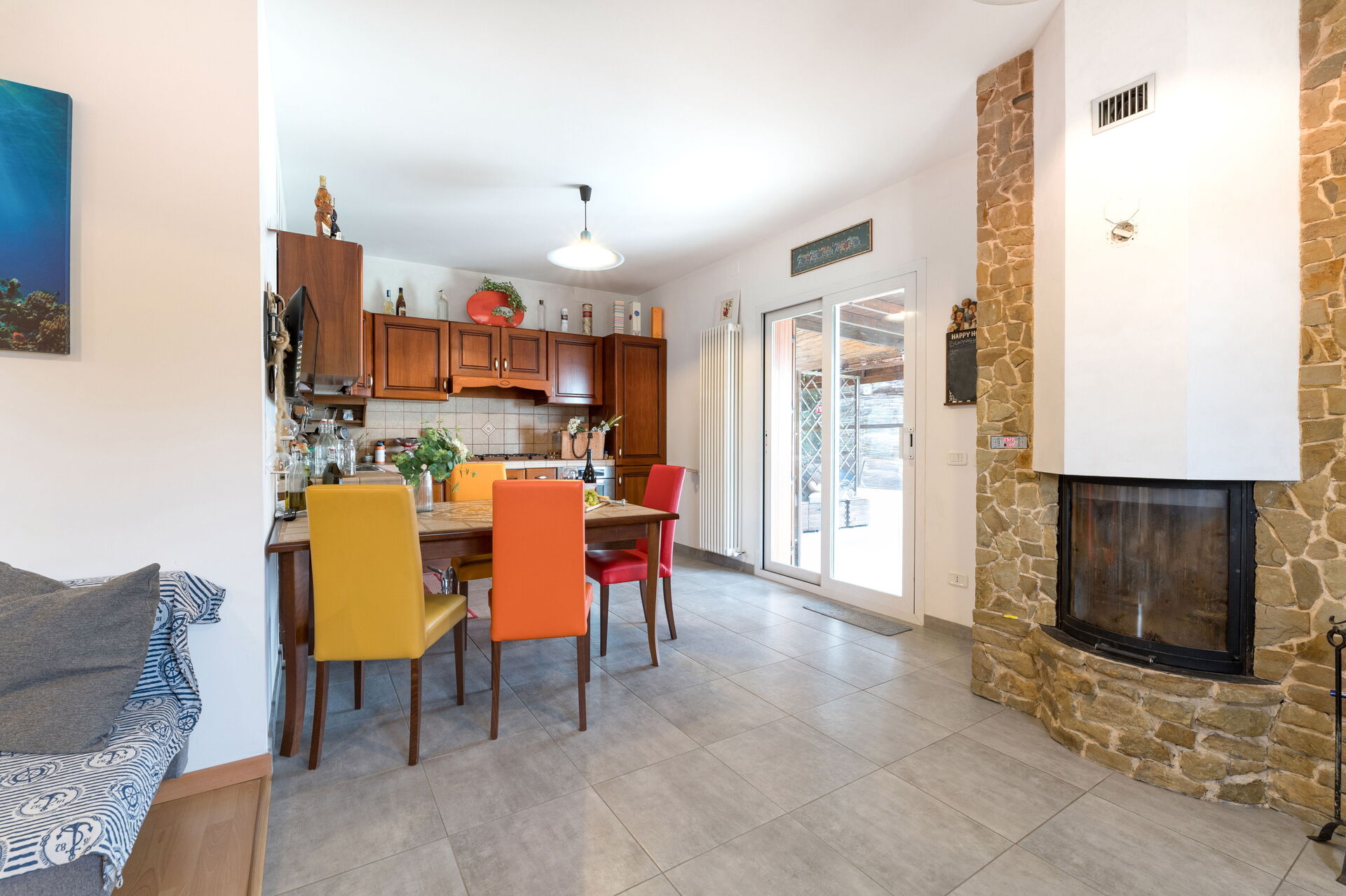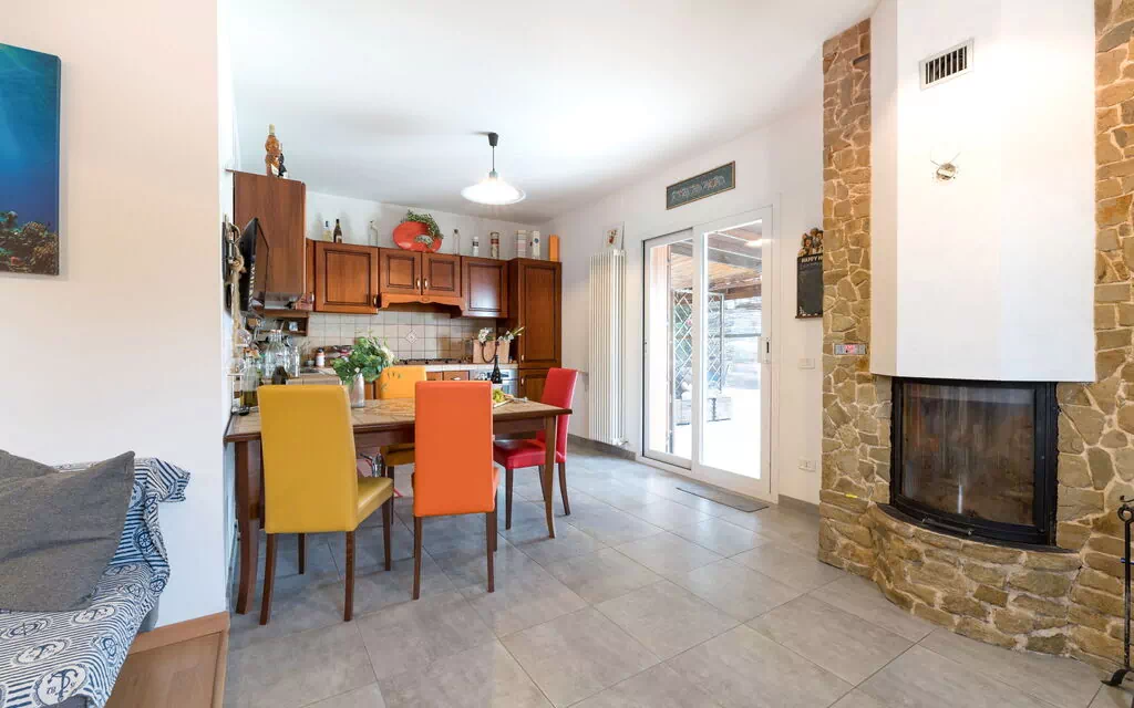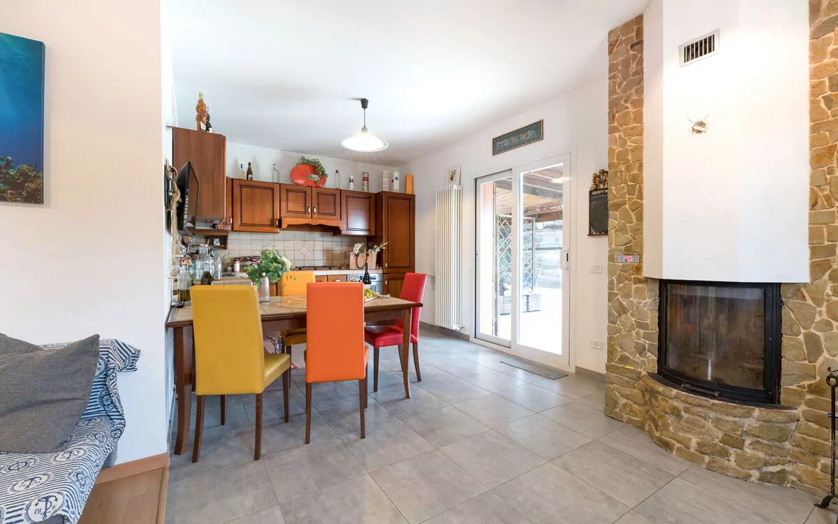 Wohnküche: gut ausgestattete Küche, Esstisch, Kühlschrank, Tiefkühler, Herd, Ofen, Italienische Kaffeemaschine, Sofa, Kamin, WiFi Internet, Satelliten-TV, TV, Ausgang auf den Garten.