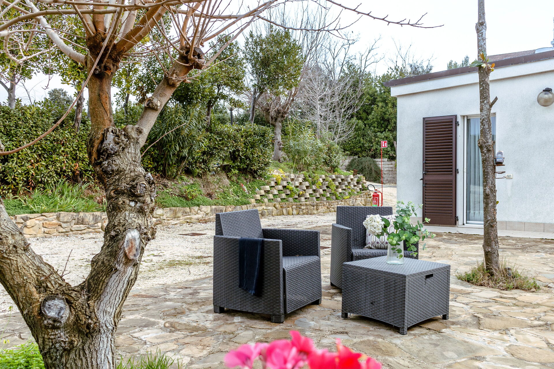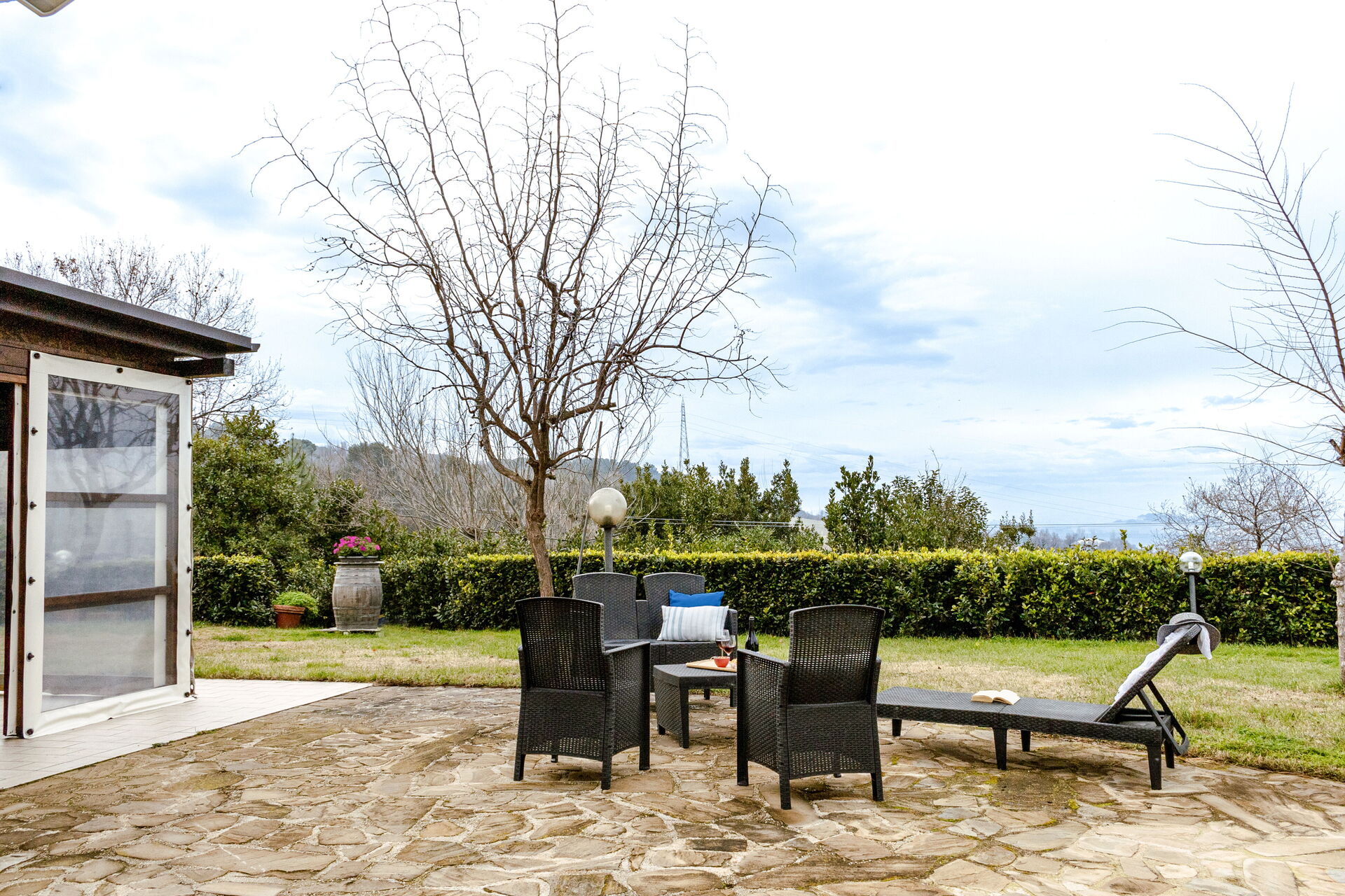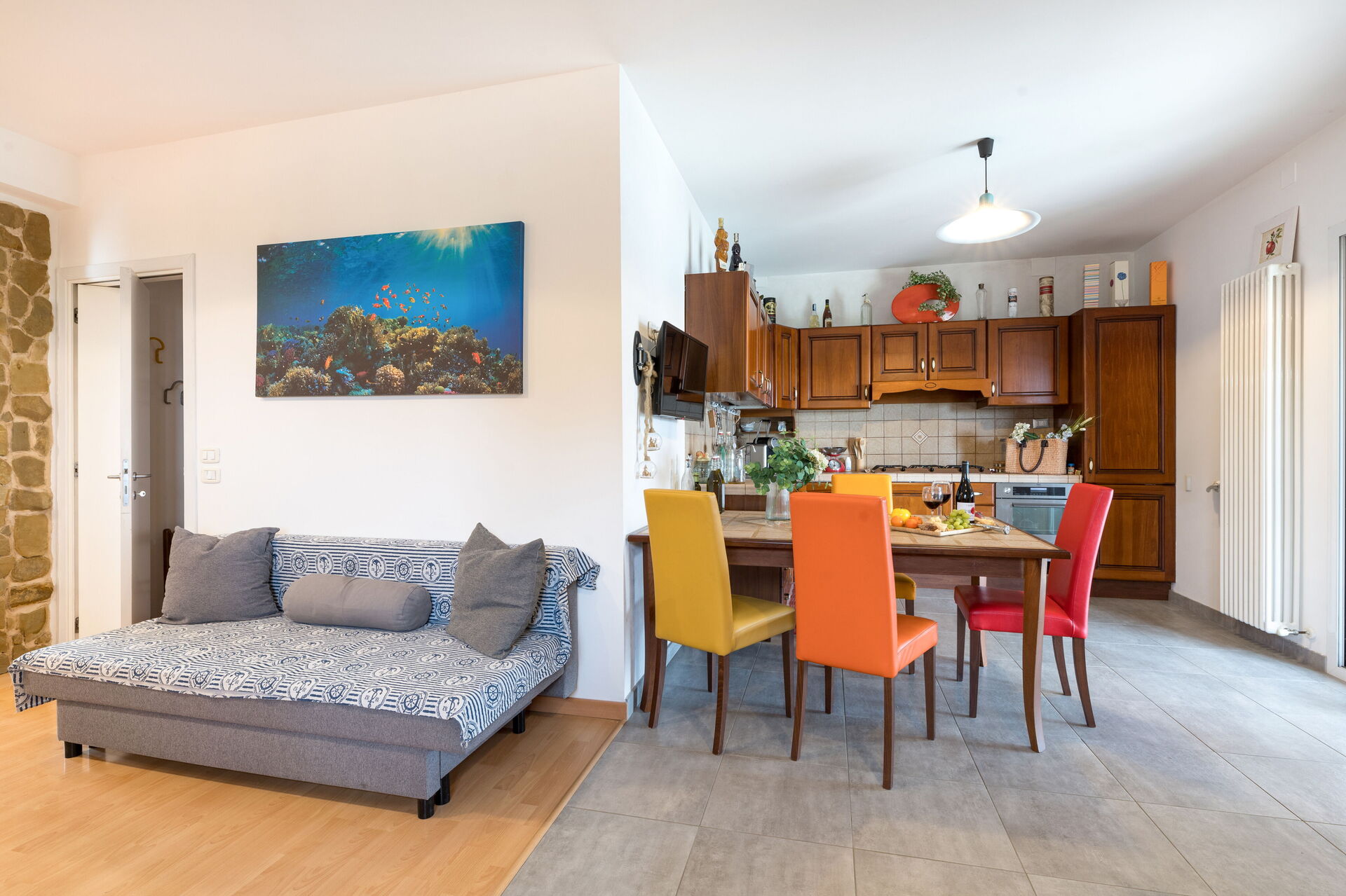 Nach Ankunft werden Sie eine schöne, saubere und gut gepflegte Unterkunft finden, mit Ausblick auf die Hügellandschaft und die Berge perfekt für einen entspannenden Marken-Urlaub. Zum Zeitvertreib gibt es hier einen privaten Garten wo Sie sich nach Ihrem beschäftigten Tag, den Sie mit Sightseeing verbracht haben, ausruhen können, während Sie ein erfrischendes, kühles Getränk zu sich nehmen. Ein echter Vorteil einer privaten Ferienunterkunft, im Gegensatz zu mehreren Hotelzimmern, ist, dass Sie nach einem anstrengenden Tag, den Sie mit Sightseeing verbracht haben, gemeinsam mit Freunden und Familie entspannen können. Essen Sie zusammen und genießen Sie den lokalen Wein, um den Tag ausklingen zu lassen. Speisen mit Freunden und Familie ist ein wichtiger Bestandteil der italienischen Kultur. Nutzen Sie die gut ausgestattete Küche, um Mahlzeiten aus lokalen Produkten vorzubereiten, während Sie im Urlaub sind. Die Küche kommt mit Kaffeemaschine und Kühlschrank, sowie ausreichend Geschirr und Besteck für bis zu drei Personen.