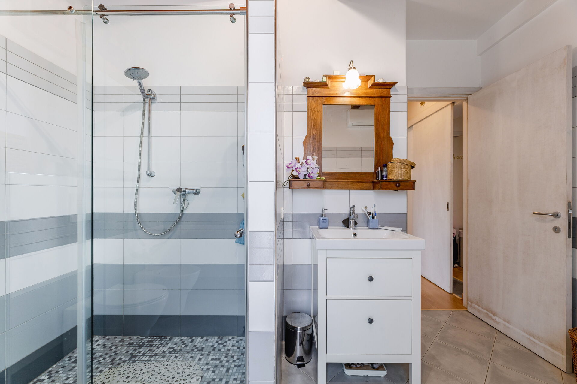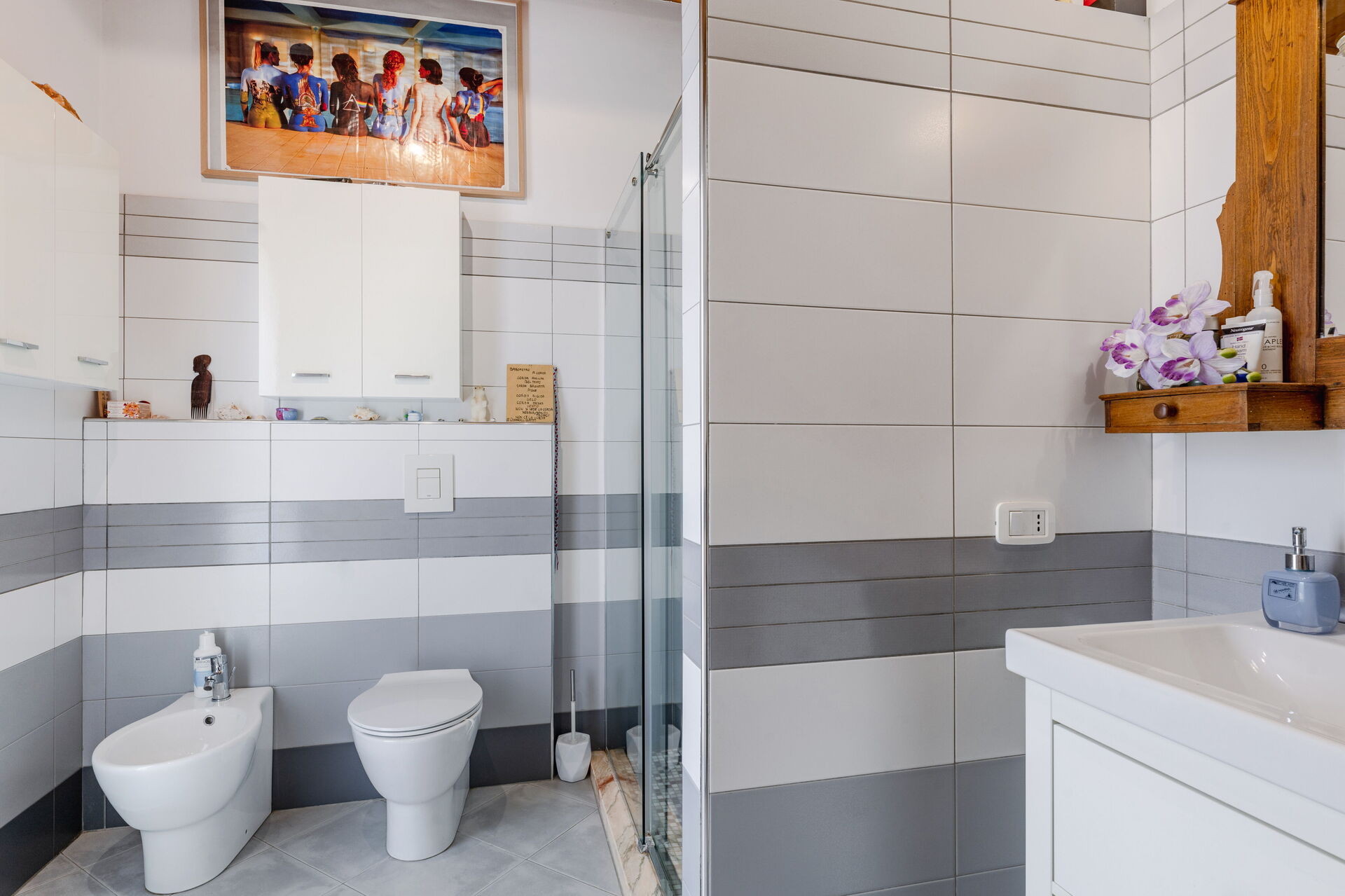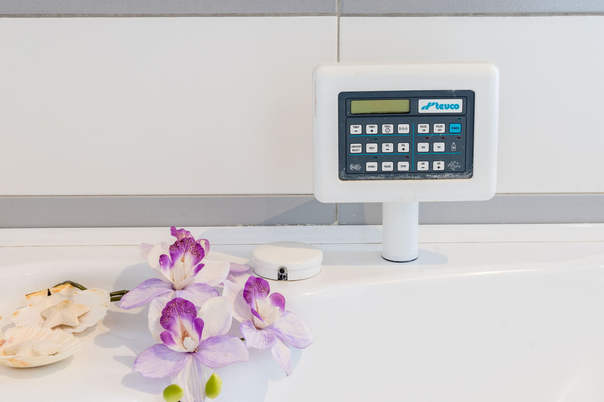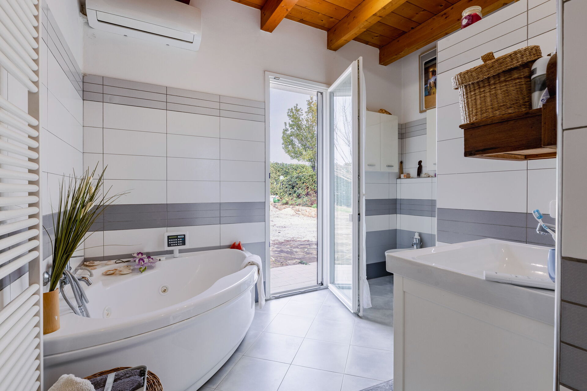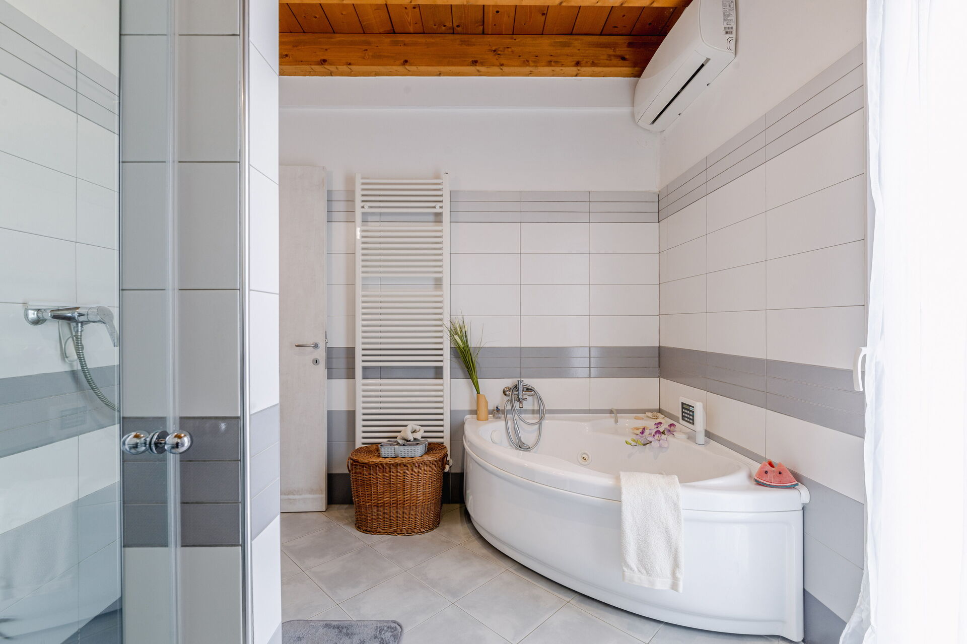 Badezimmer: Whirlpool-Badewanne, Waschbecken, WC, Bidet, Dusche, Fön, Klimaanlage.