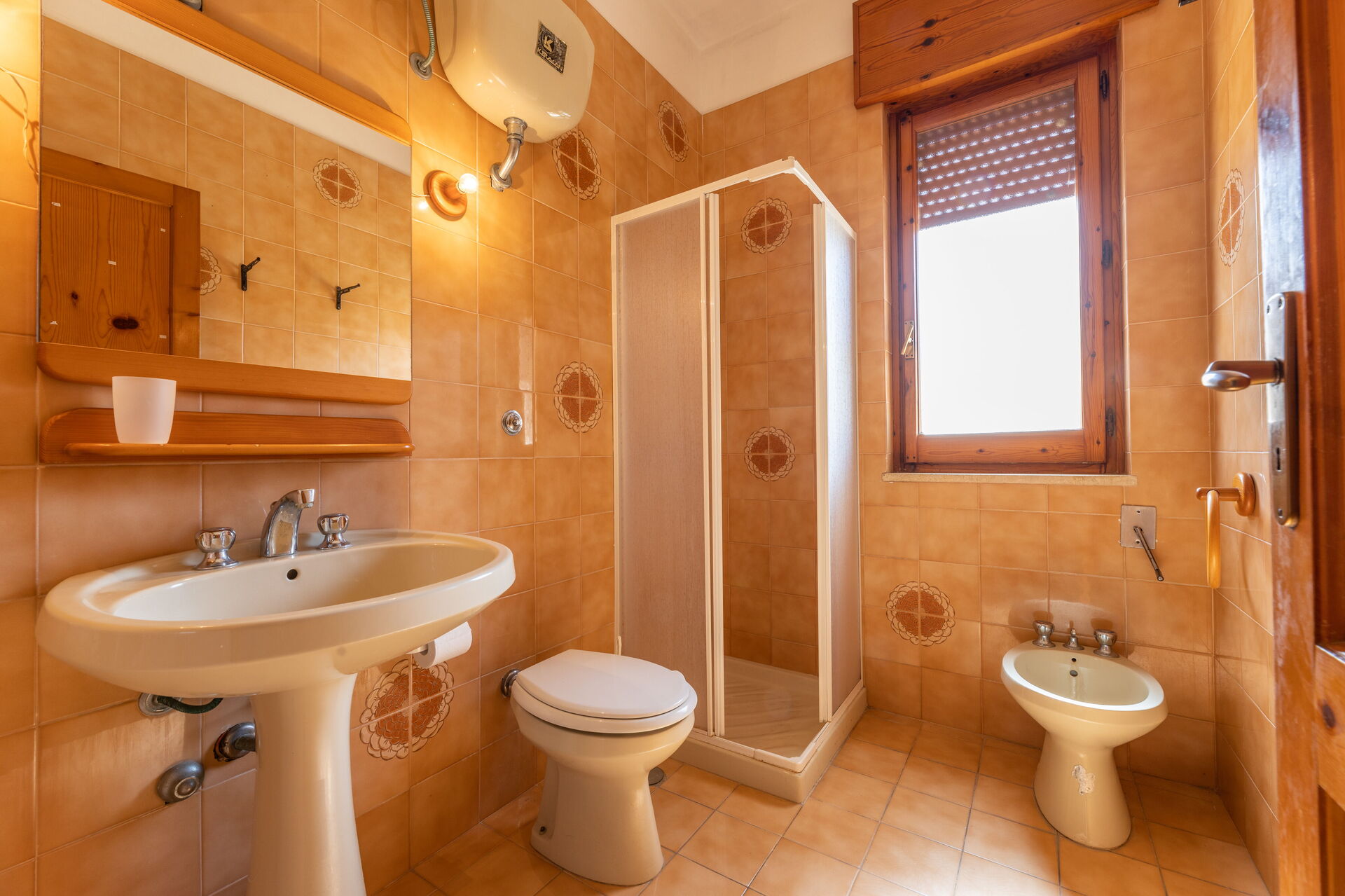 Badezimmer: Waschbecken, WC, Bidet, Dusche.