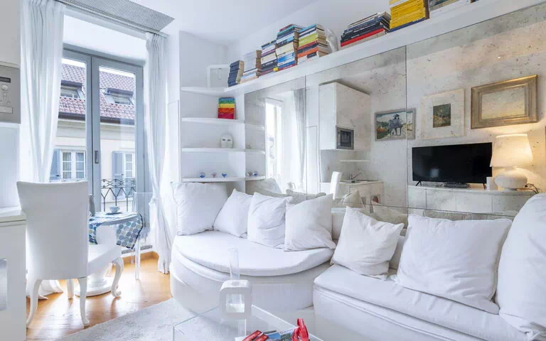 1-Zimmer-Studio 36 m2 im 4. Stock. Hell, luxuriös und stilvoll eingerichtet: Wohn-/Esszimmer mit 1 Doppelbett (160 cm, Länge 200 cm), TV. Kleine Kochnische (2 Induktionskochplatten, Toaster, Wasserkocher, Mikrowelle, elektrische Kaffeemaschine, Kapseln für die Kaffeemaschine (Nespresso) gratis). Dusche/WC, Hydromassage-Dusche. Heizung, Klimaanlage. Parkettboden, Natursteinboden. Zur Verfügung: Haartrockner. Internet (WLAN, gratis). Bitte beachten: Nichtraucher-Unterkunft. IT015146C2B54WM5TQ
