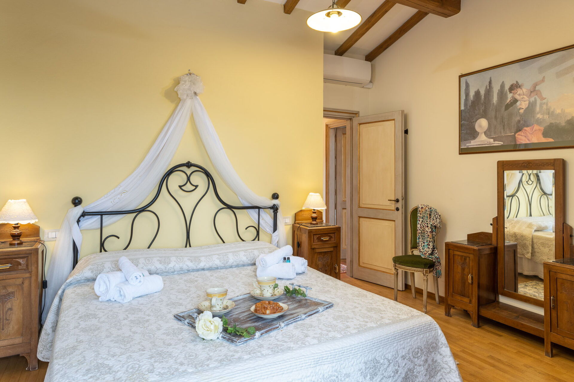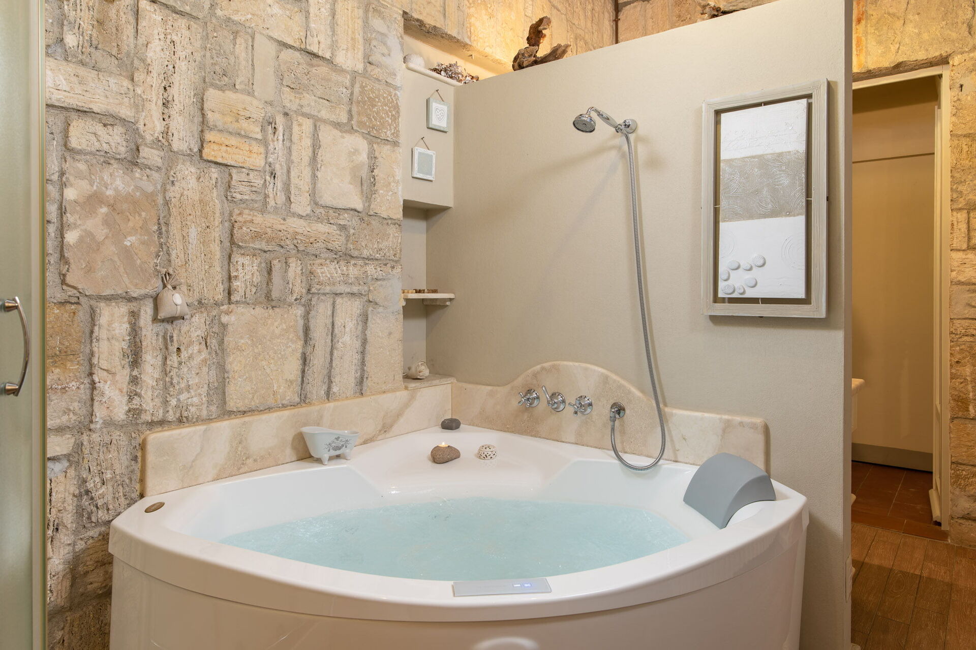 Schlafzimmer mit Bad: Doppelbett (Breite: 160m, Länge: 200m), WiFi Internet, Klimaanlage, Sessel, Kamin, Whirlpool-Badewanne, Doppelwaschbecken, Bidet, Dusche, Fön.