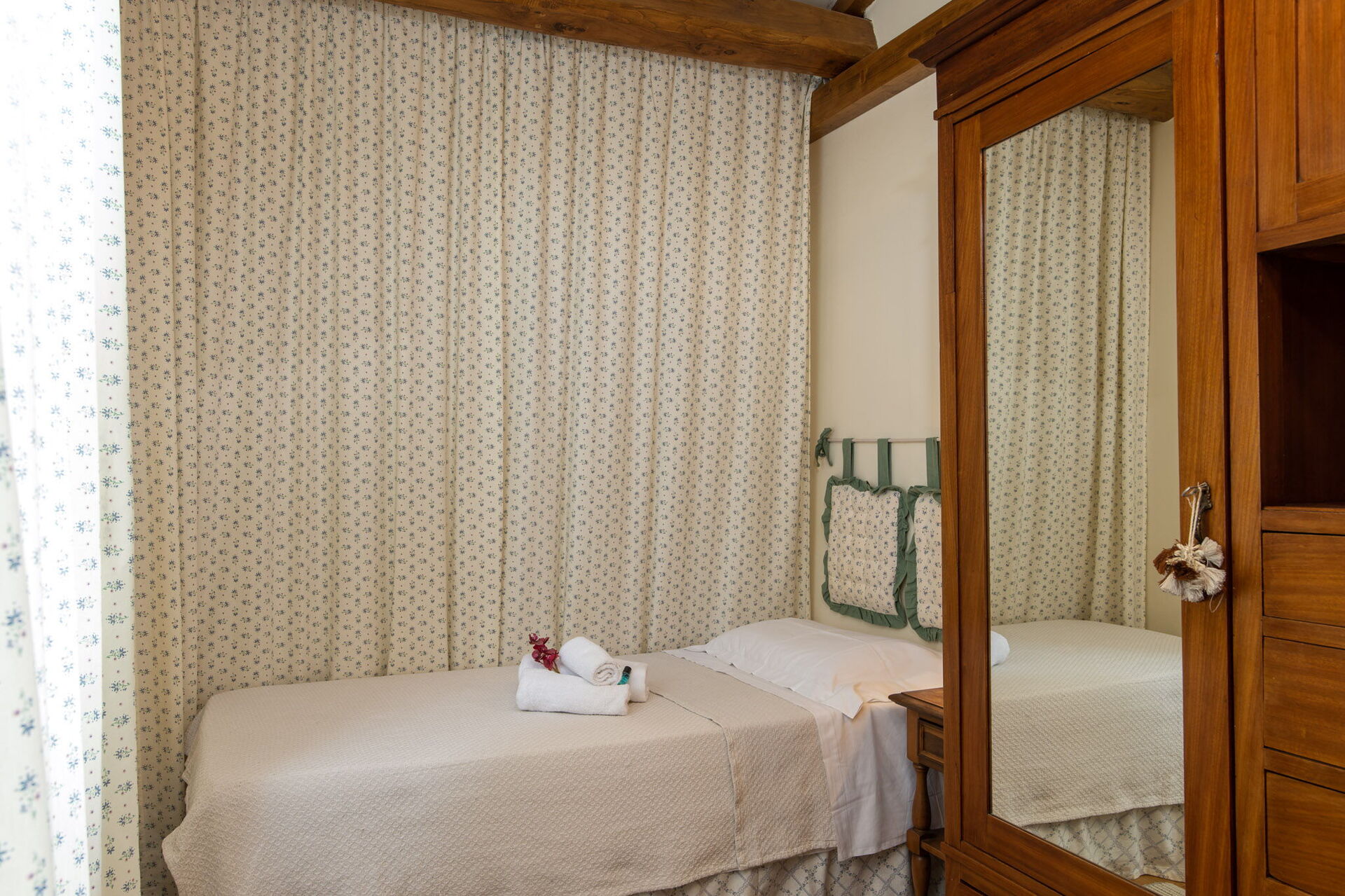 Schlafzimmer mit Bad: Doppelbett (Breite: 160m, Länge: 200m), Kinderbett, WiFi Internet, WiFi Internet, Klimaanlage, Sessel, Schreibtisch, Waschbecken, Bidet, Dusche, Fön, Ausgang auf den Garten.