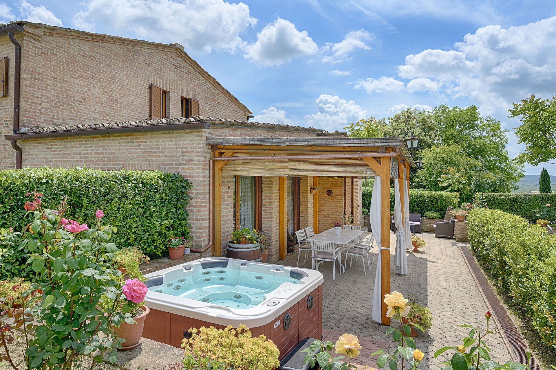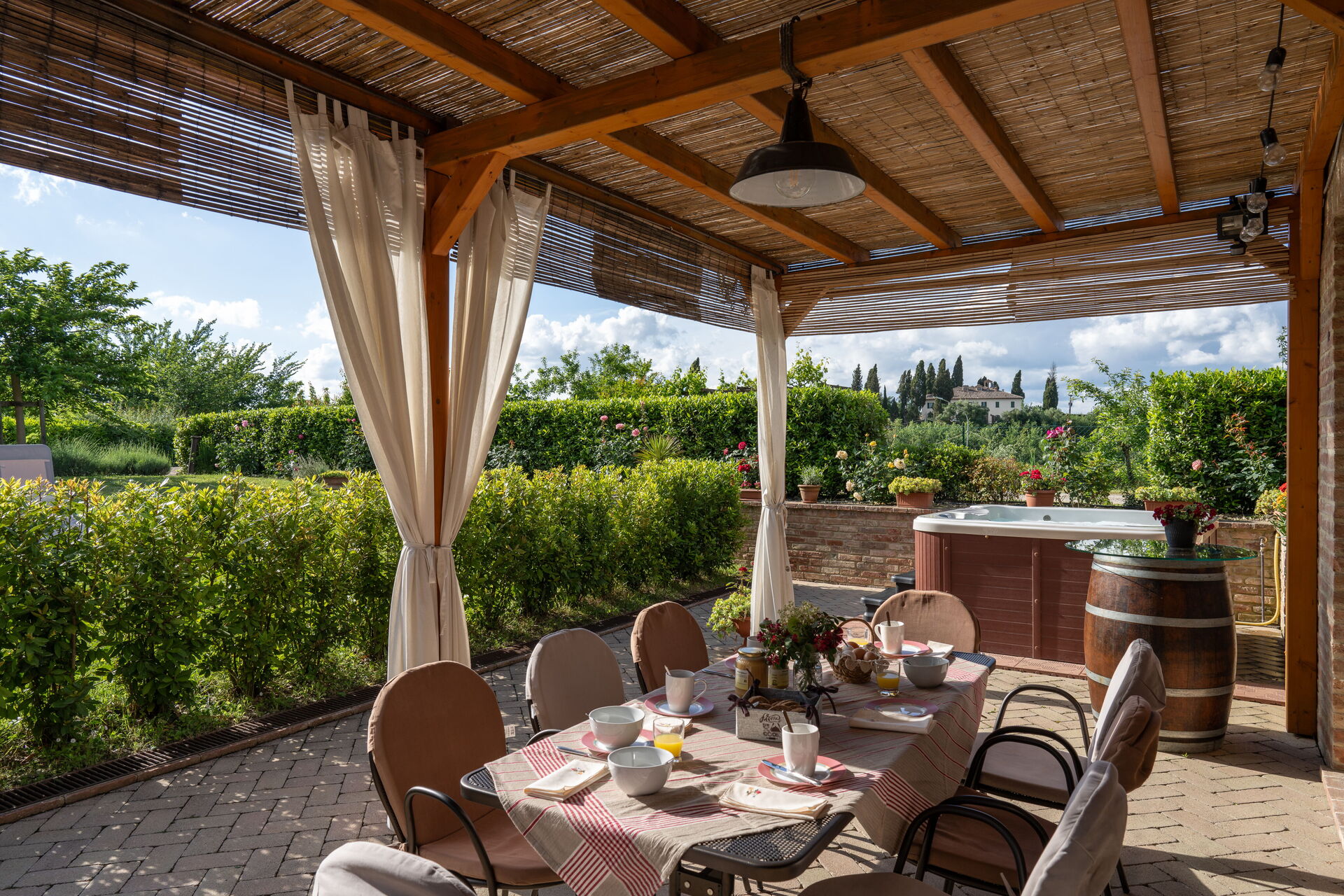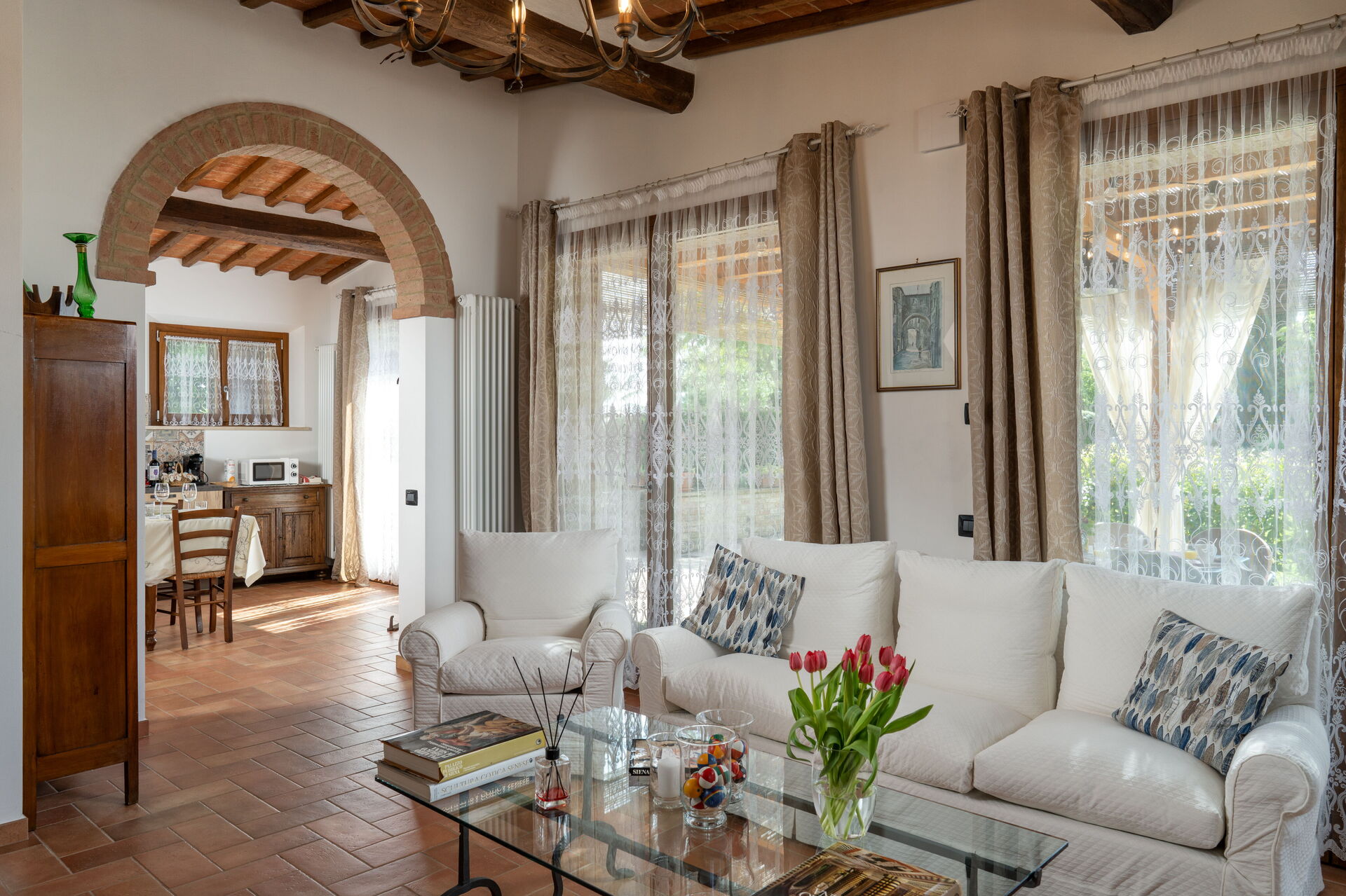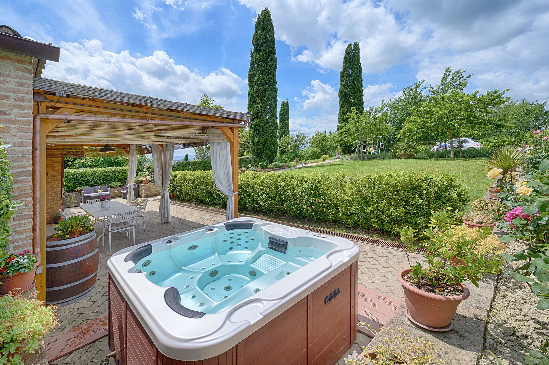 Nach Ankunft werden Sie von dem Besitzer oder Manager begrüßt, der Ihnen die reizende, saubere und gut gepflegte Unterkunft zeigt, mit Blick auf der Hügel erstklassig für einen erholsamen Toskana-Urlaub. Nach einem beschäftigten Tag, den Sie mit Museumsbesuchen verbracht haben, können Sie mit Familie und Freunden ein schönes, kühles Glas Wein genießen - einfach perfekt, um den Tag ganz ausgeruht ausklingen zu lassen. Zu Ihrem Vergnügen gibt es auf dem Gelände eine Veranda, einen Grill and einen Whirlpool. Essen mit Freunden und Familie ist ein großer Bestandteil der toskanischen Kultur. Nutzen Sie die gut ausgestattete Küche, um Mahlzeiten aus lokalen Produkten vorzubereiten, während Sie im Urlaub sind. Die Küche kommt mit Kaffeemaschine, Toaster, Herd und Kühlschrank, sowie ausreichend Geschirr und Besteck für bis zu acht Personen. Speisen Sie 'al Fresco' wie ein echter Toskaner - die komplett eingerichtete Veranda ist eine erstklassige Kulisse, um das Essen, die Familie und das schöne toskanische Wetter zu genießen.