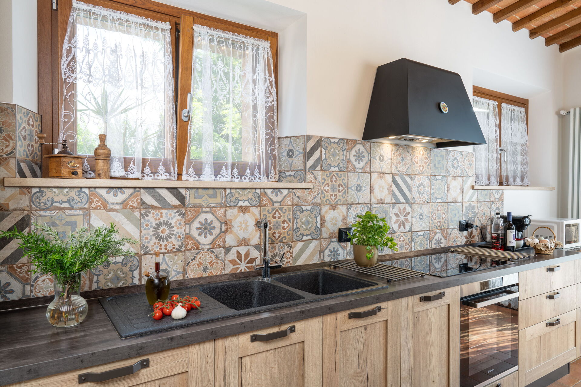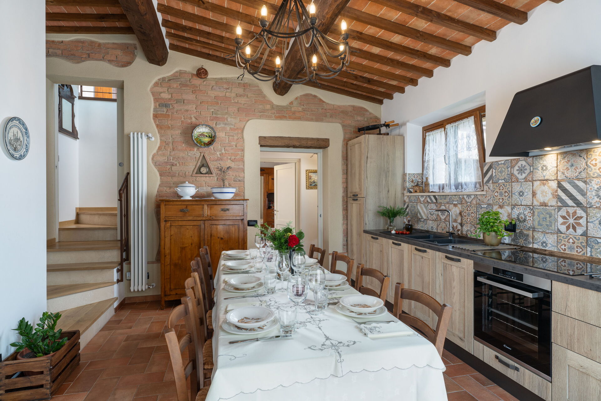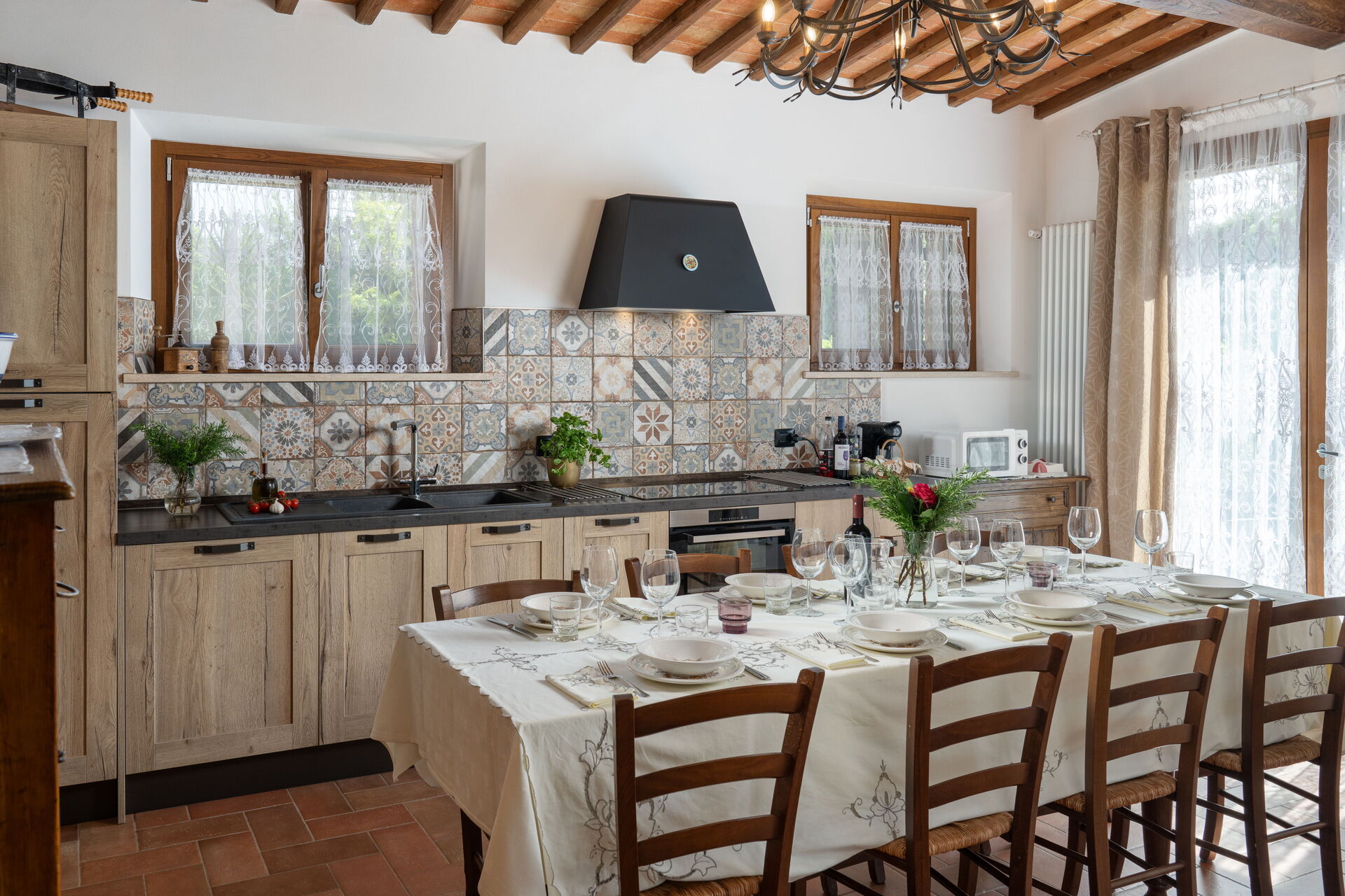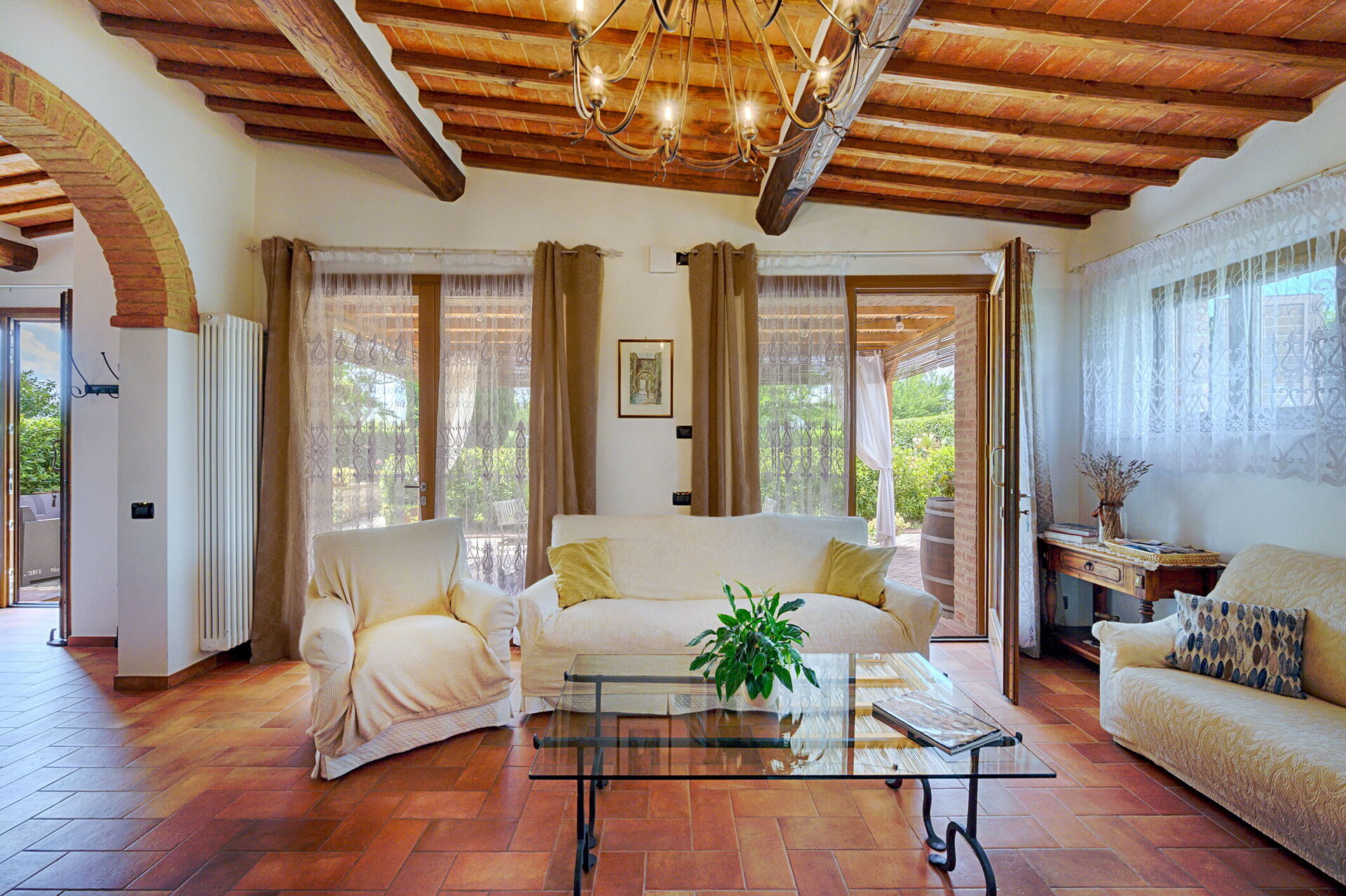 Wohnküche: gut ausgestattete Küche, Esstisch (Personen: 8), Spülmaschine, Kühlschrank, Tiefkühler, Mikrowelle, Ofen, Toaster, Bügeleisen, Italienische Kaffeemaschine, Waschmaschine, Sofa, WiFi Internet, Klimaanlage, behindertengerecht, Rauchmelder, CO2 Detektor, Ausgang auf den Garten, Ausgang auf die Veranda.