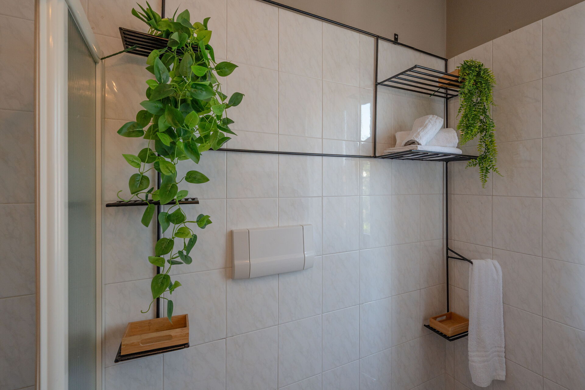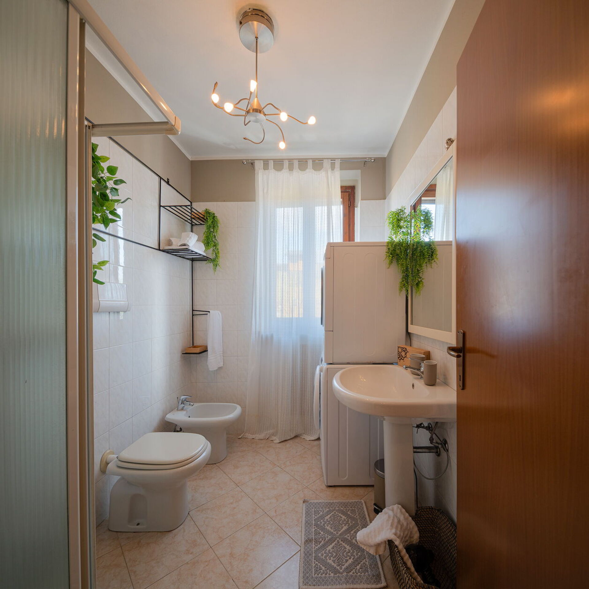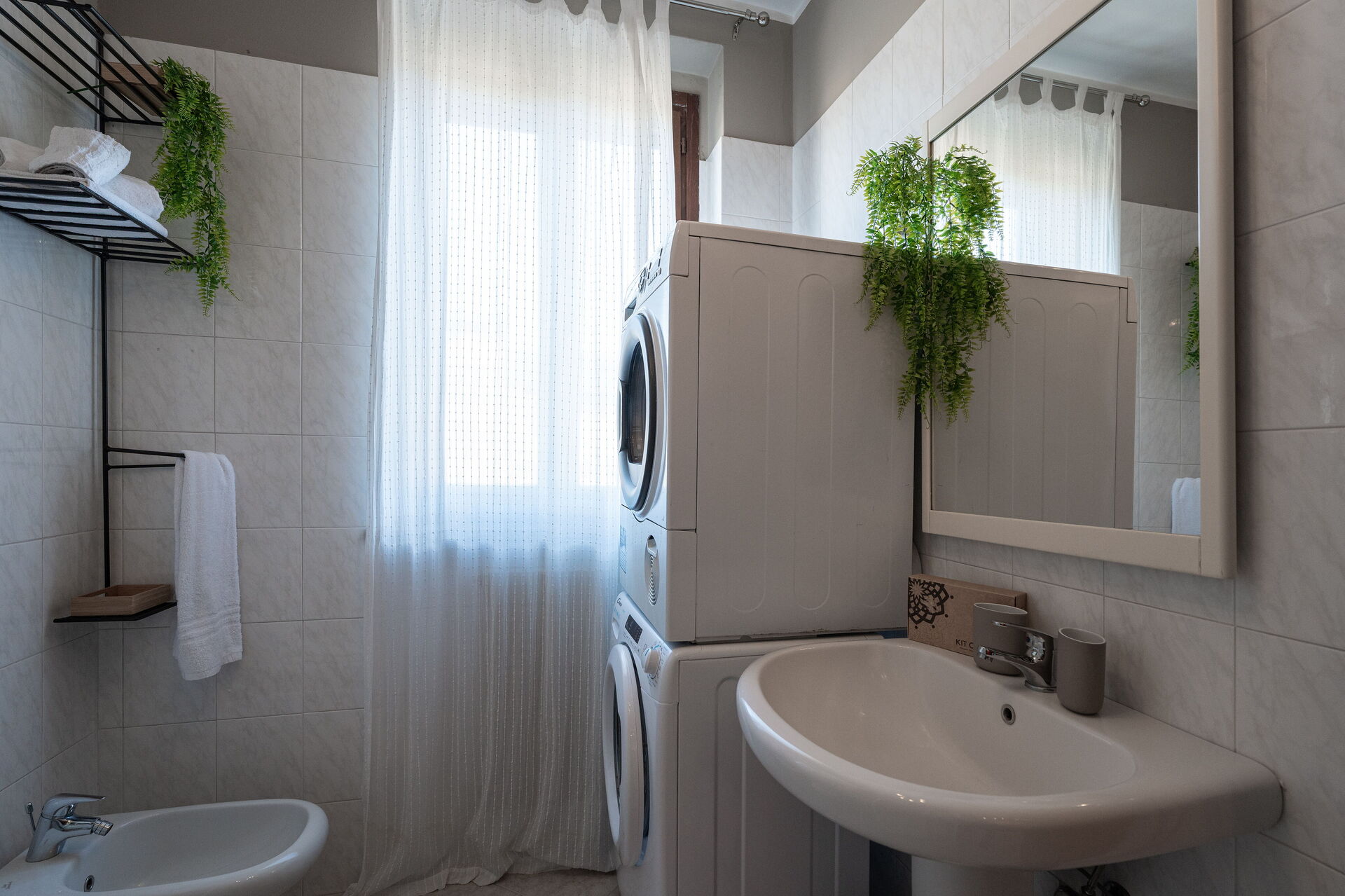 Badezimmer: Waschbecken, WC, Bidet, Dusche, Fön, Trockner, Waschmaschine.