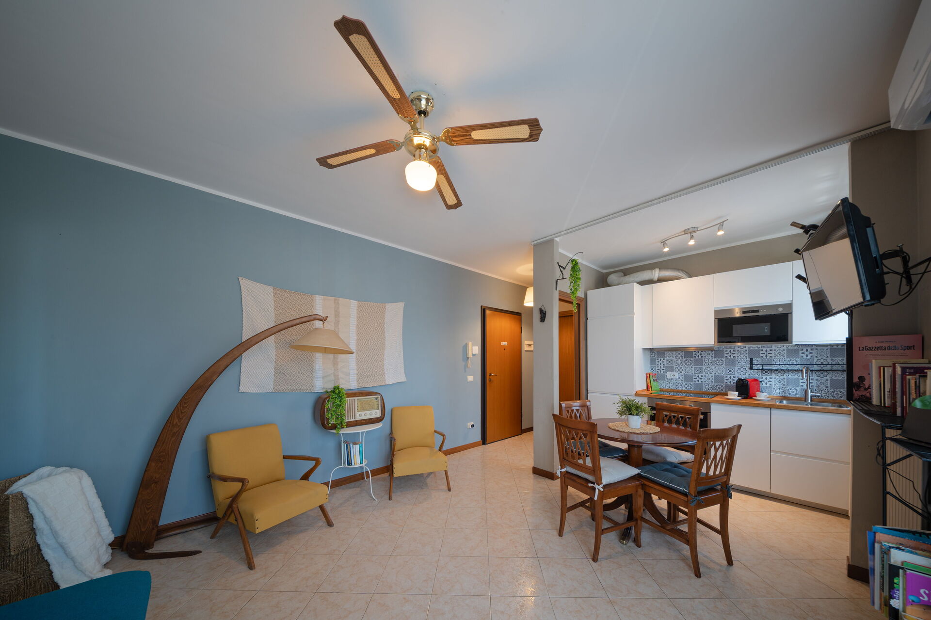 Wohnküche: gut ausgestattete Küche, Esstisch, Kühlschrank, Tiefkühler, Mikrowelle, Herd, Ofen, Italienische Kaffeemaschine, Sofa bed, WiFi Internet, Klimaanlage, Satelliten-TV, Ausgang auf den Balkon.