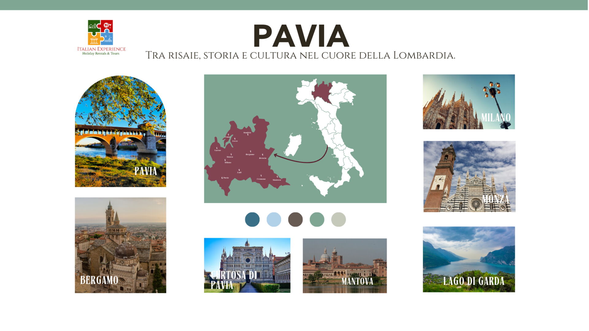 Andere wichtige Touristen-Reiseziele, die es sich lohnt zu besuchen, wären: Florenz 292 km, Viareggio 255 km, Forte Dei Marmi 243 km, Rom 574 km, Venedig 311 km und Mailand 41 km.