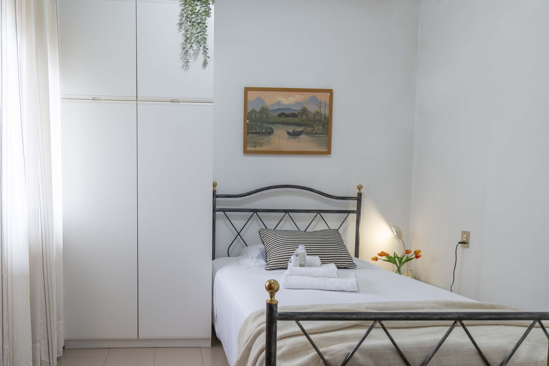 Schlafzimmer 1: Einzelbett, Klimaanlage, Sessel.