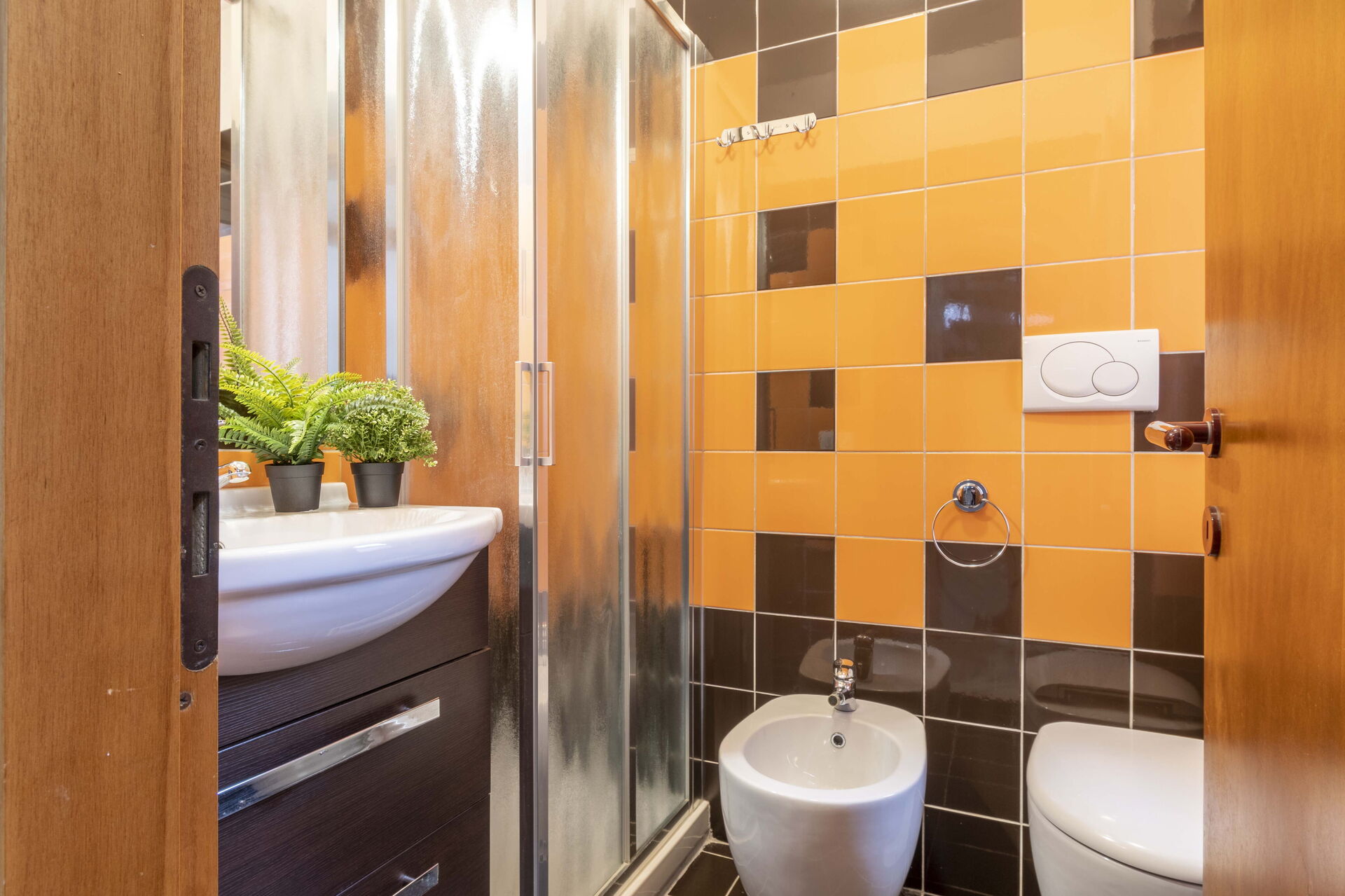 Badezimmer: Waschbecken, WC, Bidet, Dusche, Fön.