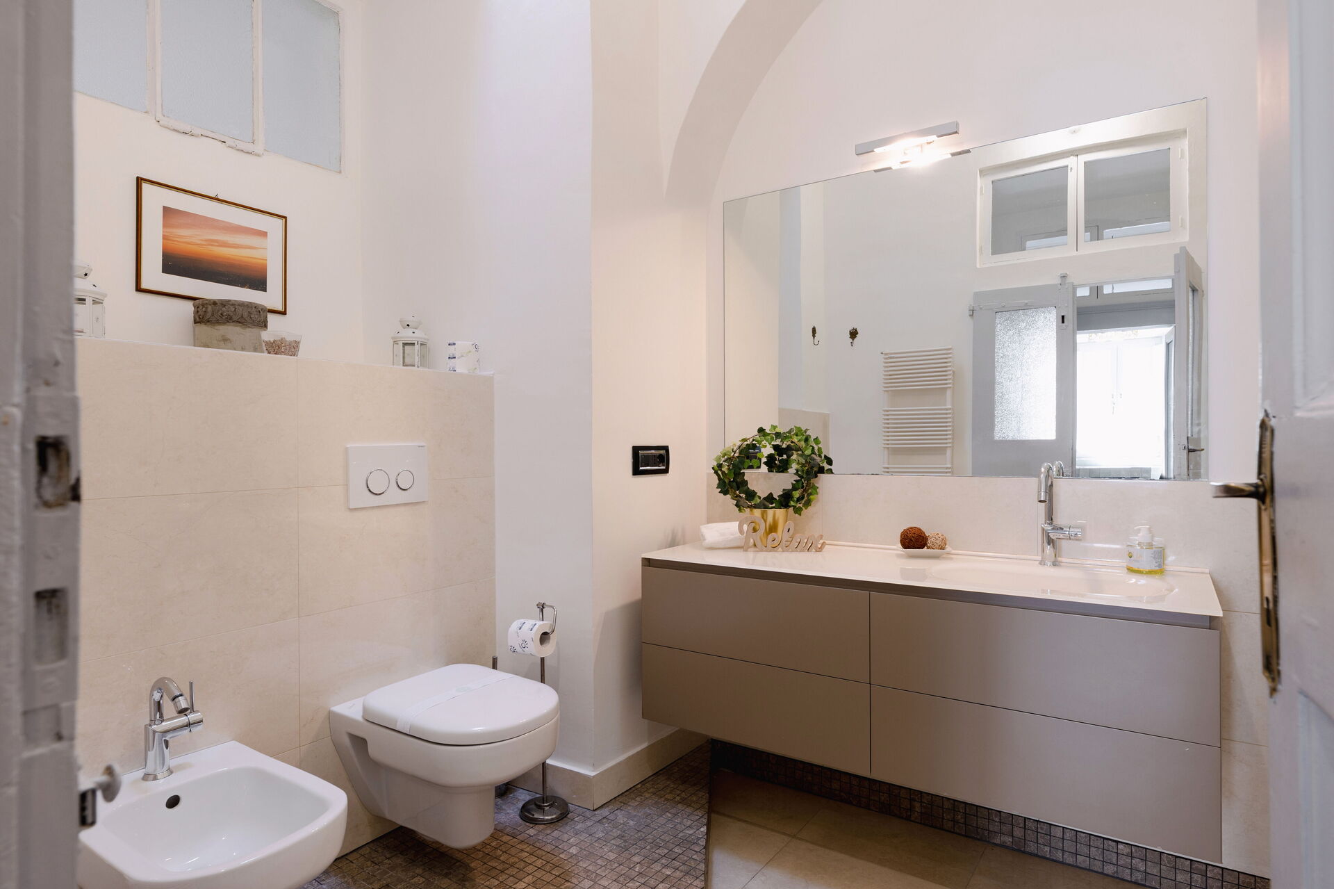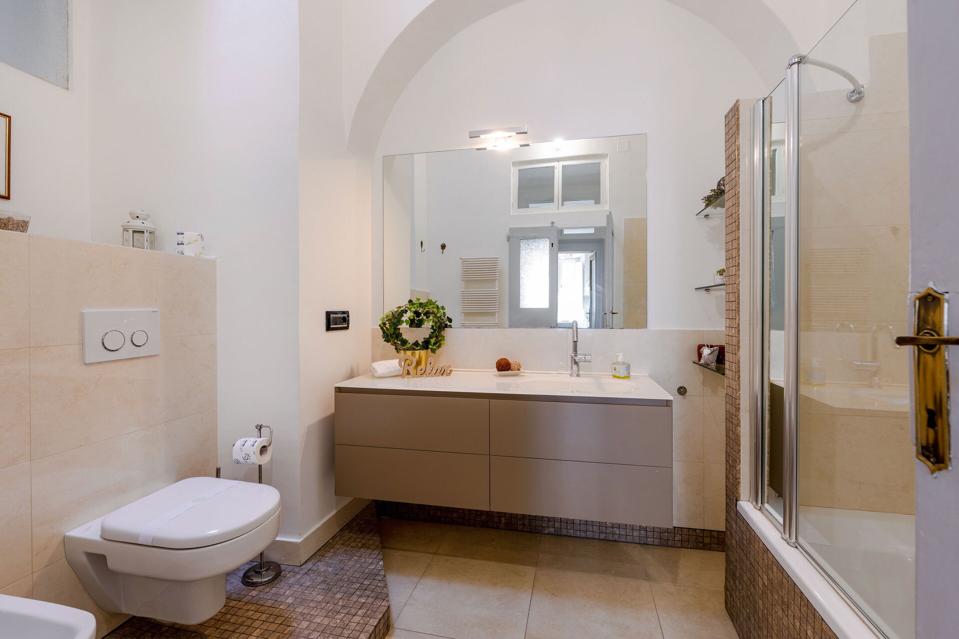Badezimmer: Waschbecken, WC, Bidet, Dusche, Fön.
