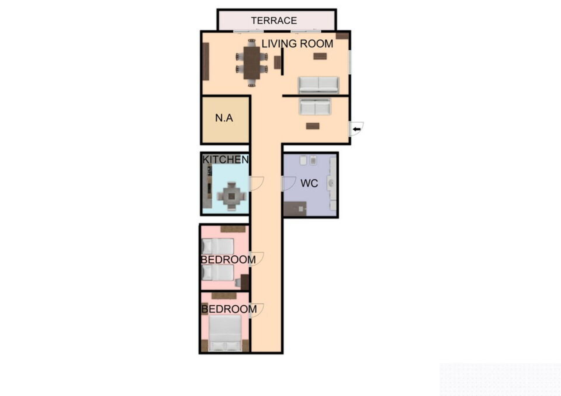 Mit Küche, Wohnzimmer, 2 Schlafzimmer, Badezimmer.