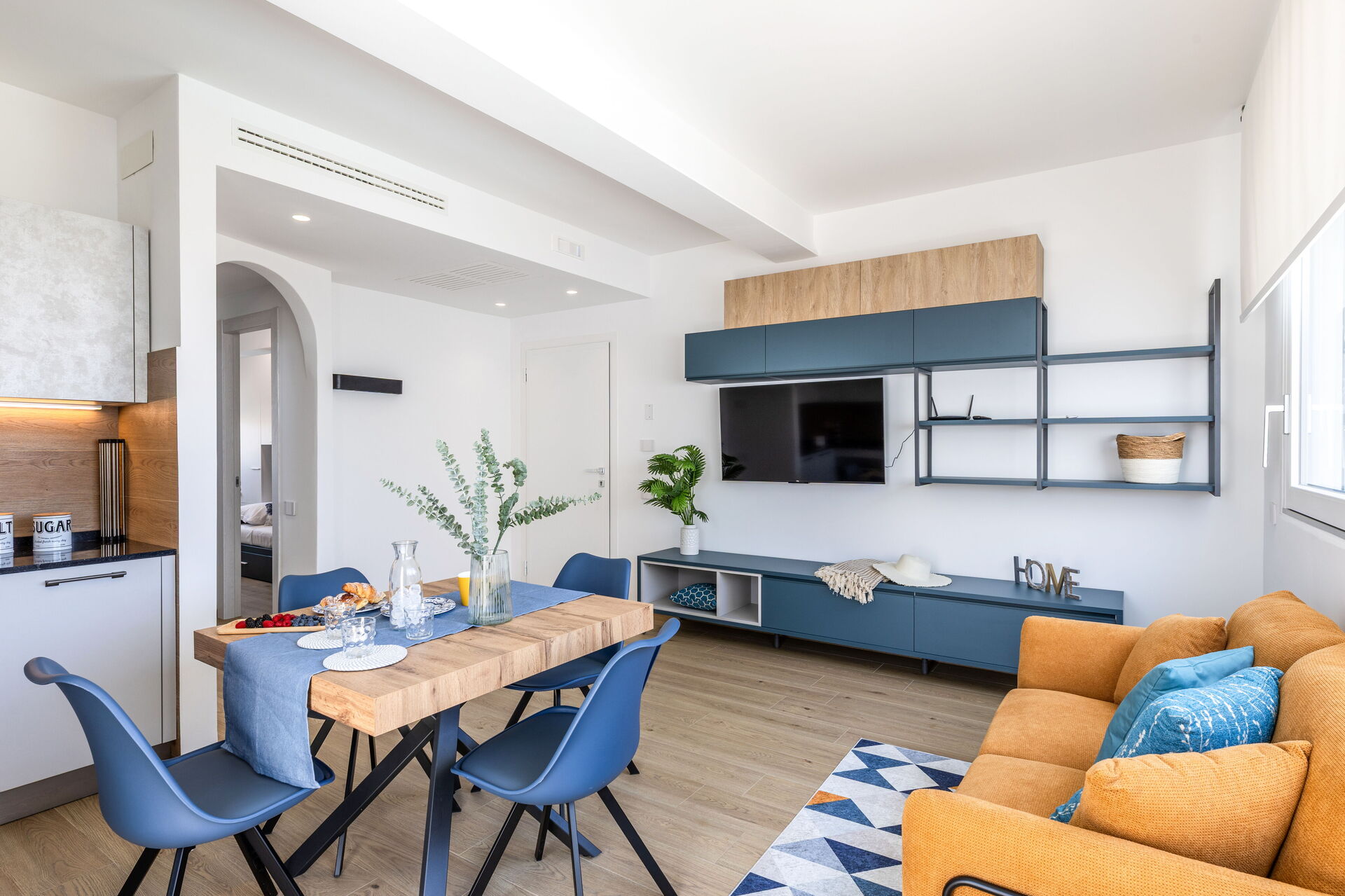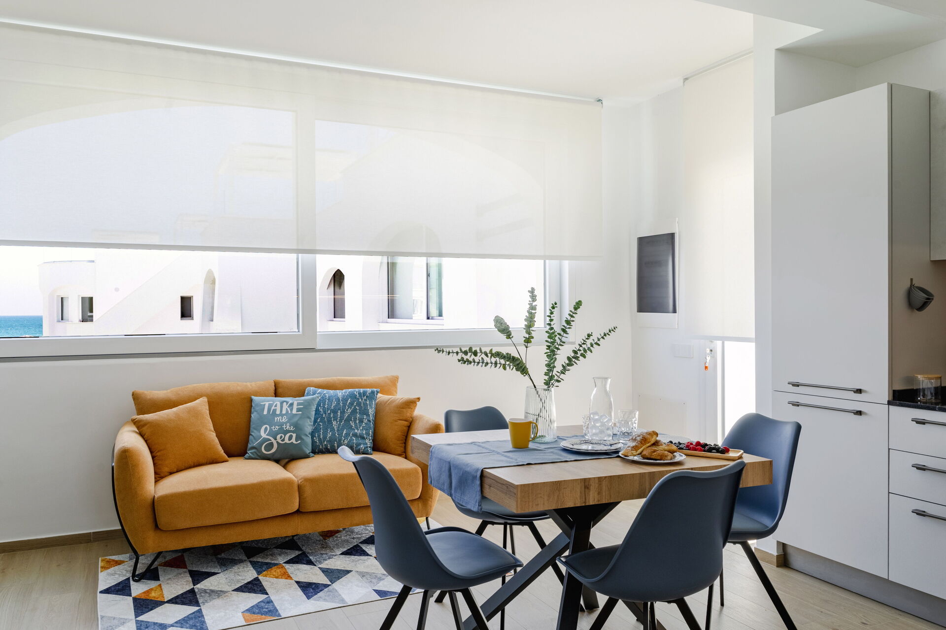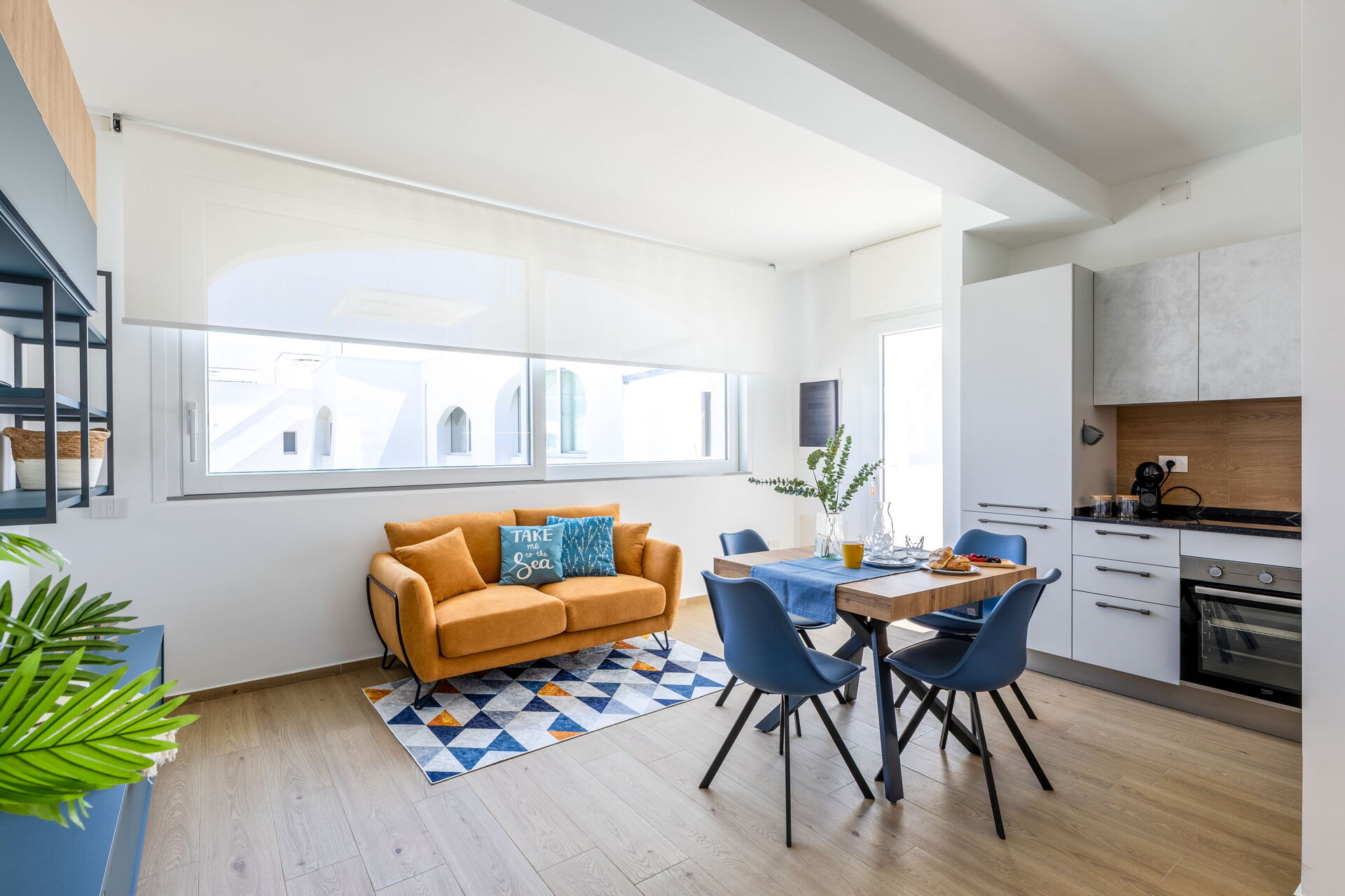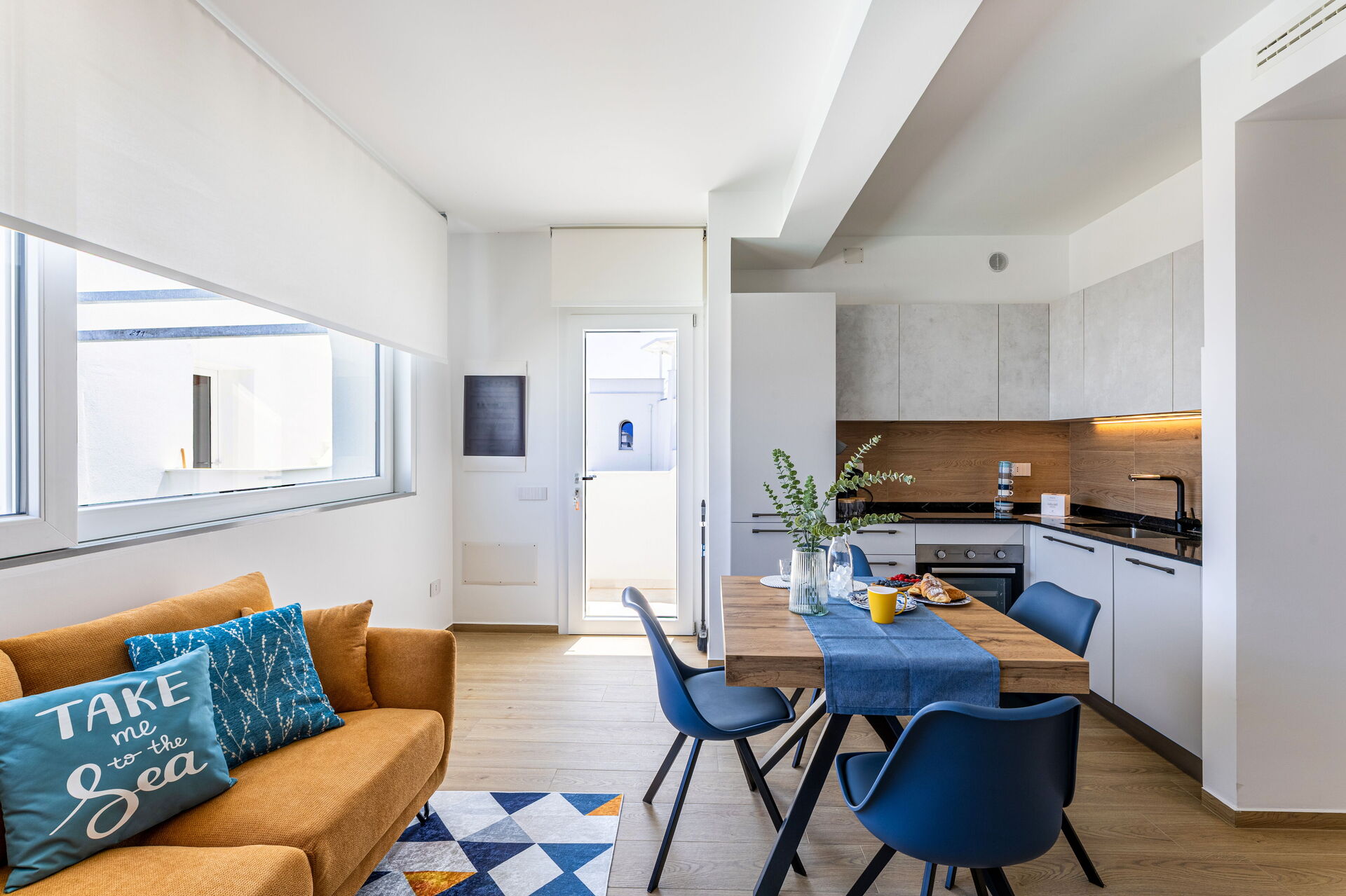 Wohnküche: gut ausgestattete Küche, Esstisch, Spülmaschine, Kühlschrank, Tiefkühler, Herd, Ofen, Toaster, Sofa, WiFi Internet, Internet, Klimaanlage, TV, Rauchmelder, CO2 Detektor, Ausgang auf die Terrasse.
