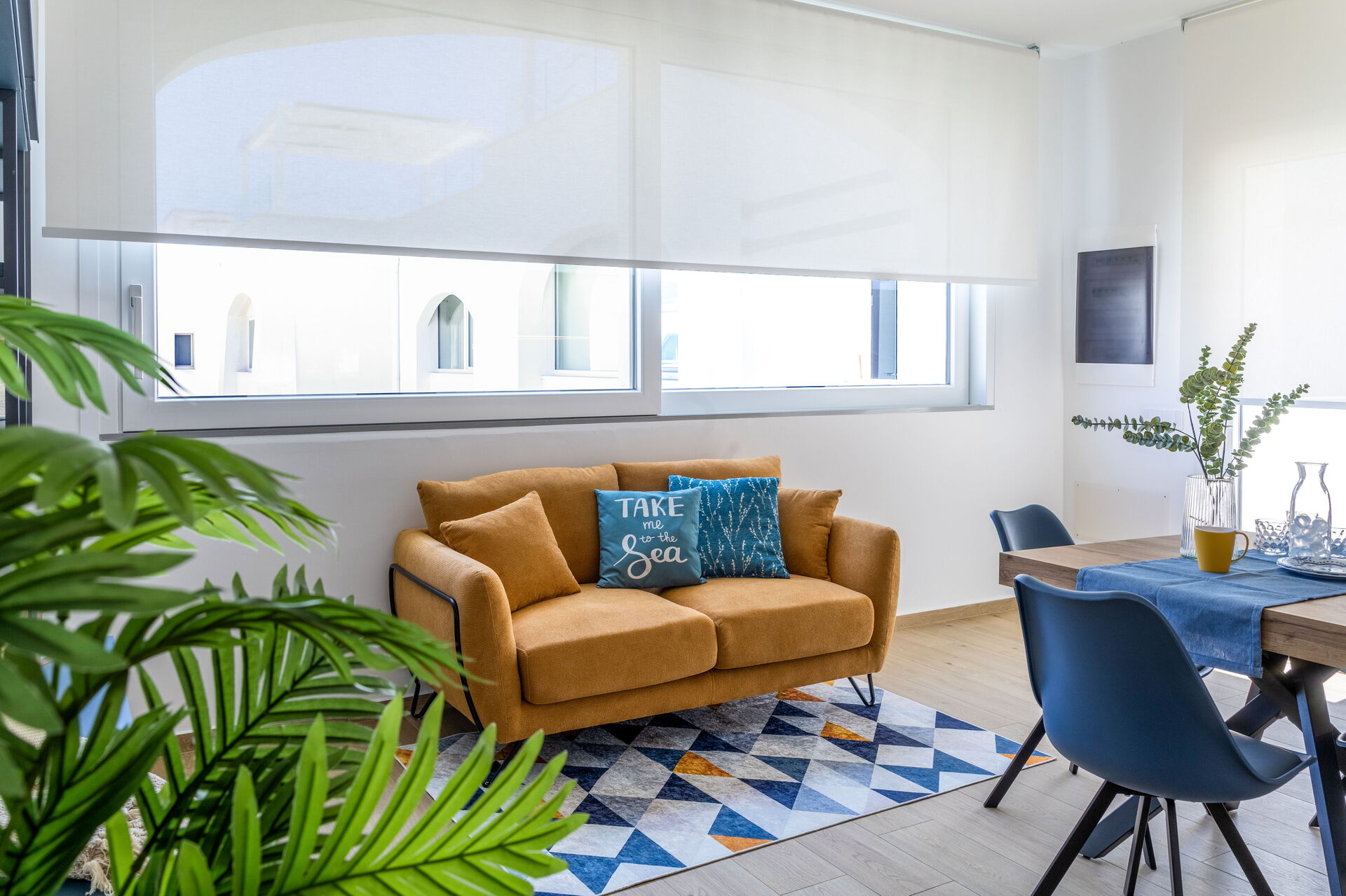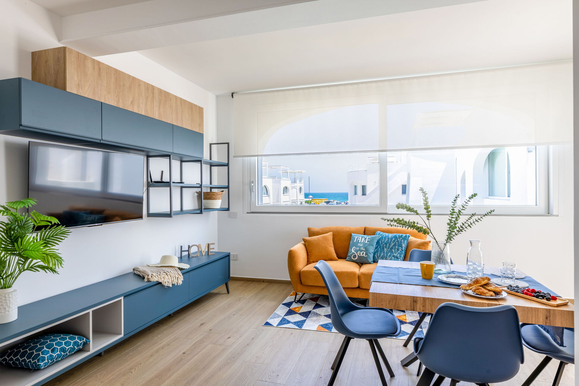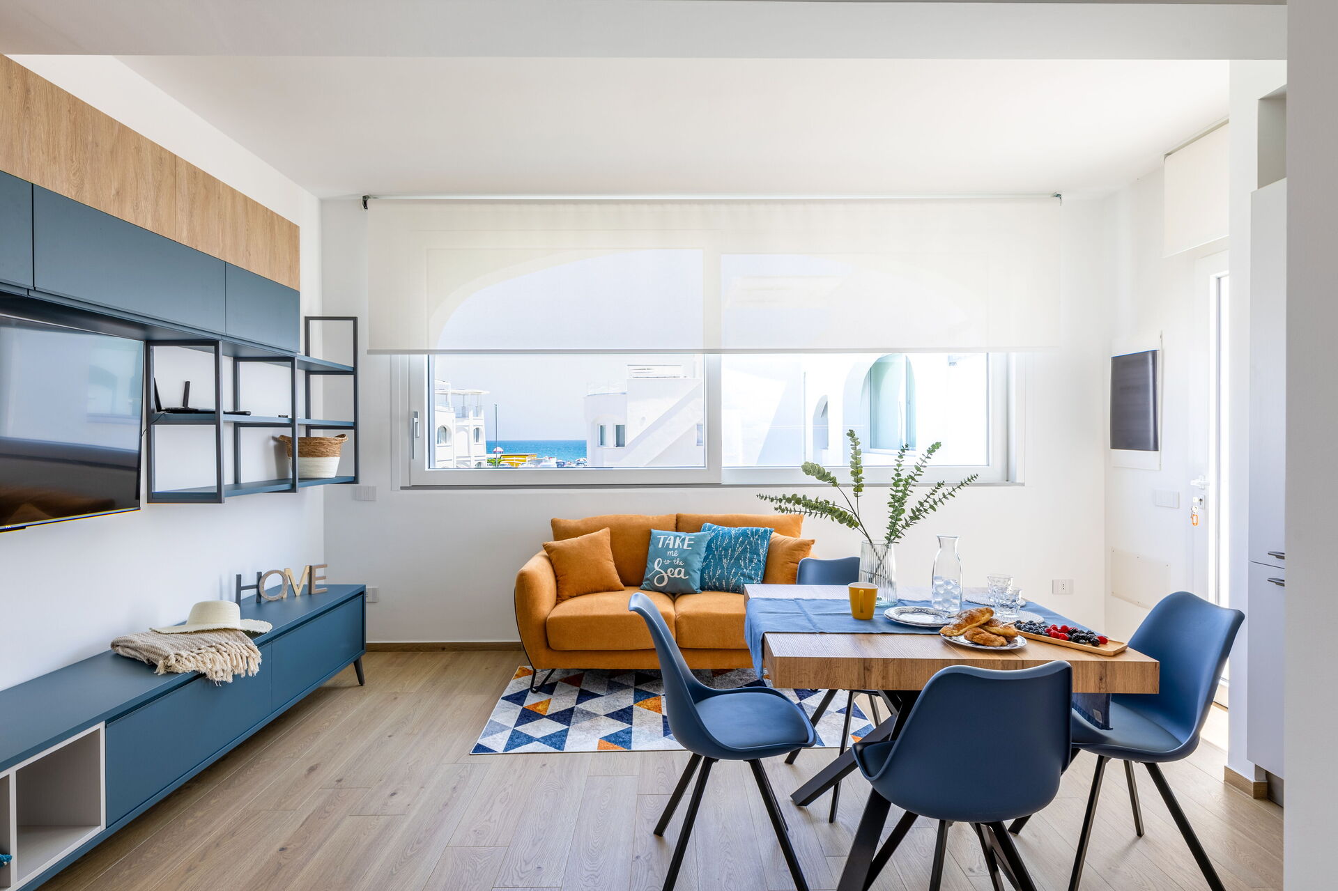 Wohnküche: gut ausgestattete Küche, Esstisch, Spülmaschine, Kühlschrank, Tiefkühler, Herd, Ofen, Toaster, Sofa, WiFi Internet, Internet, Klimaanlage, TV, Rauchmelder, CO2 Detektor, Ausgang auf die Terrasse.