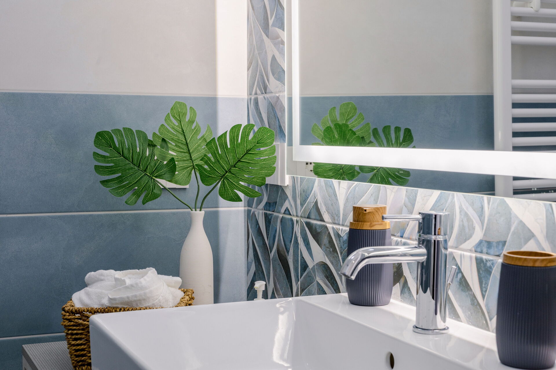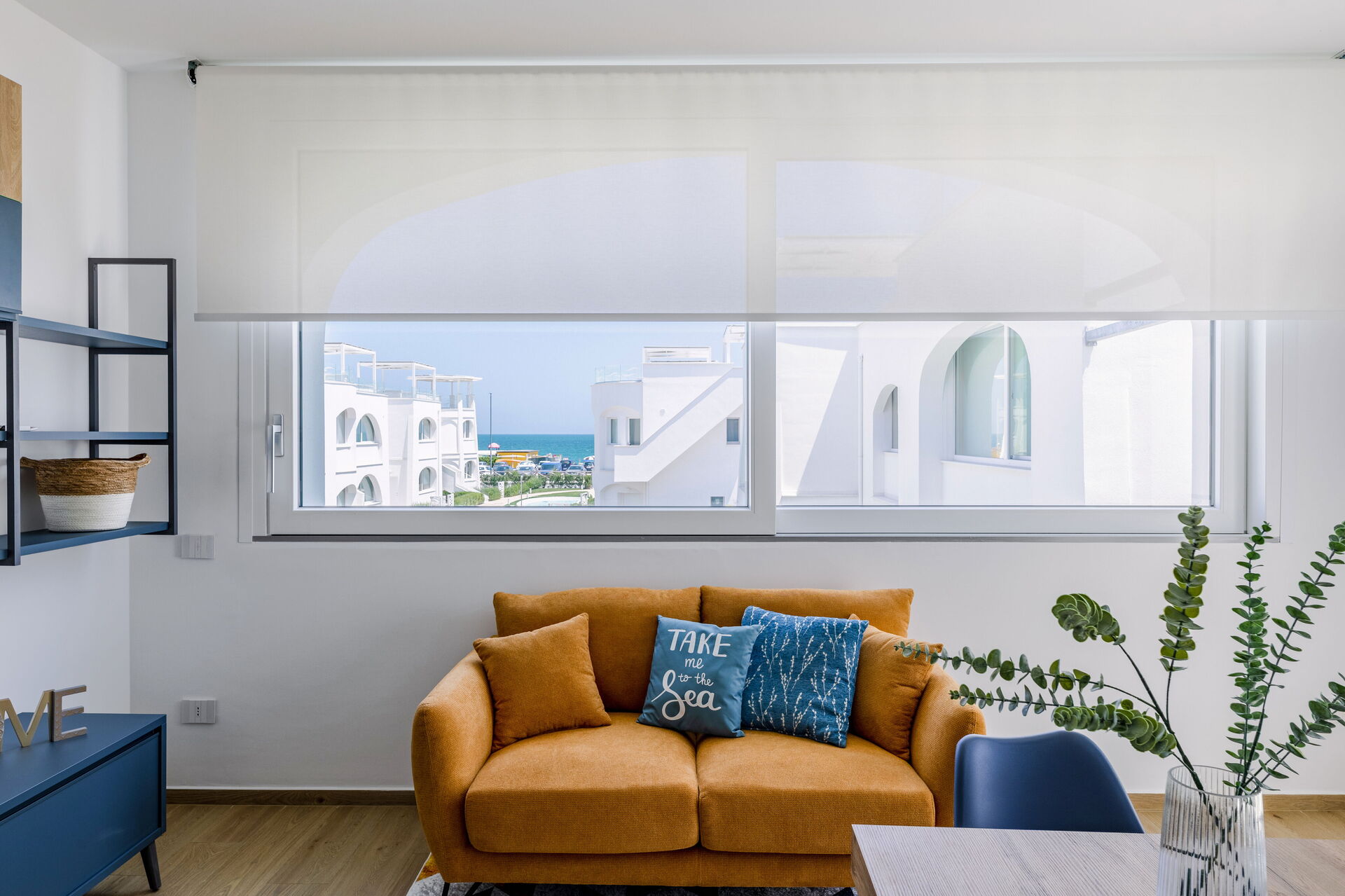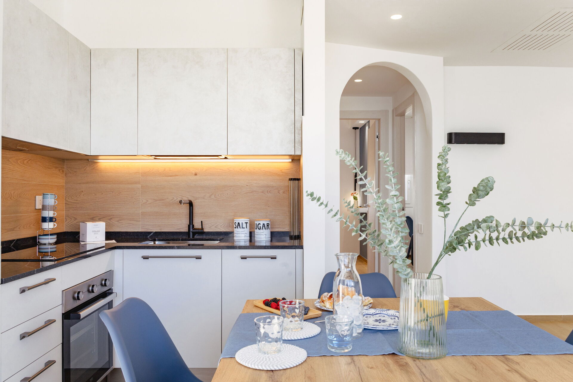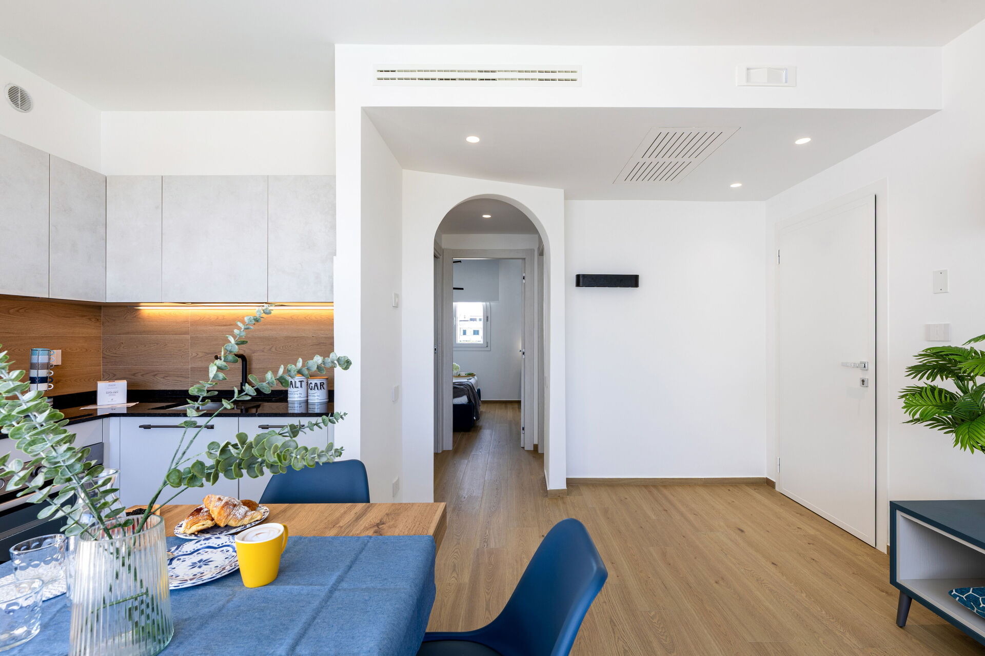 Wohnküche: gut ausgestattete Küche, Esstisch, Spülmaschine, Kühlschrank, Tiefkühler, Herd, Ofen, Toaster, Sofa, WiFi Internet, Internet, Klimaanlage, TV, Rauchmelder, CO2 Detektor, Ausgang auf die Terrasse.